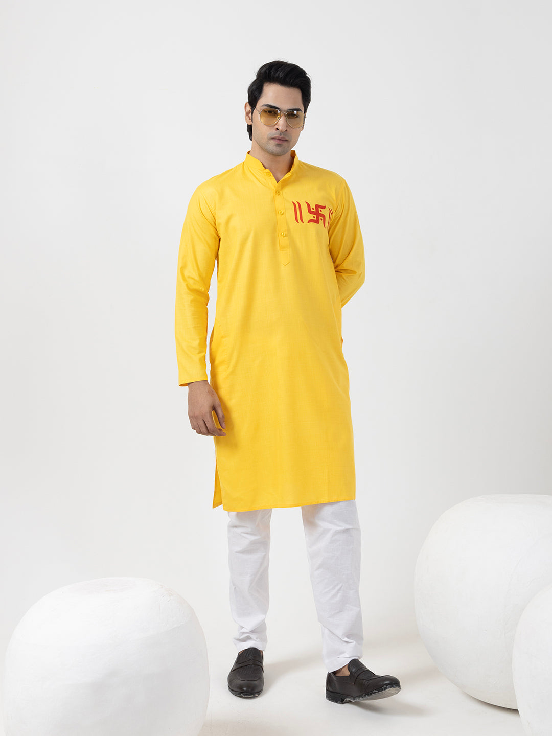 Product Description "Elevate your ethnic style with this yellow cotton kurta and white pyjama set....