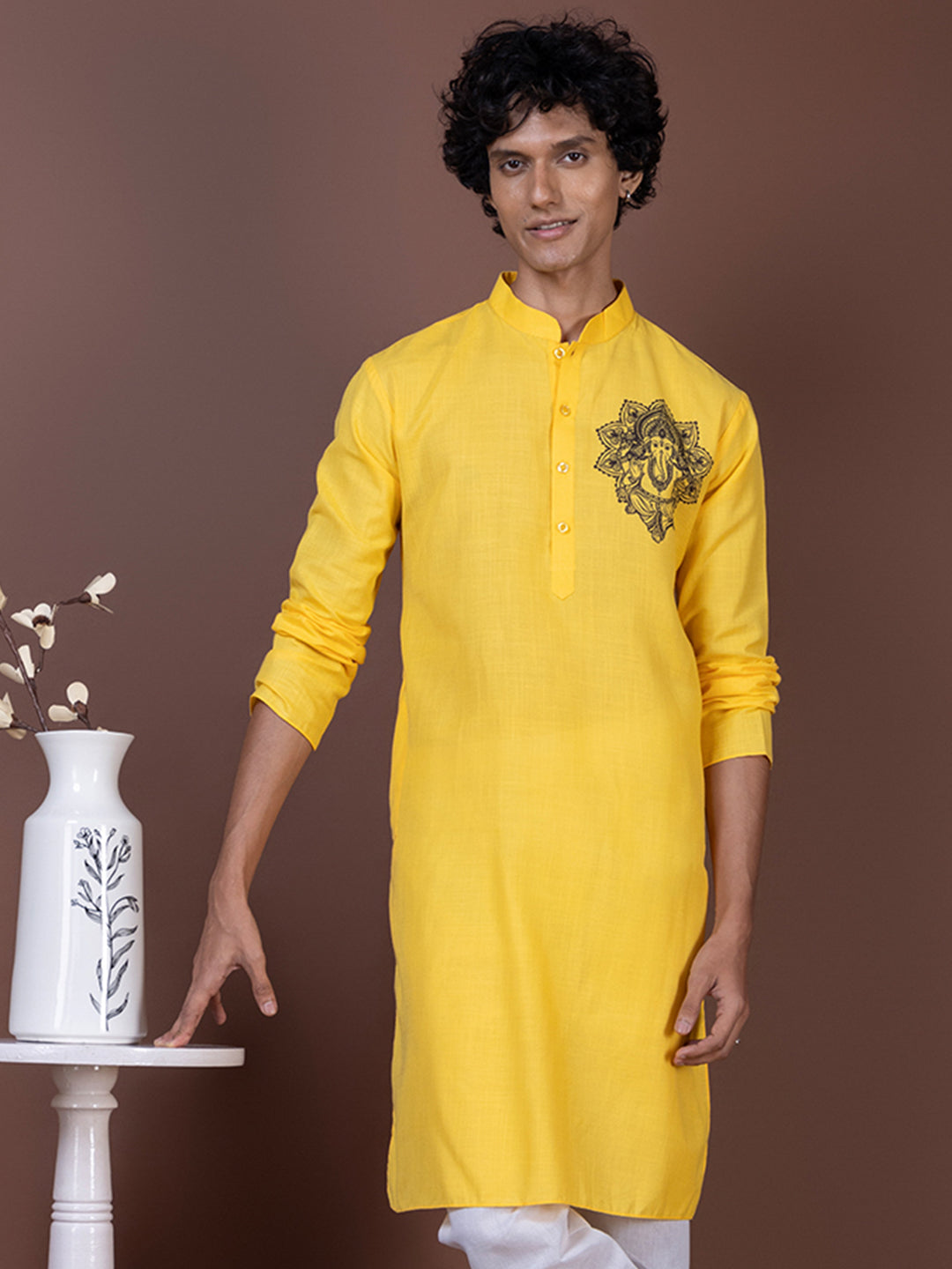 Product Description Elevate your style quotient with this yellow embellished kurta, designed for modern elegance...