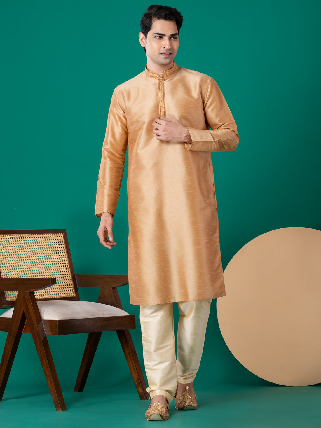 Product Description Elevate your ethnic style with this Gold Dupion Silk Kurta and Beige pyjama...