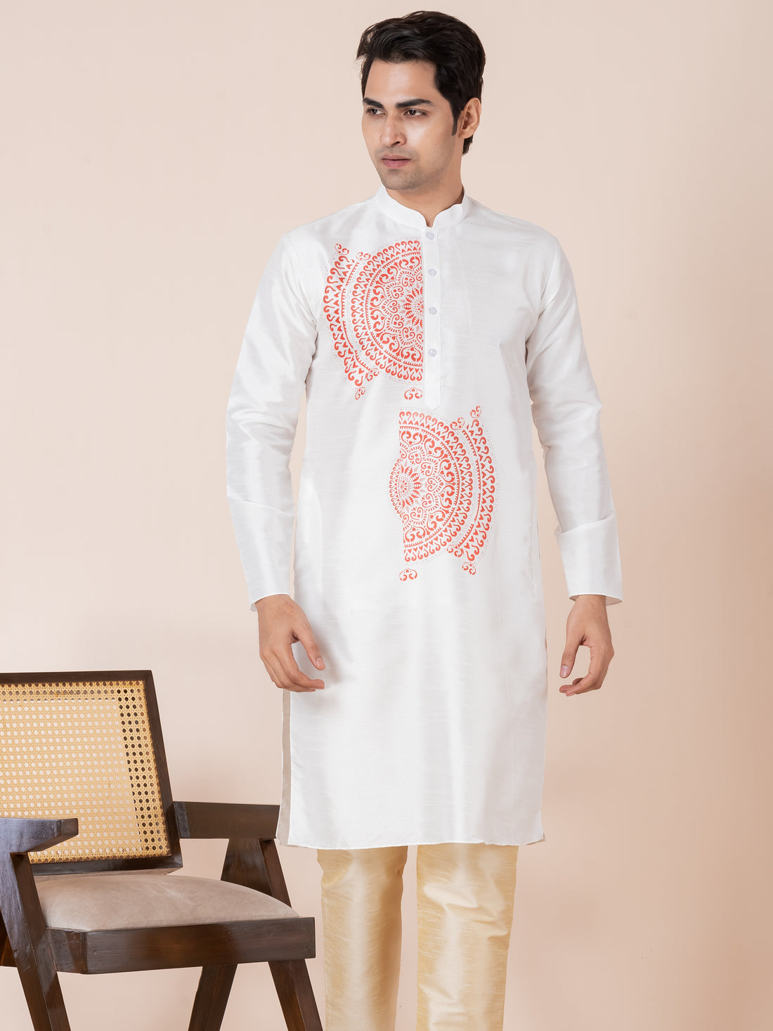 Men’s White Dupion Silk Kurta Pyjama with Ethnic Print