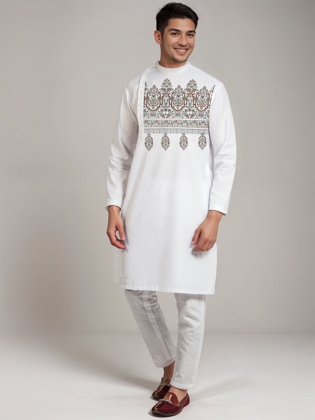 Product Description "Elevate your ethnic style with this Multi cotton kurta and white pyjama set....