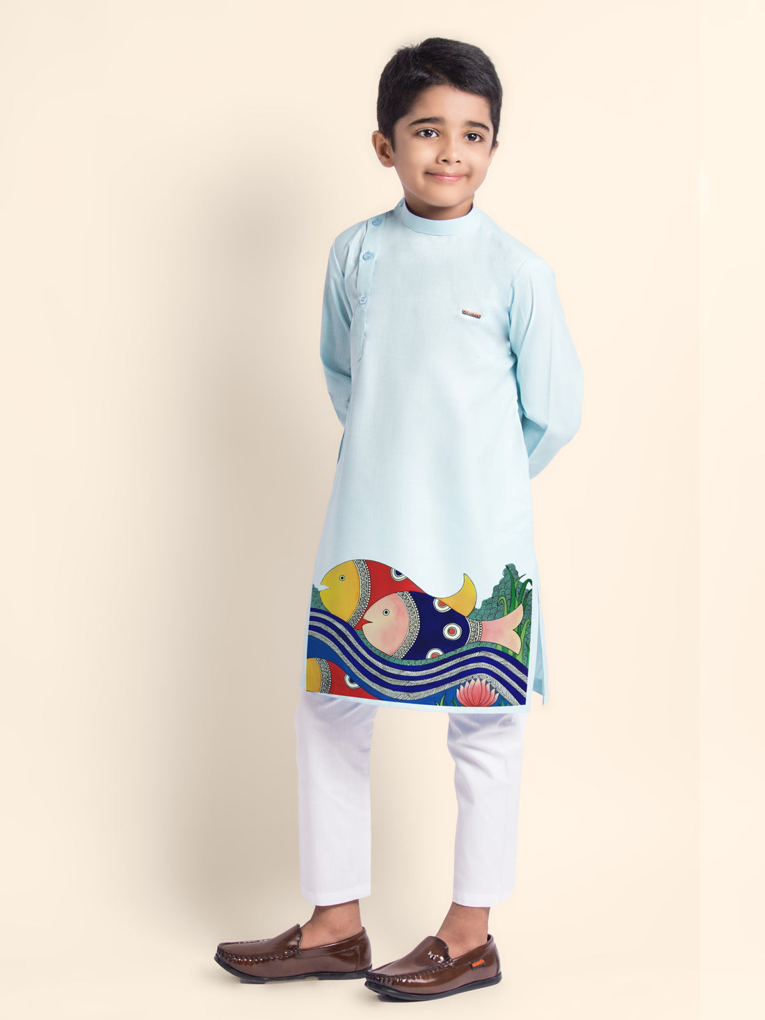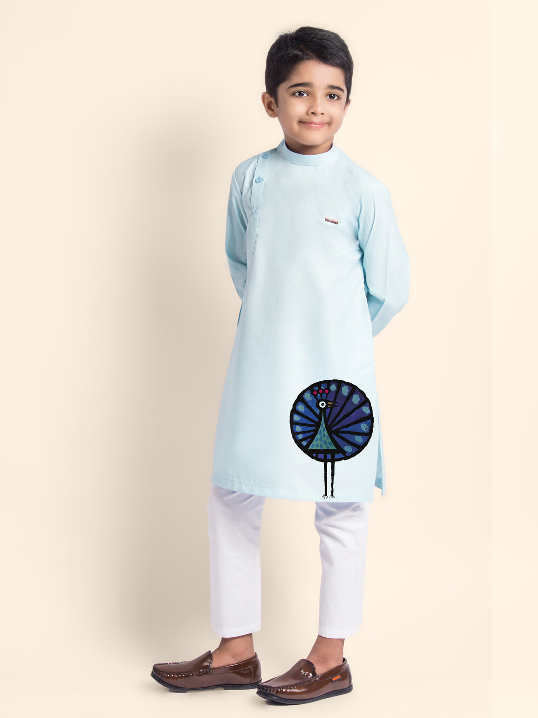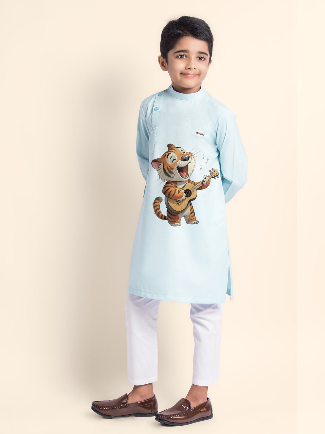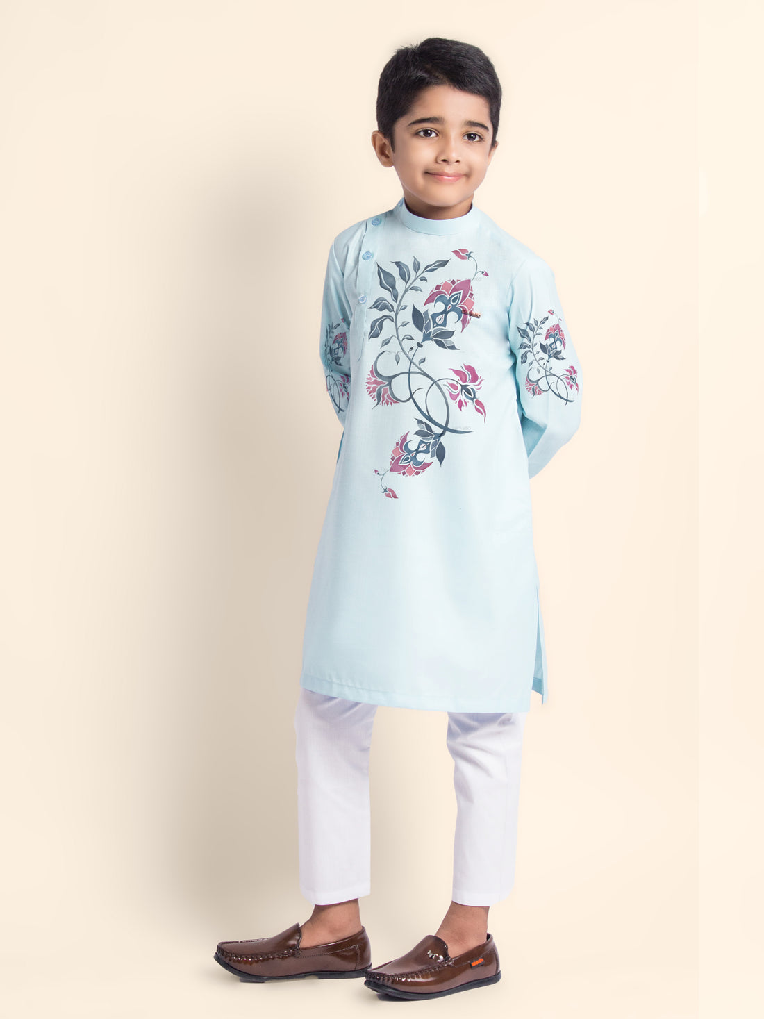 Boys Sky Blue Printed Kurta With Pyjama Set