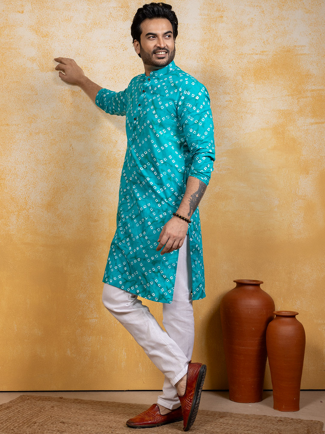 Product Description Elevate your ethnic style with this elegant Turquoise Blue Cotton kurta set. Designed...