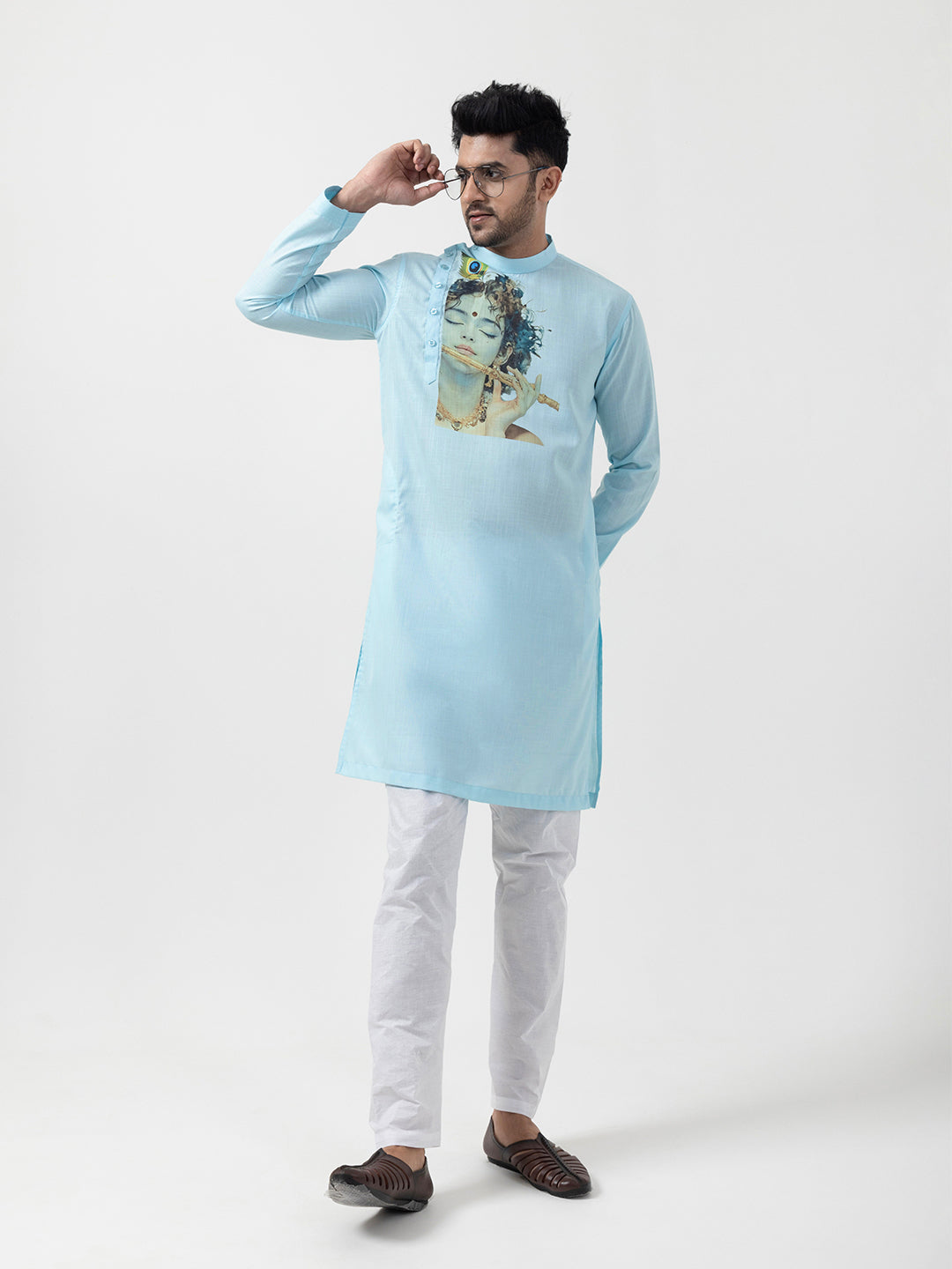 Product Description Elevate your ethnic style with this elegant Sky Blue Cotton kurta set. Designed...