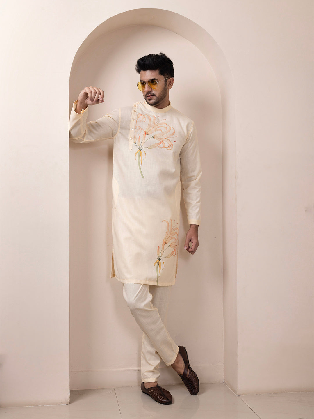 Mens Beige Side Placket Printed Kurta With Pyjama Set