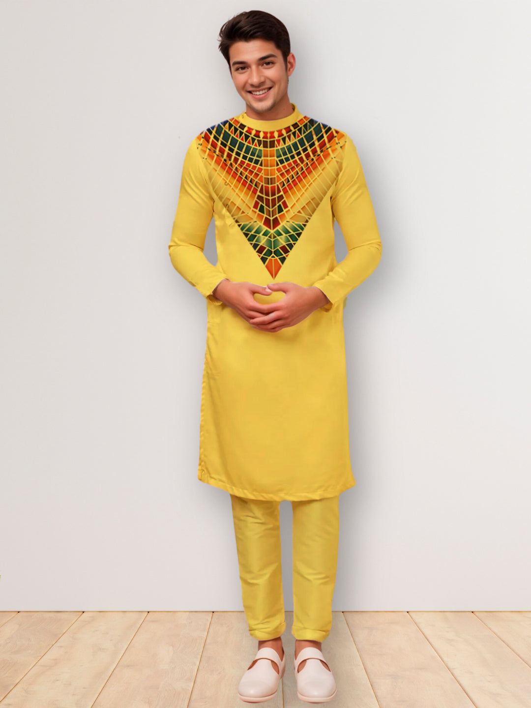 Mens Mustard Side Placket Printed Kurta-Pyjama Set