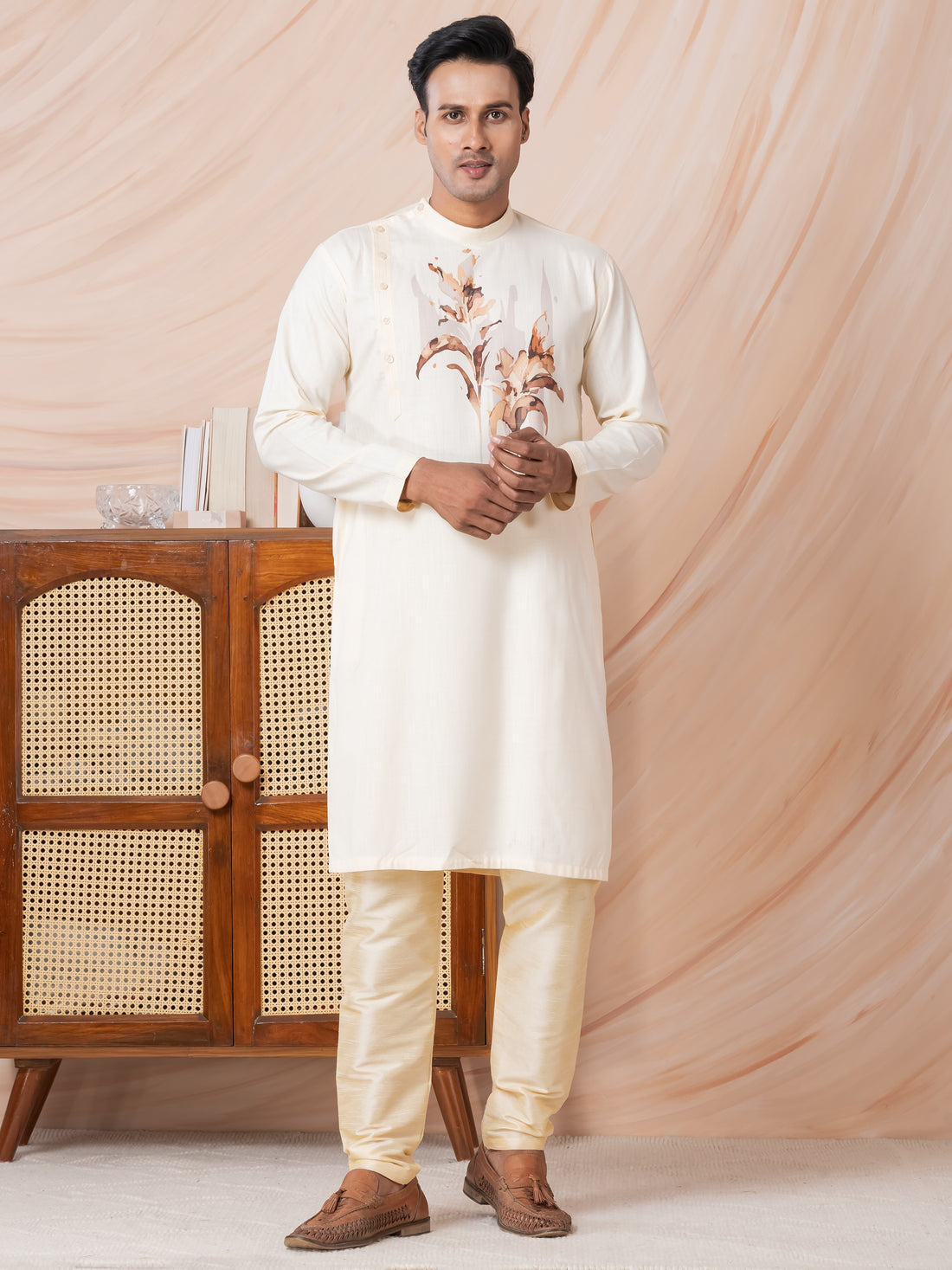 Mens Beige Side Placket Printed Kurta With Pyjama Set