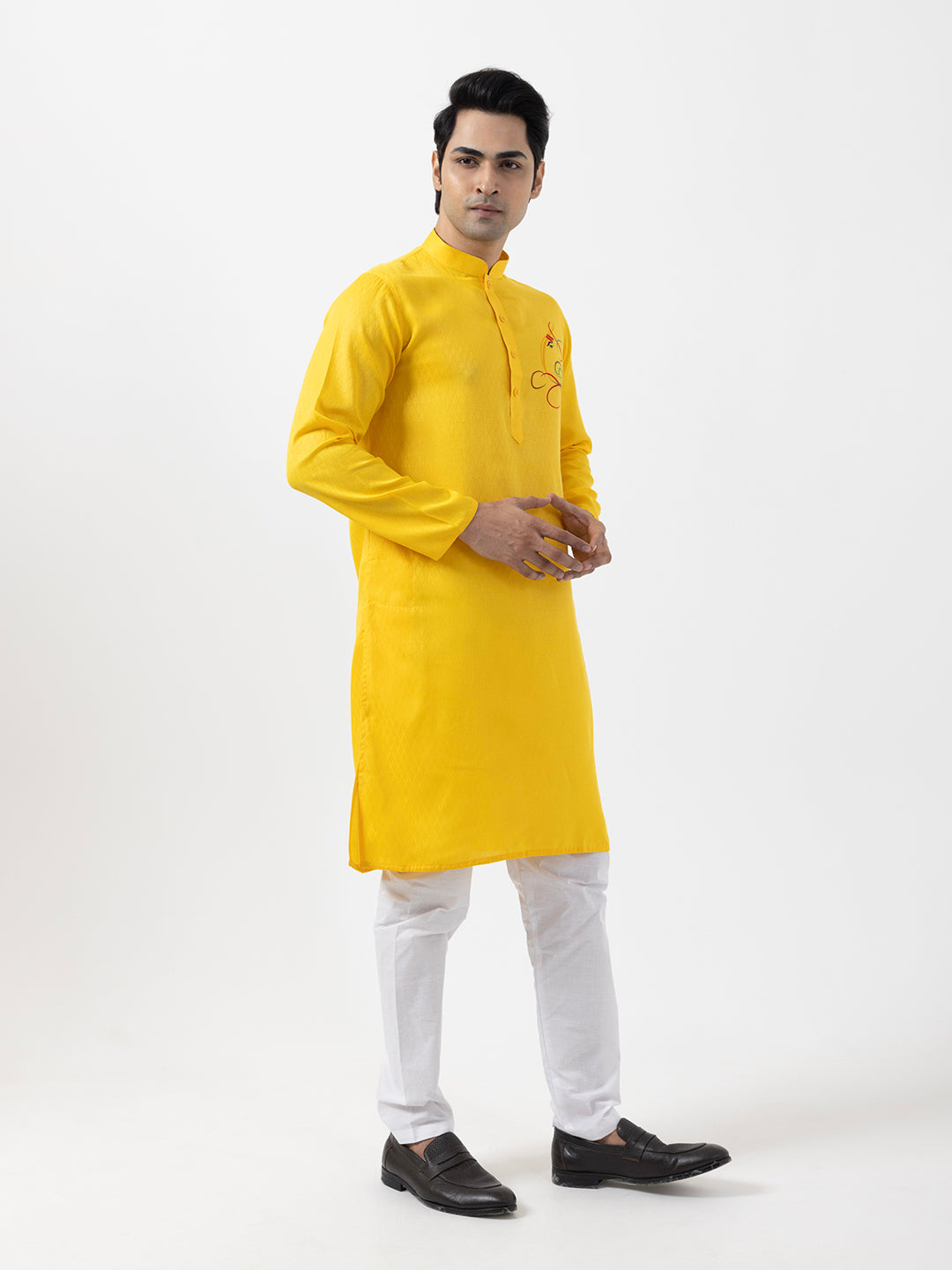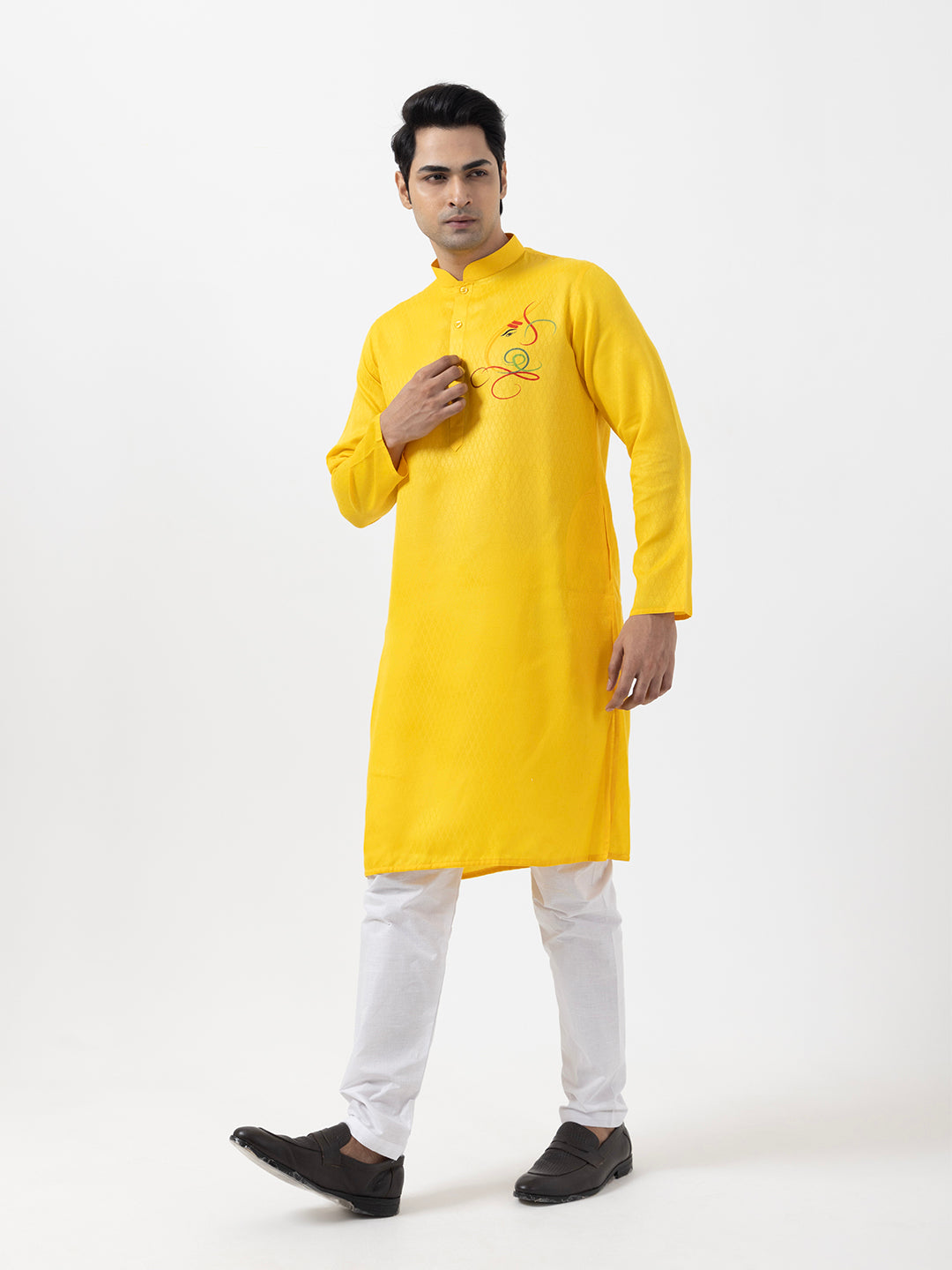 Pair this yellow kurta with white churidar or slim-fit trousers for a timeless ethnic look. Complete the outfit with leather loafers or traditional juttis to make a bold style statement.