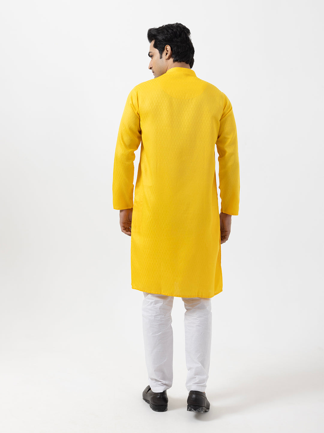 "Elevate your ethnic style with this yellow cotton kurta and white pyjama set. Designed for comfort and elegance, it features a subtle print and a mandarin collar, perfect for festive and cultural occasions."