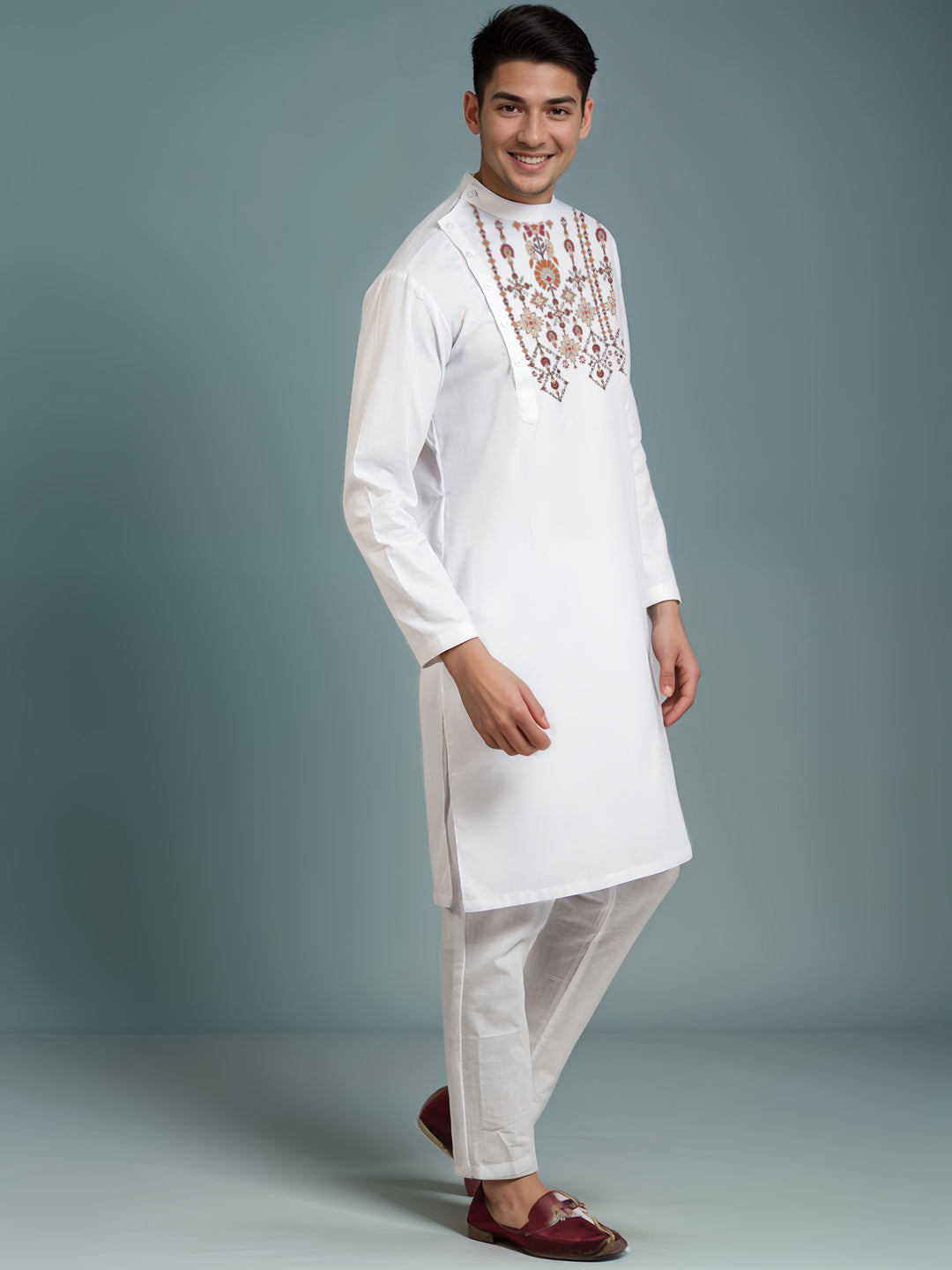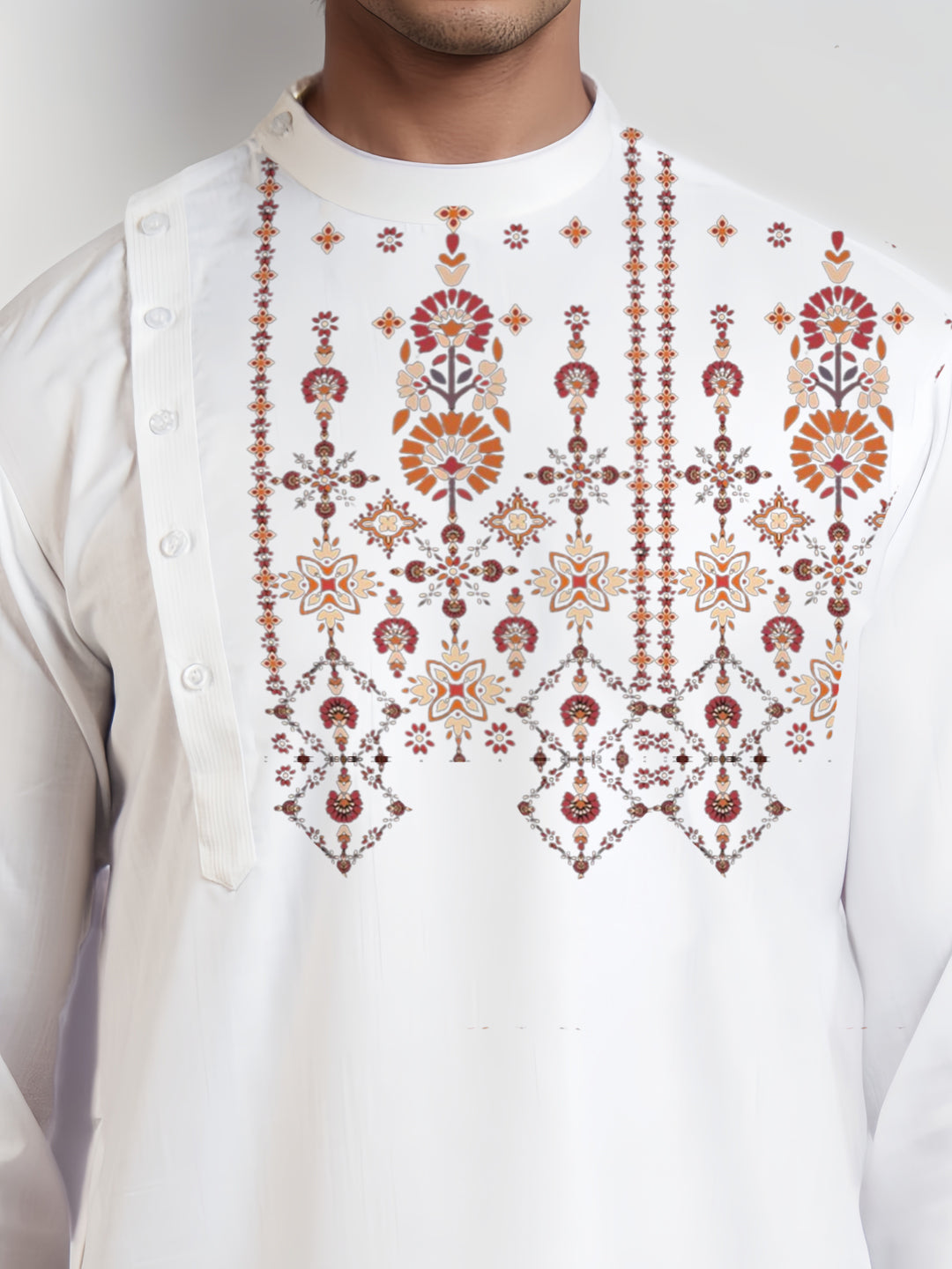 Exude elegance and tradition with this White Cotton Kurta With Pyjama Set, featuring an exquisite ethnic motif print that enhances its regal appeal. Designed for comfort and style, this kurta is perfect for festive occasions, weddings, and cultural celebrations.