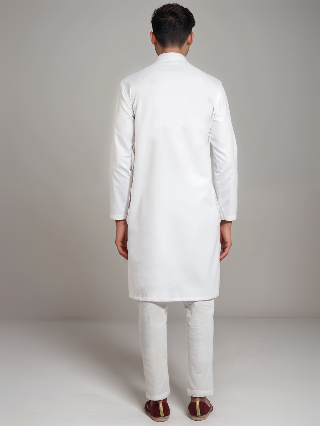 Pair this White Cotton Kurta with a contrasting churidar or straight-fit pyjama to achieve a refined ethnic look. Complete the outfit with classic mojaris or leather sandals.