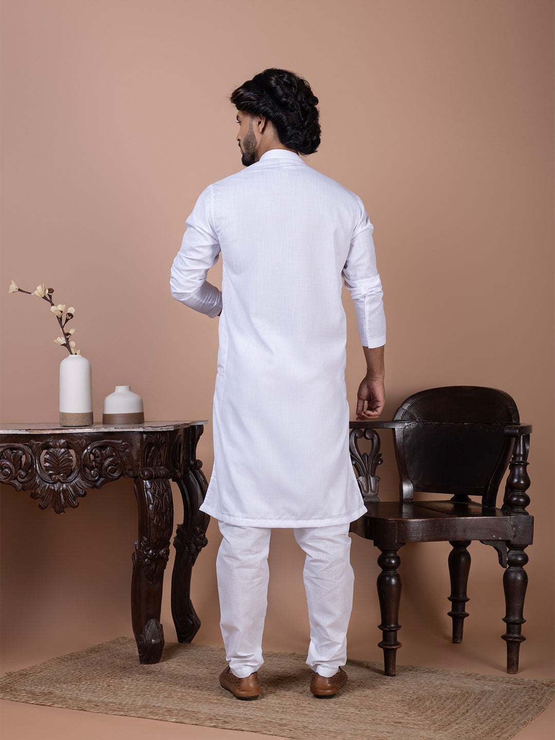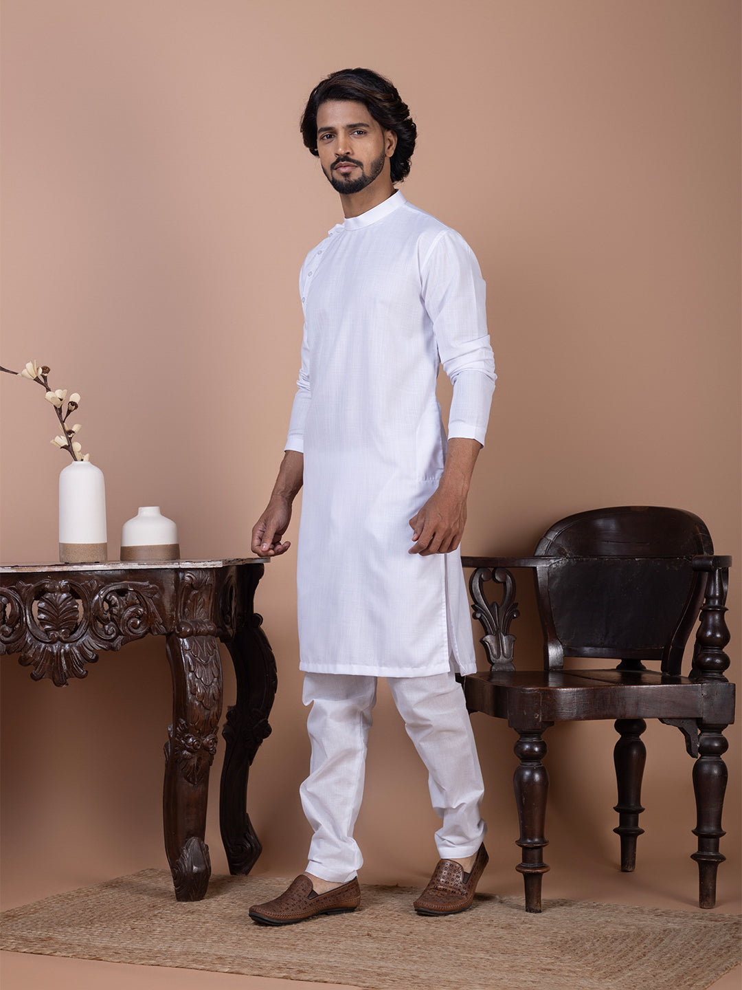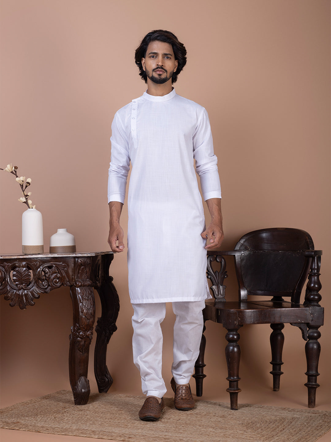 Pair this classic White kurta with traditional mojaris or embroidered juttis for a royal look. Add a contrasting stole or a statement watch to enhance your festive attire effortlessly.