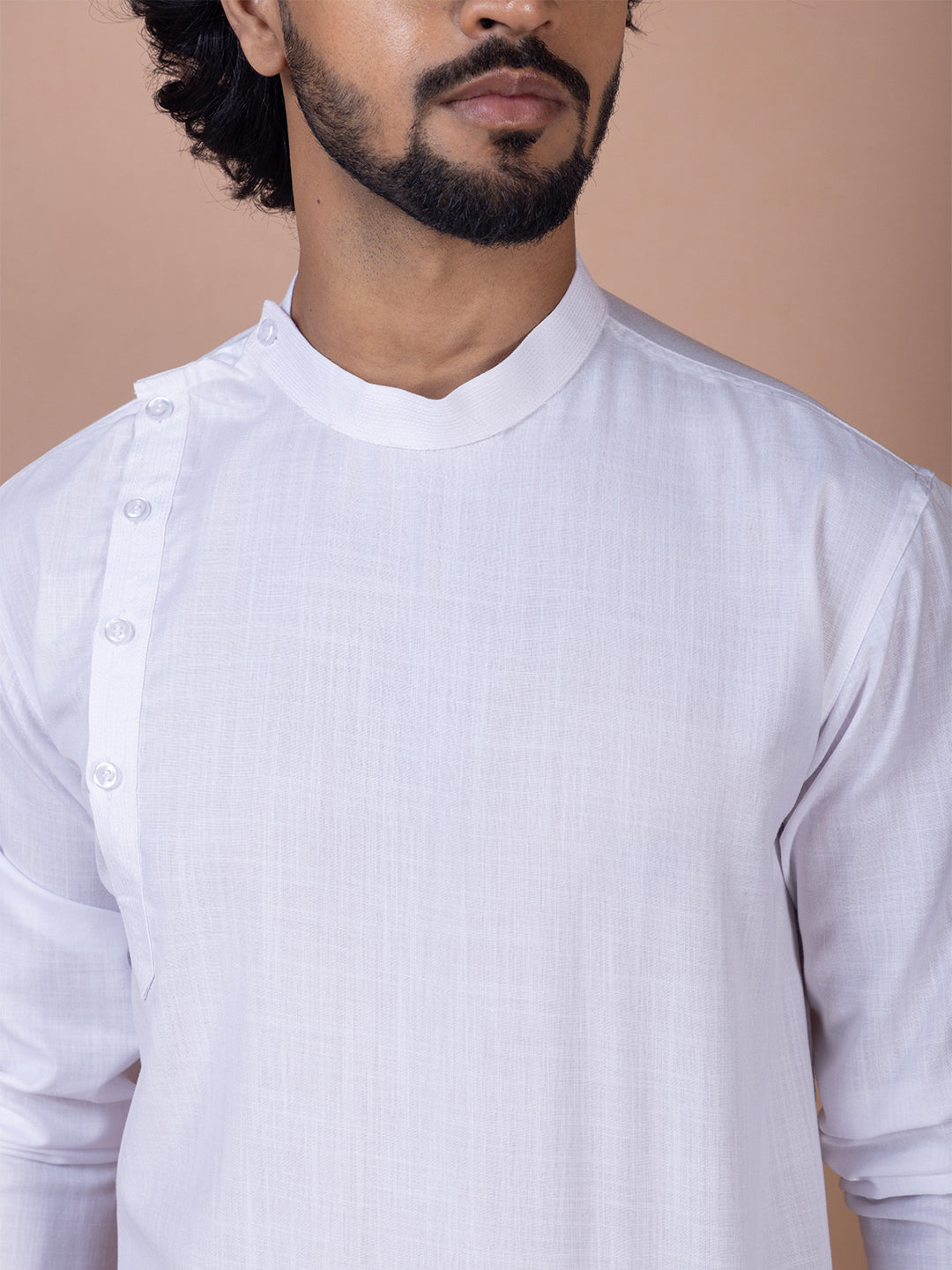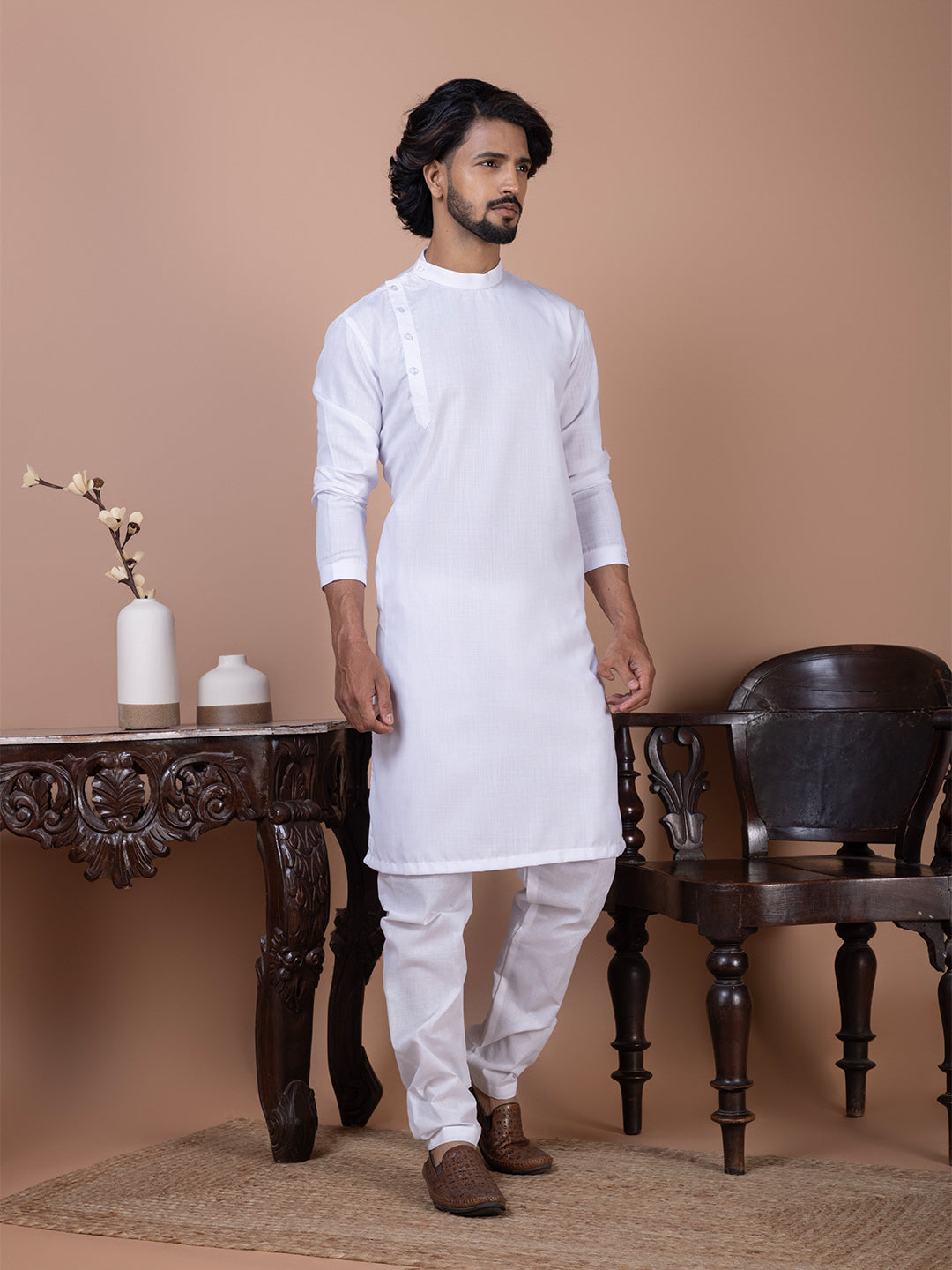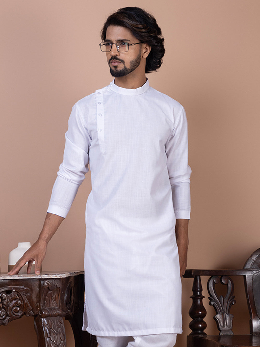 Pair this classic White kurta with traditional mojaris or embroidered juttis for a royal look. Add a contrasting stole or a statement watch to enhance your festive attire effortlessly.
