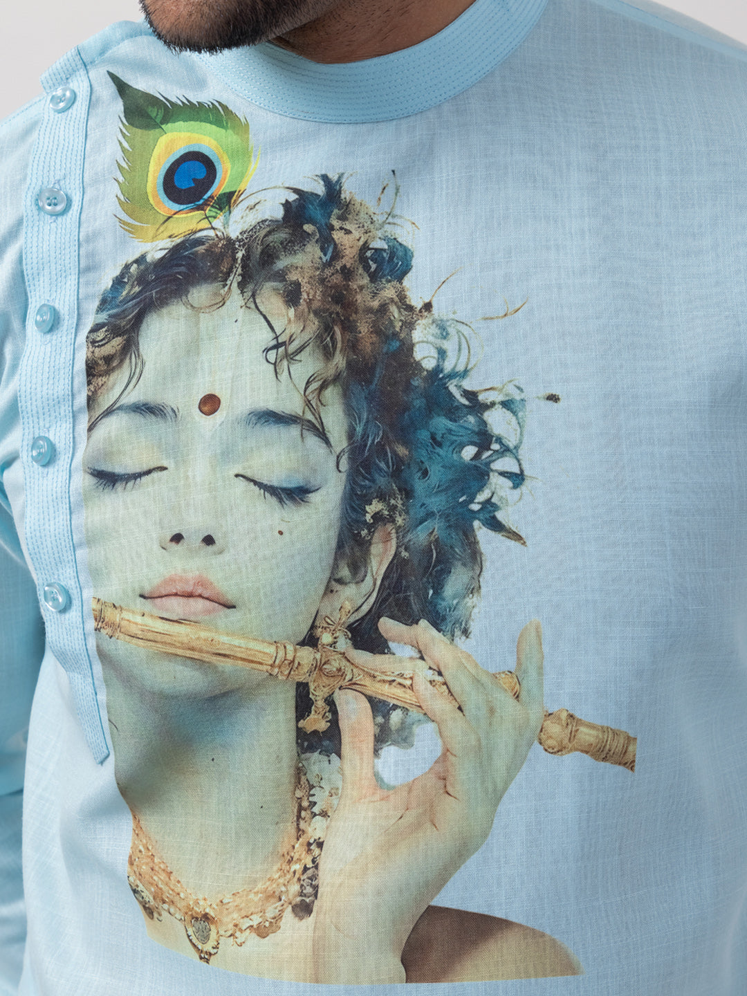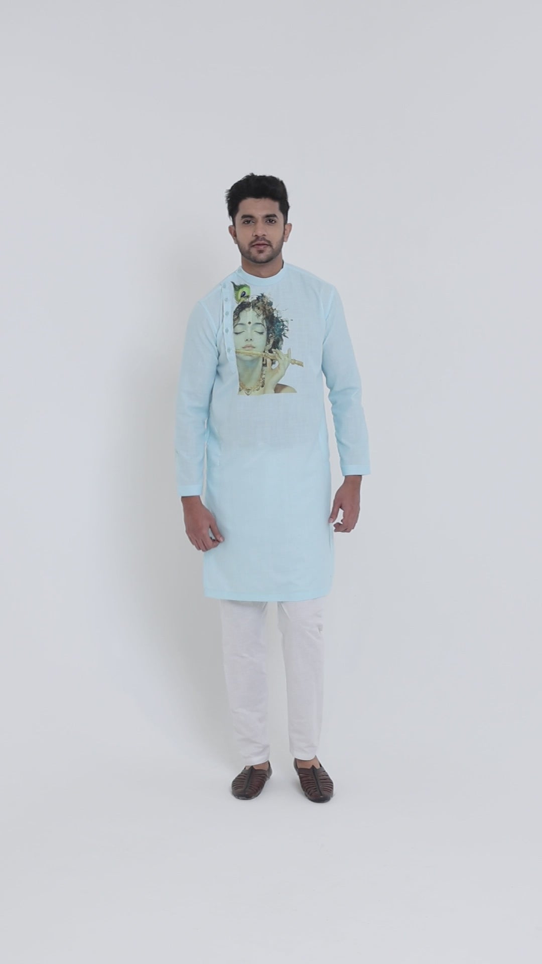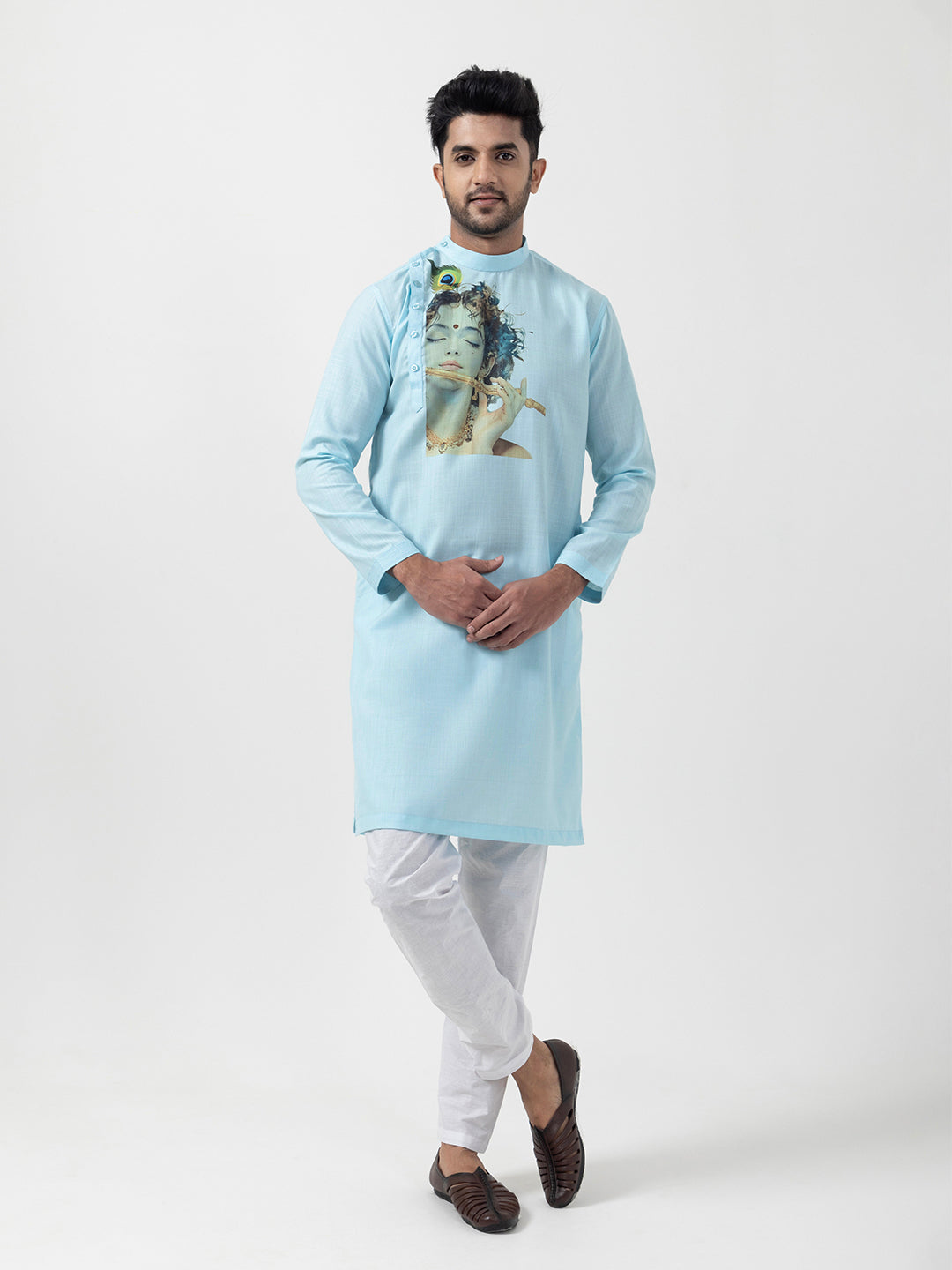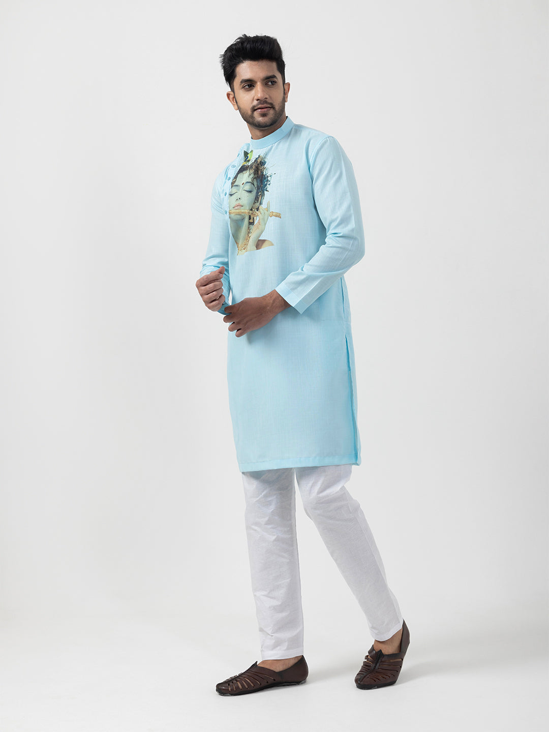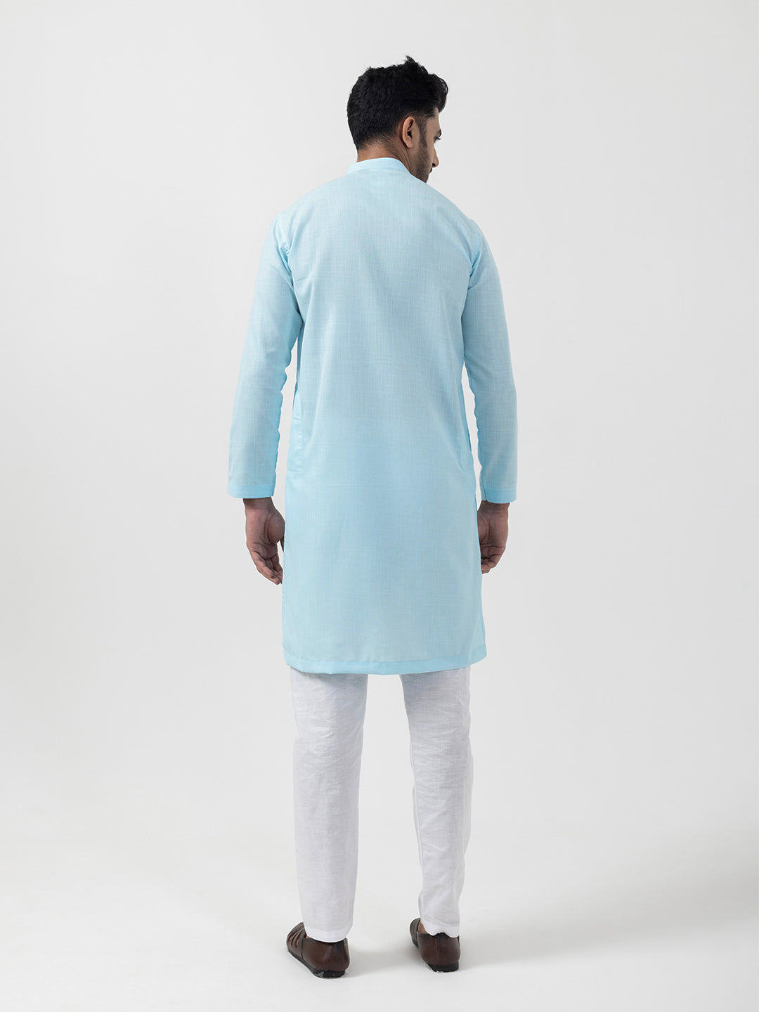 Pair this classic Sky Blue kurta with traditional mojaris or embroidered juttis for a royal look. Add a contrasting stole or a statement watch to enhance your festive attire effortlessly.