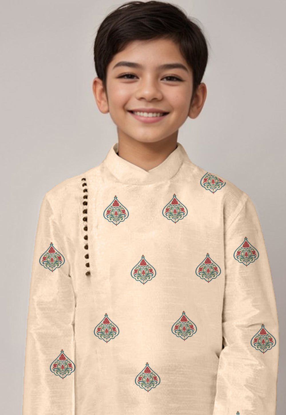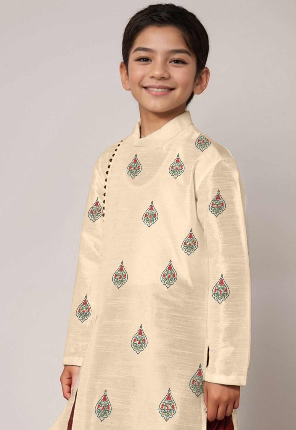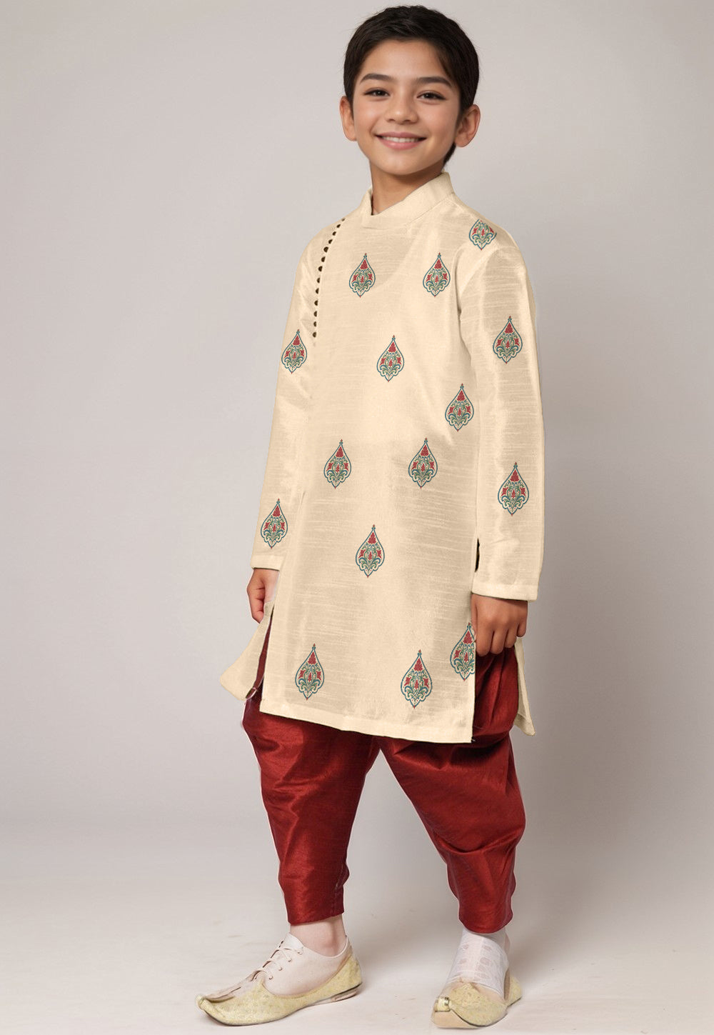 Make your little one stand out with this elegant kurta and dhoti set. Crafted from premium Dupion Silk fabric, the beige kurta features a charming printed design, paired perfectly with a maroon dhoti to create a stylish ethnic ensemble.