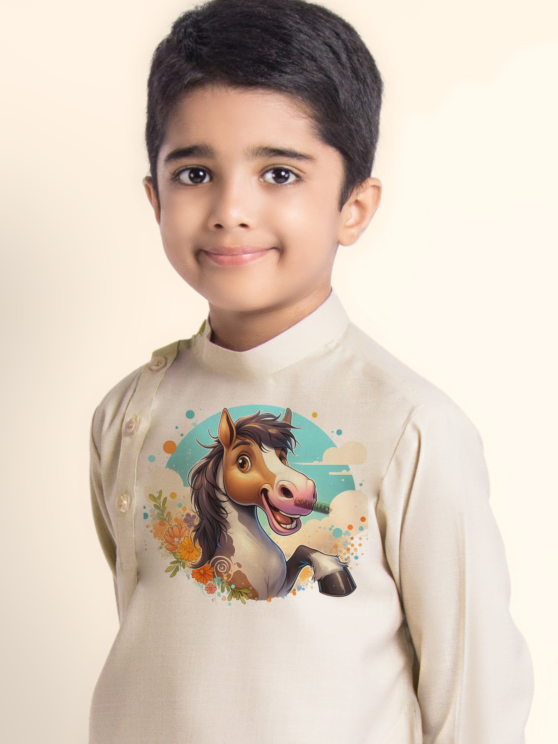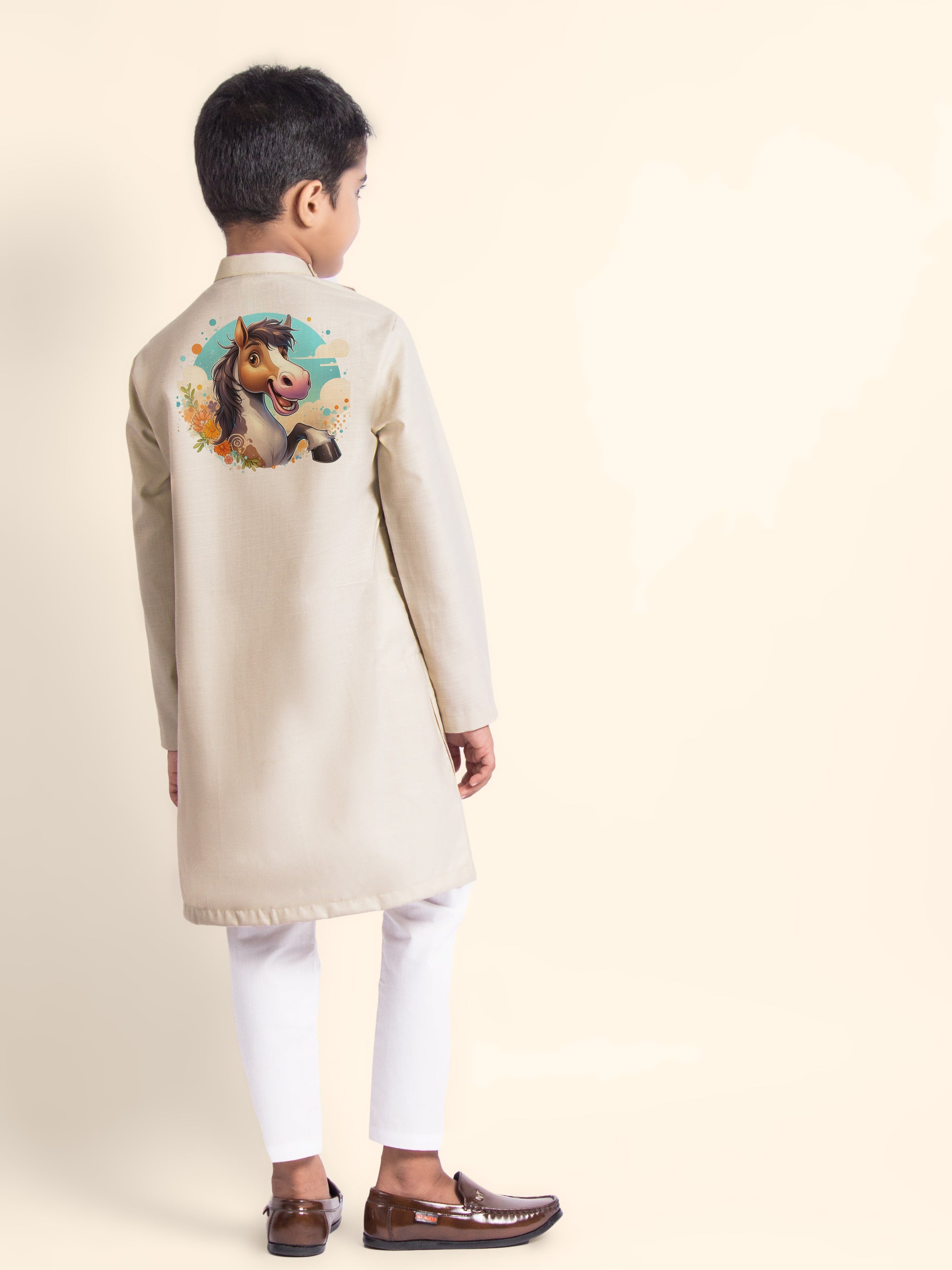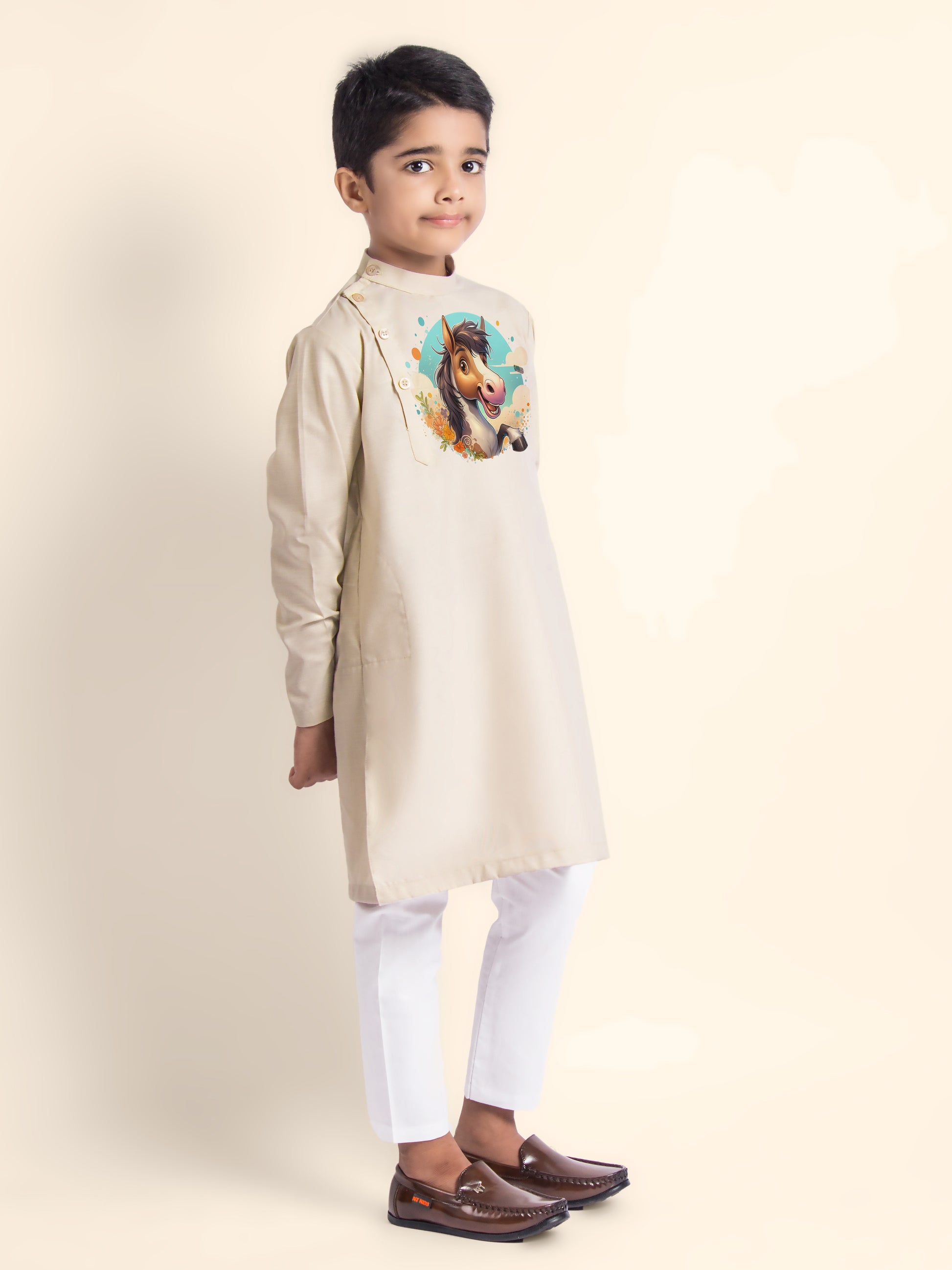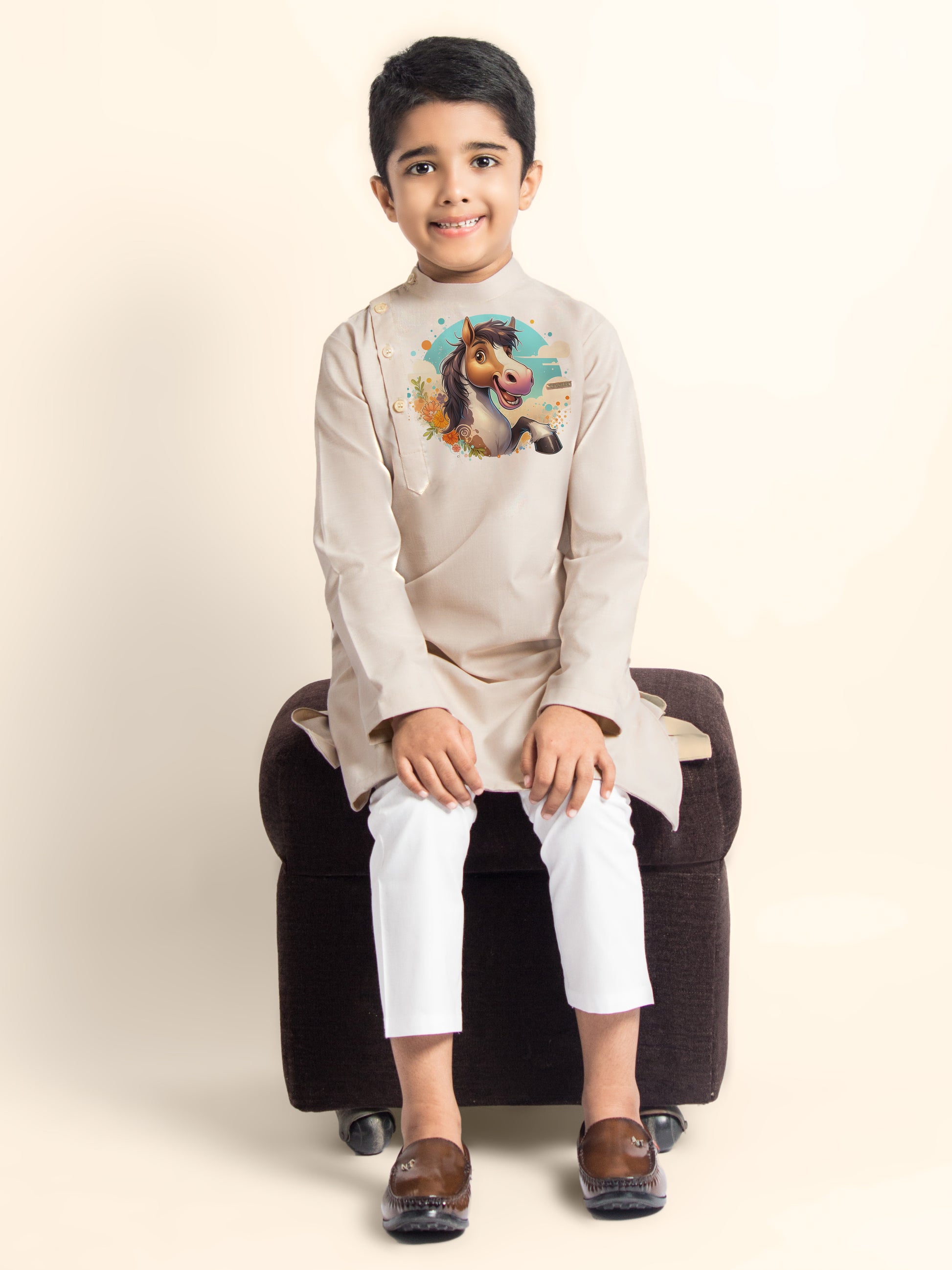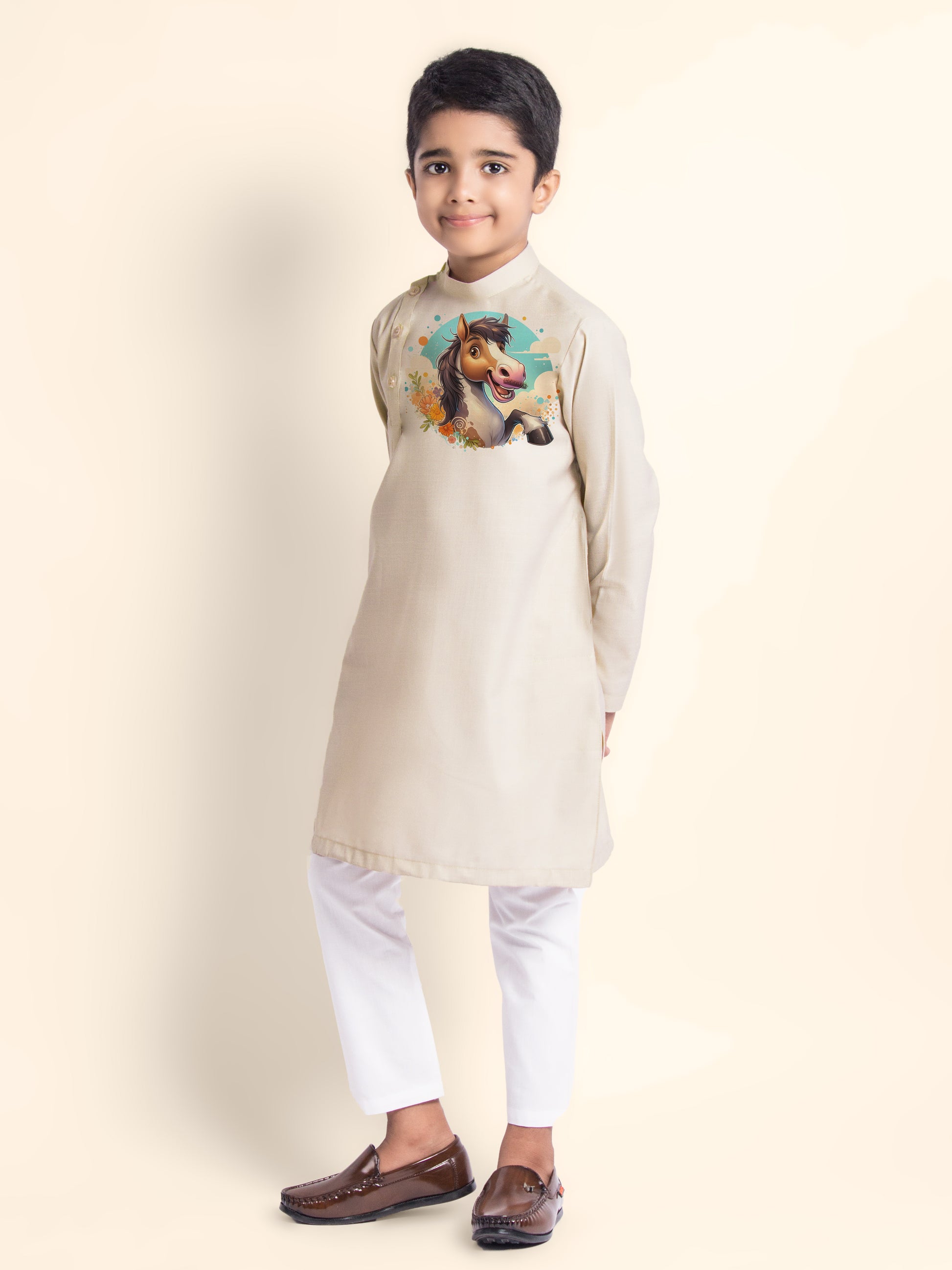 Bring timeless elegance to your child's ethnic wardrobe with this beige kurta and white pyjama set. Made from breathable cotton fabric, the kurta features a refined printed design that is perfect for festive occasions and cultural celebrations.