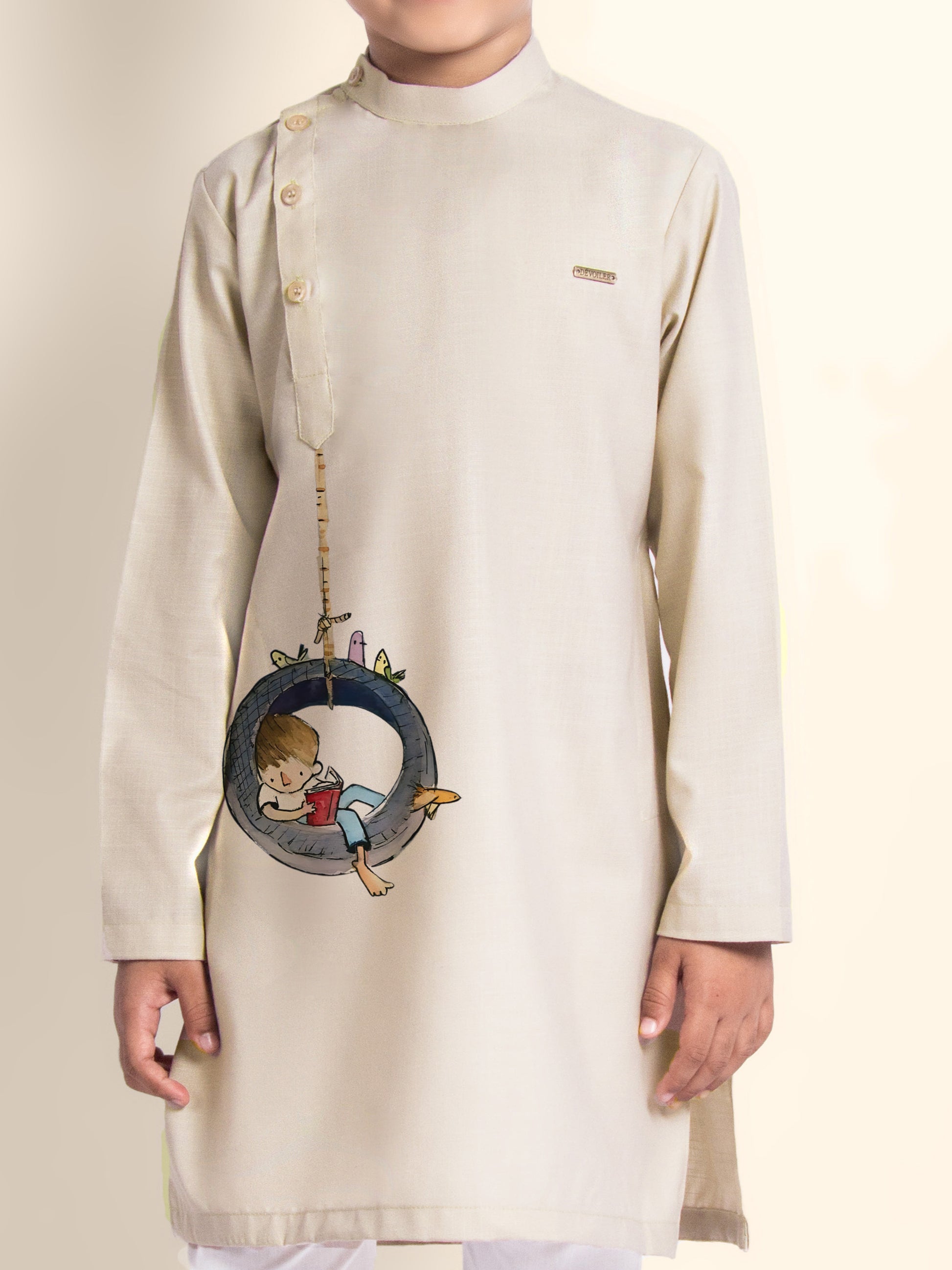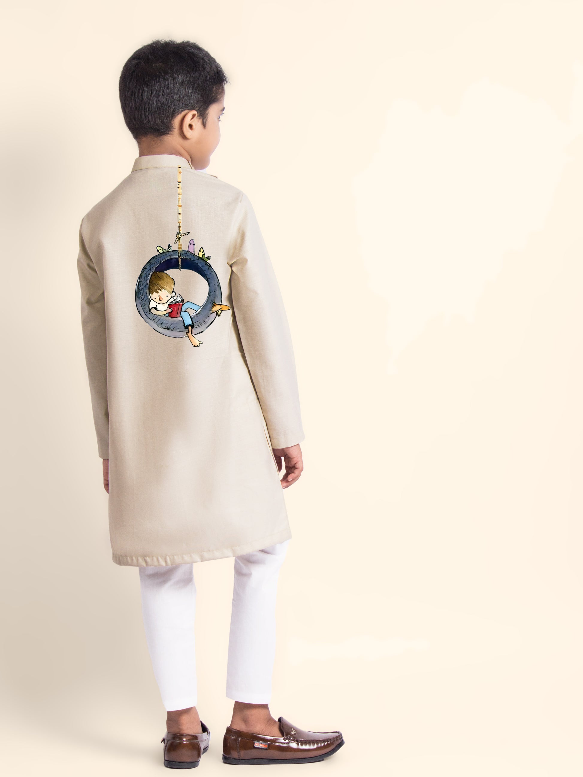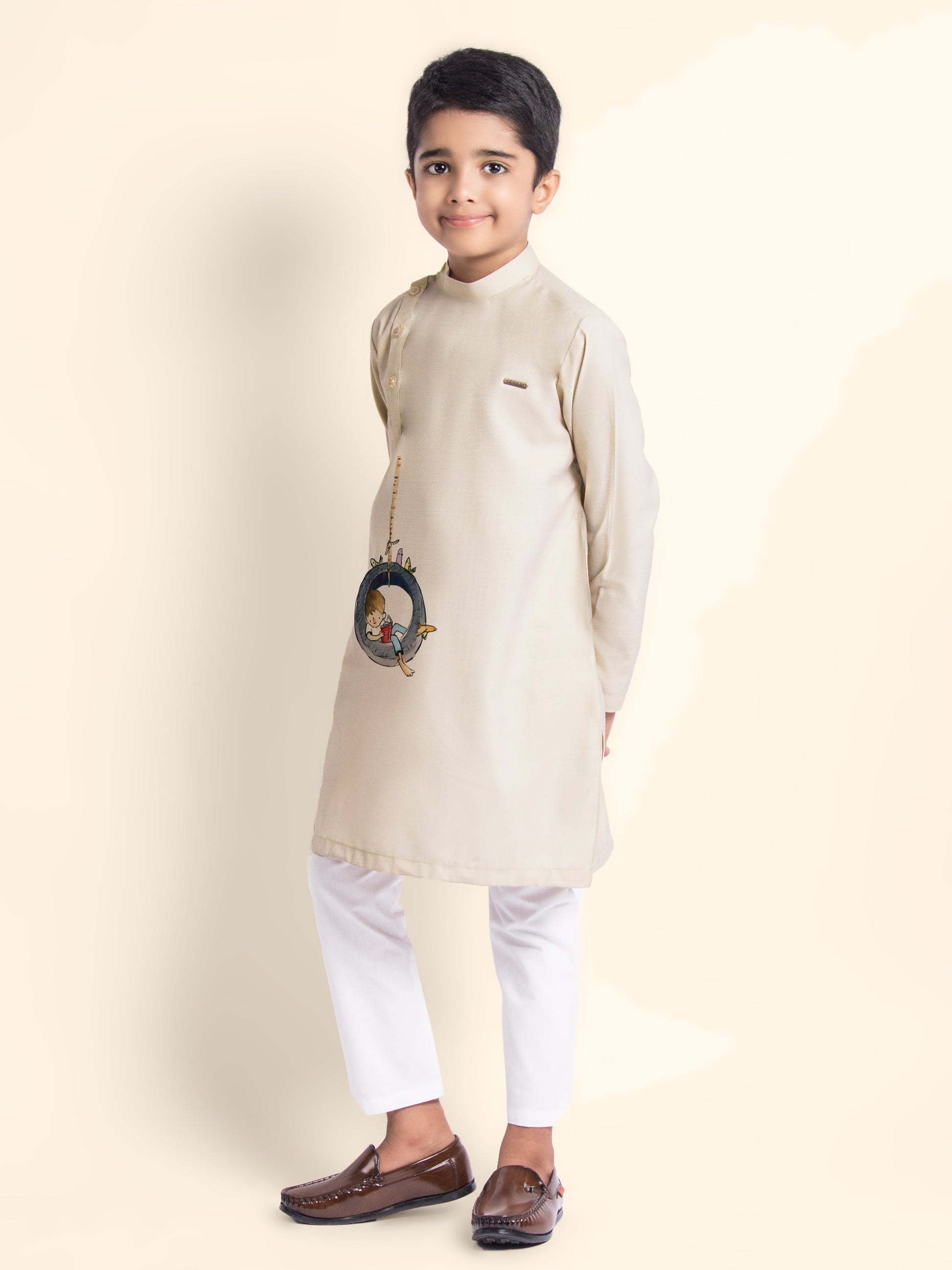 Bring timeless elegance to your child's ethnic wardrobe with this beige kurta and white pyjama set. Made from breathable cotton fabric, the kurta features a refined printed design that is perfect for festive occasions and cultural celebrations.