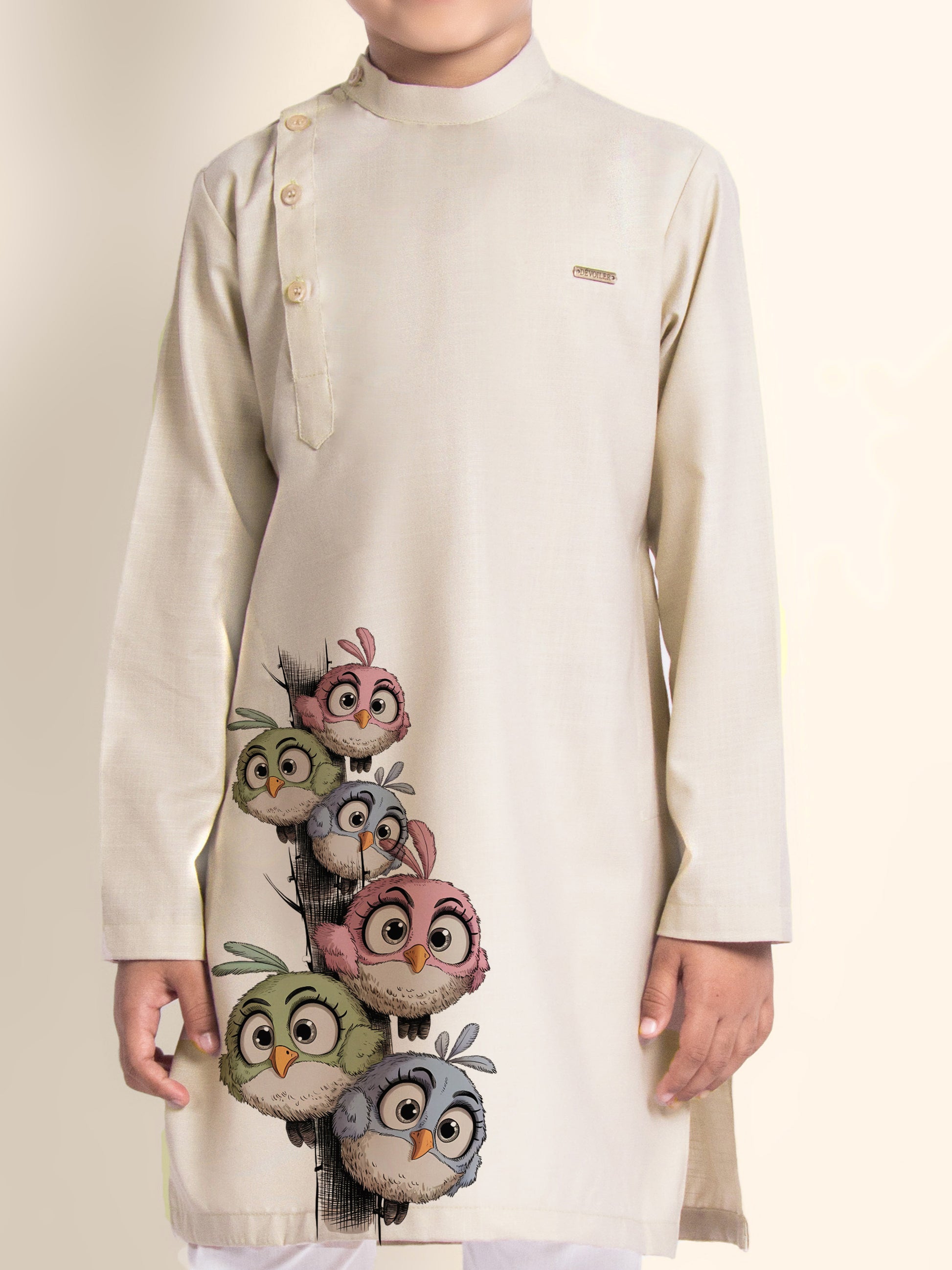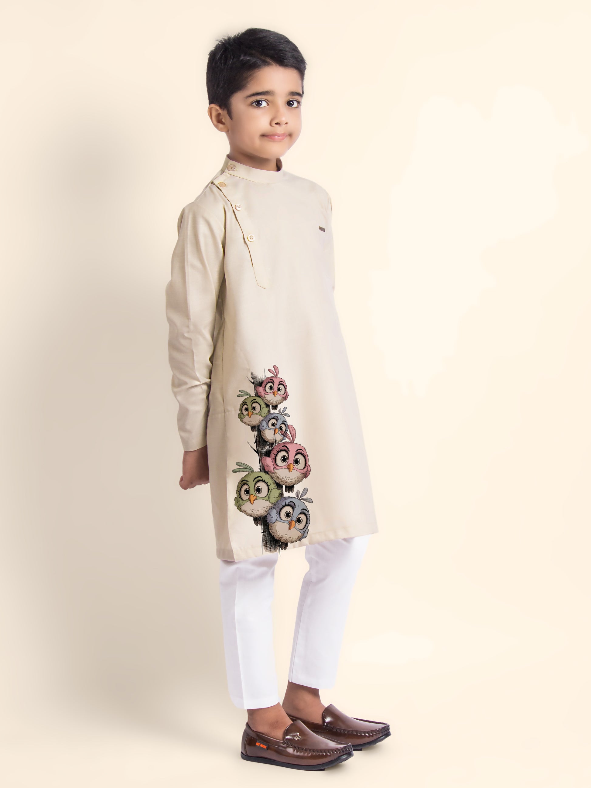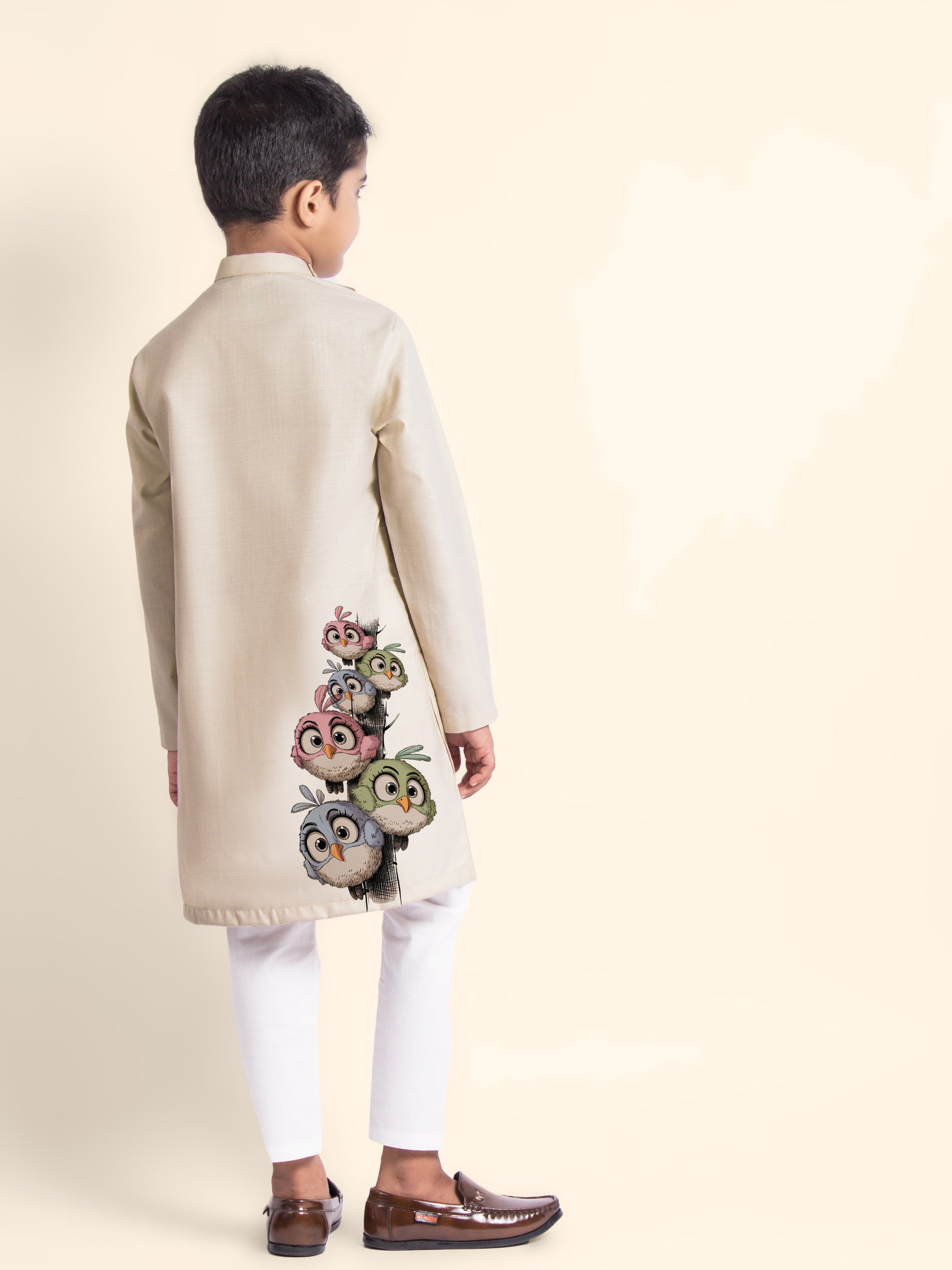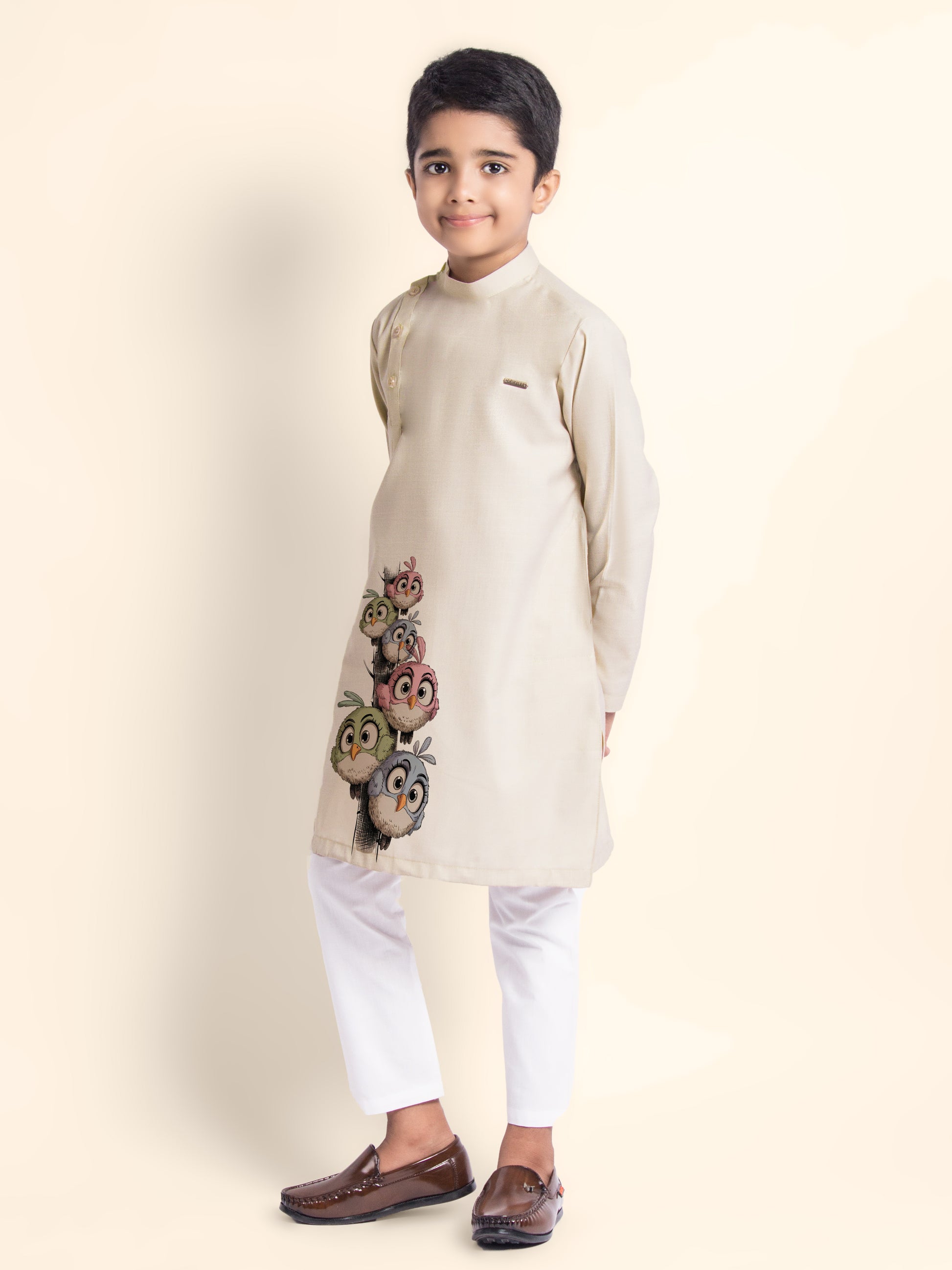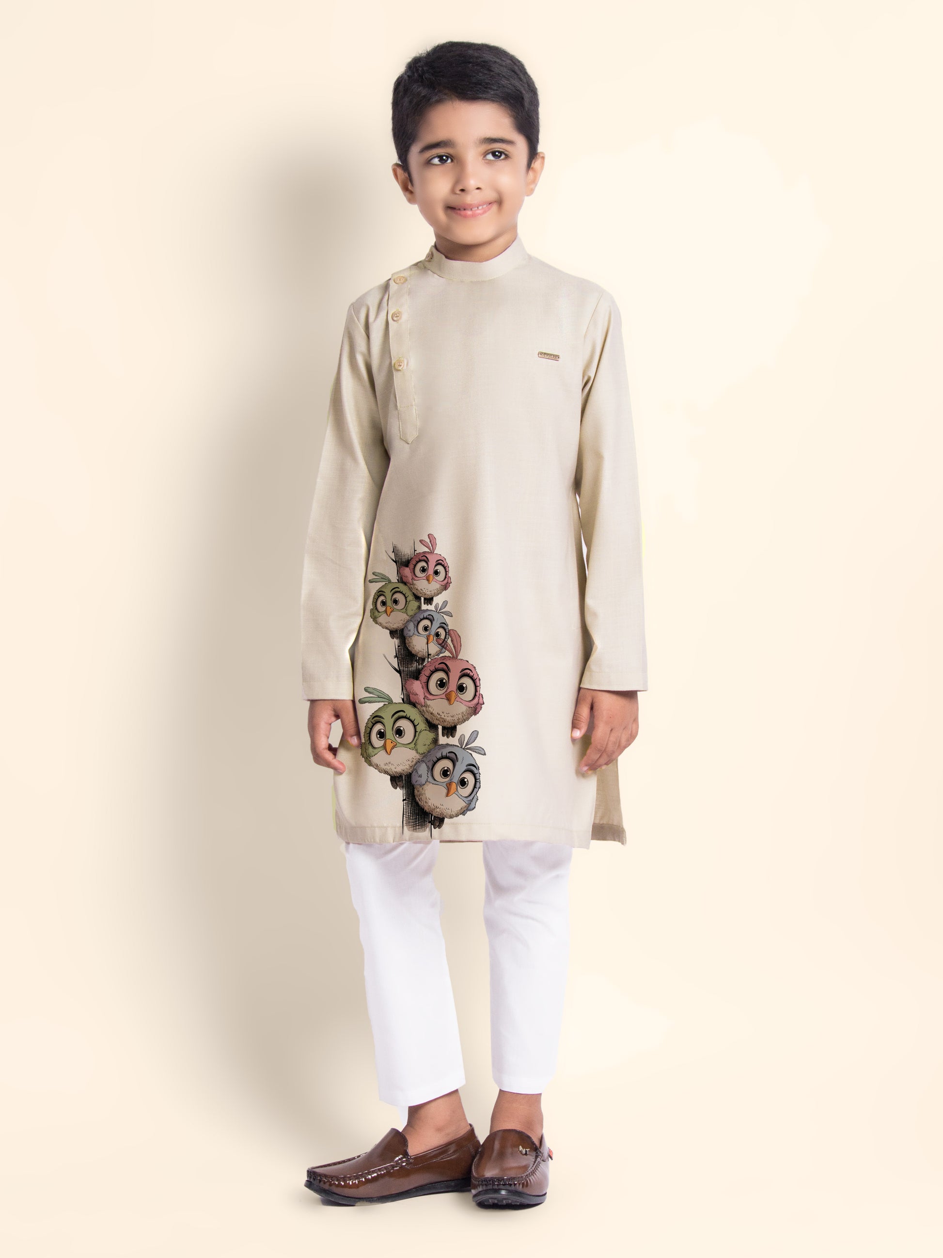 Bring timeless elegance to your child's ethnic wardrobe with this beige kurta and white pyjama set. Made from breathable cotton fabric, the kurta features a refined printed design that is perfect for festive occasions and cultural celebrations.