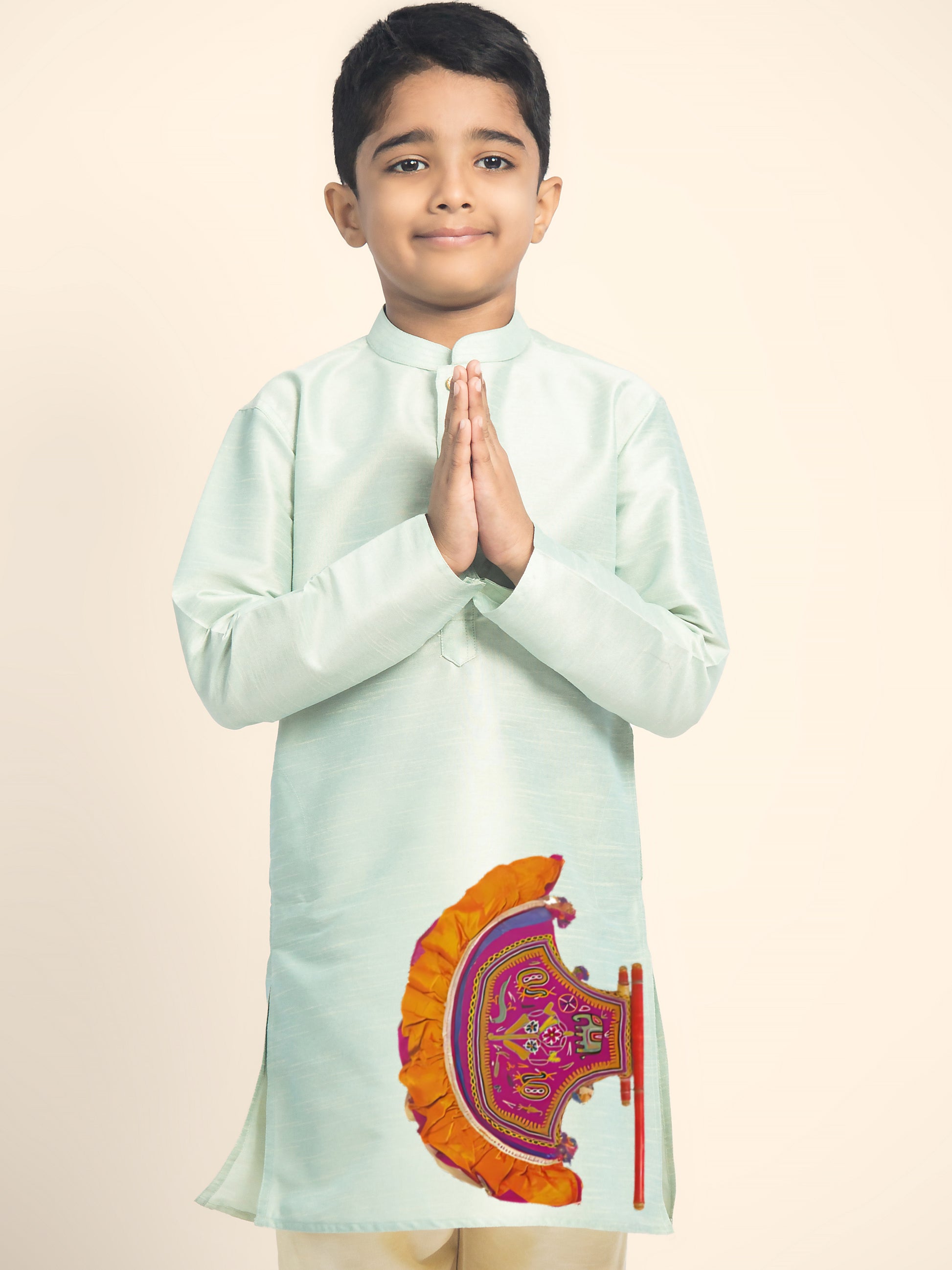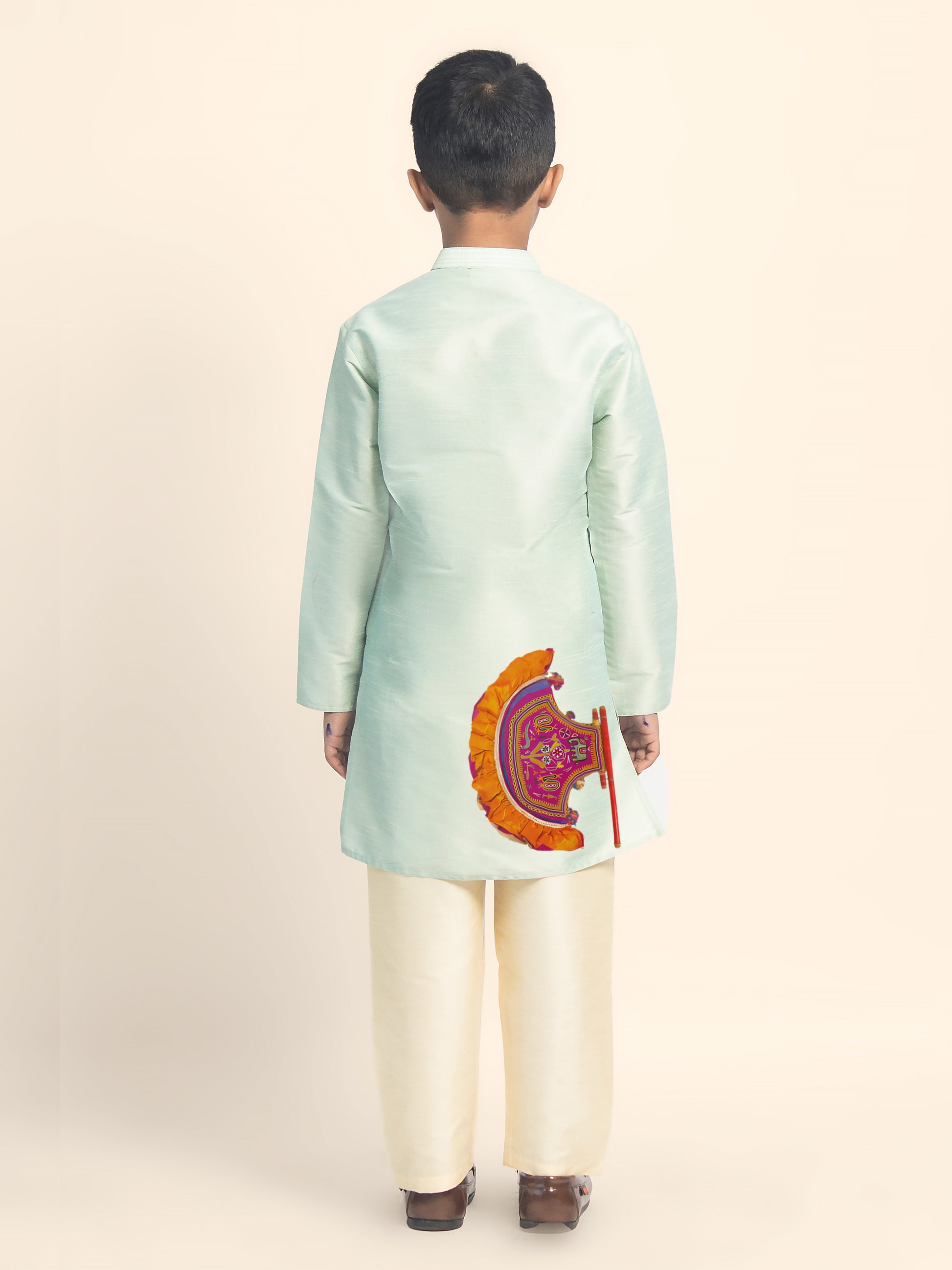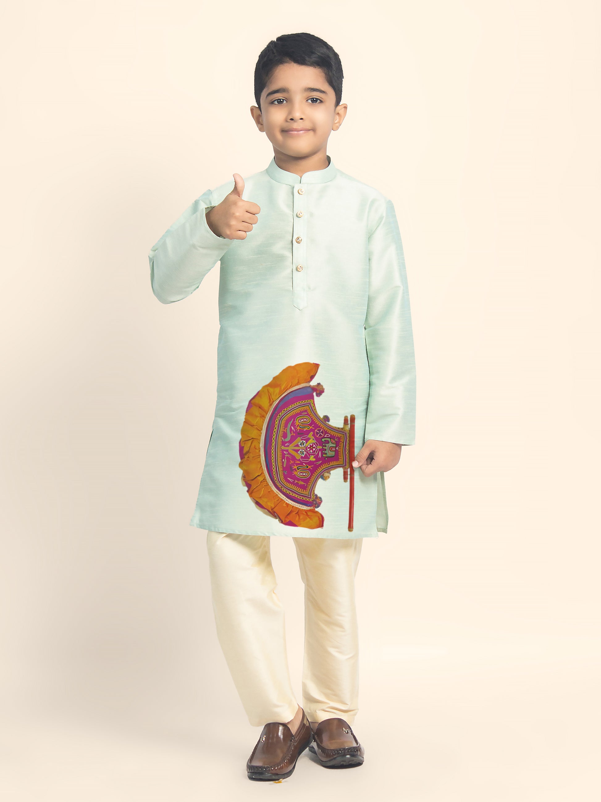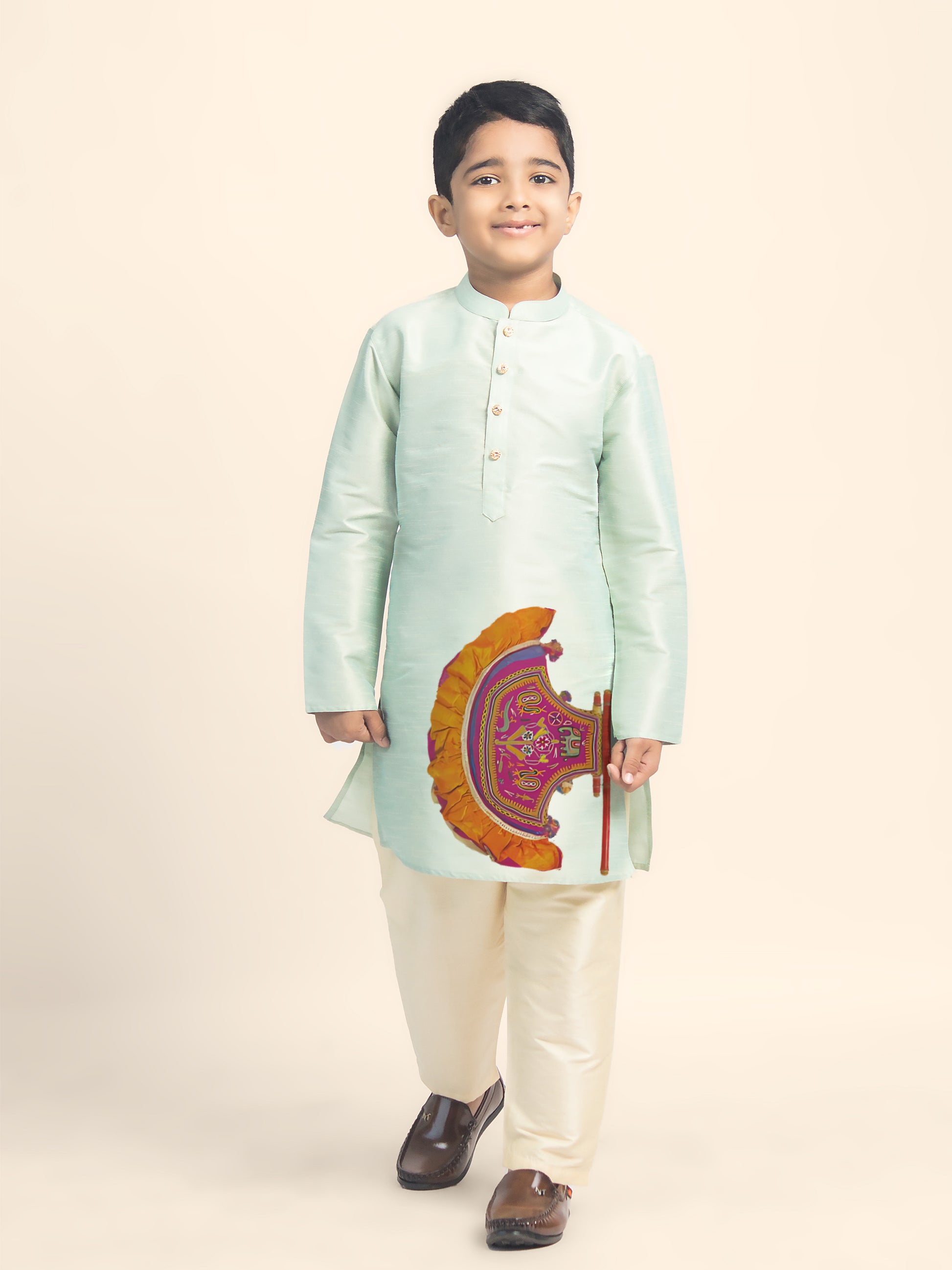 Let your little one shine in this beautifully designed Green Dupion Silk Kurta with a Beige Pyjama. Crafted with premium fabric, this kurta set is perfect for festive occasions, weddings, and cultural celebrations. The elegant print detailing enhances the traditional appeal, making it a must-have for every young fashion enthusiast.