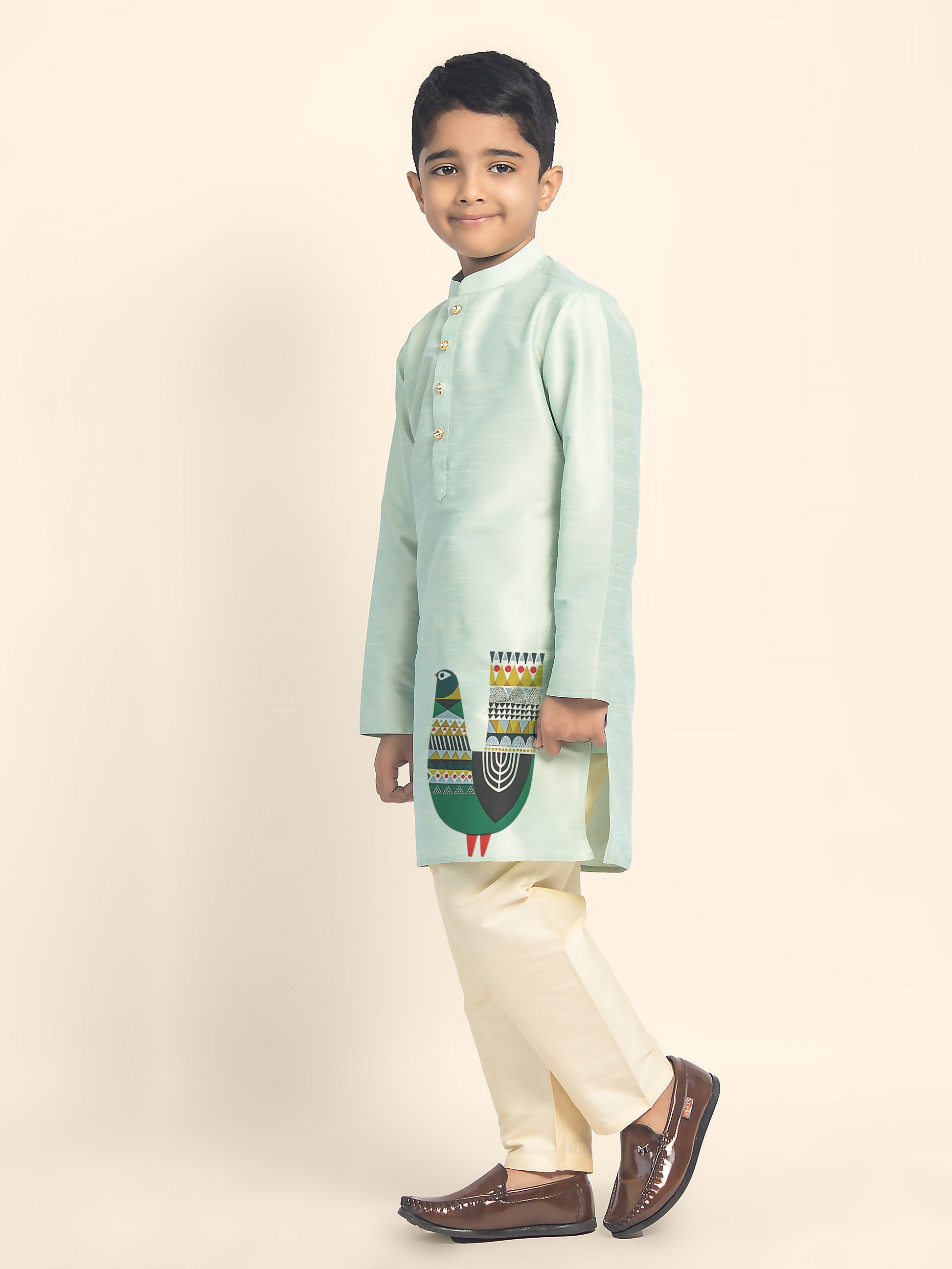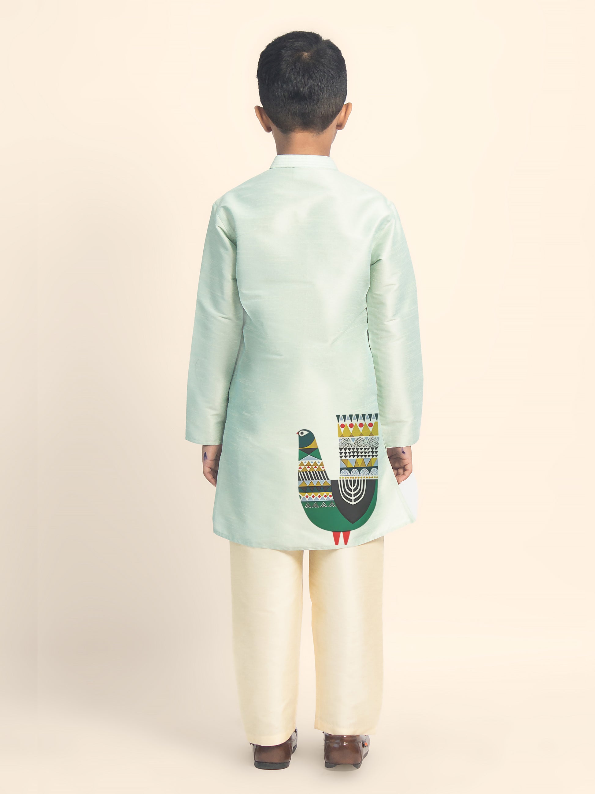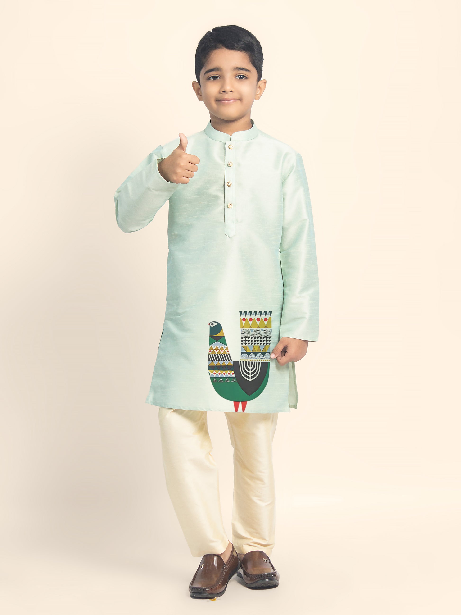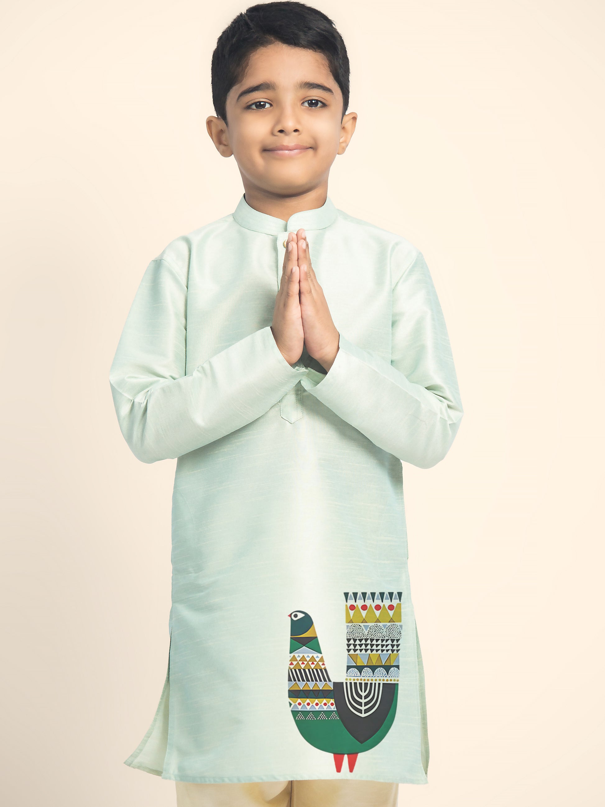Let your little one shine in this beautifully designed Green Dupion Silk Kurta with a Beige Pyjama. Crafted with premium fabric, this kurta set is perfect for festive occasions, weddings, and cultural celebrations. The elegant print detailing enhances the traditional appeal, making it a must-have for every young fashion enthusiast.