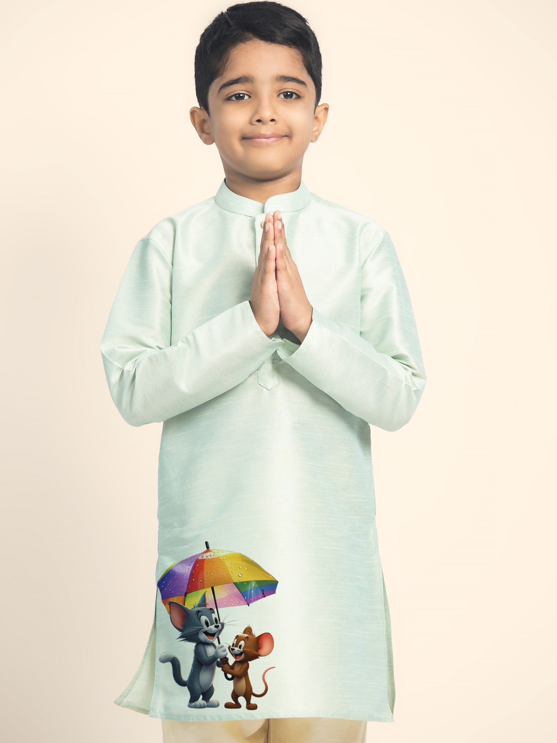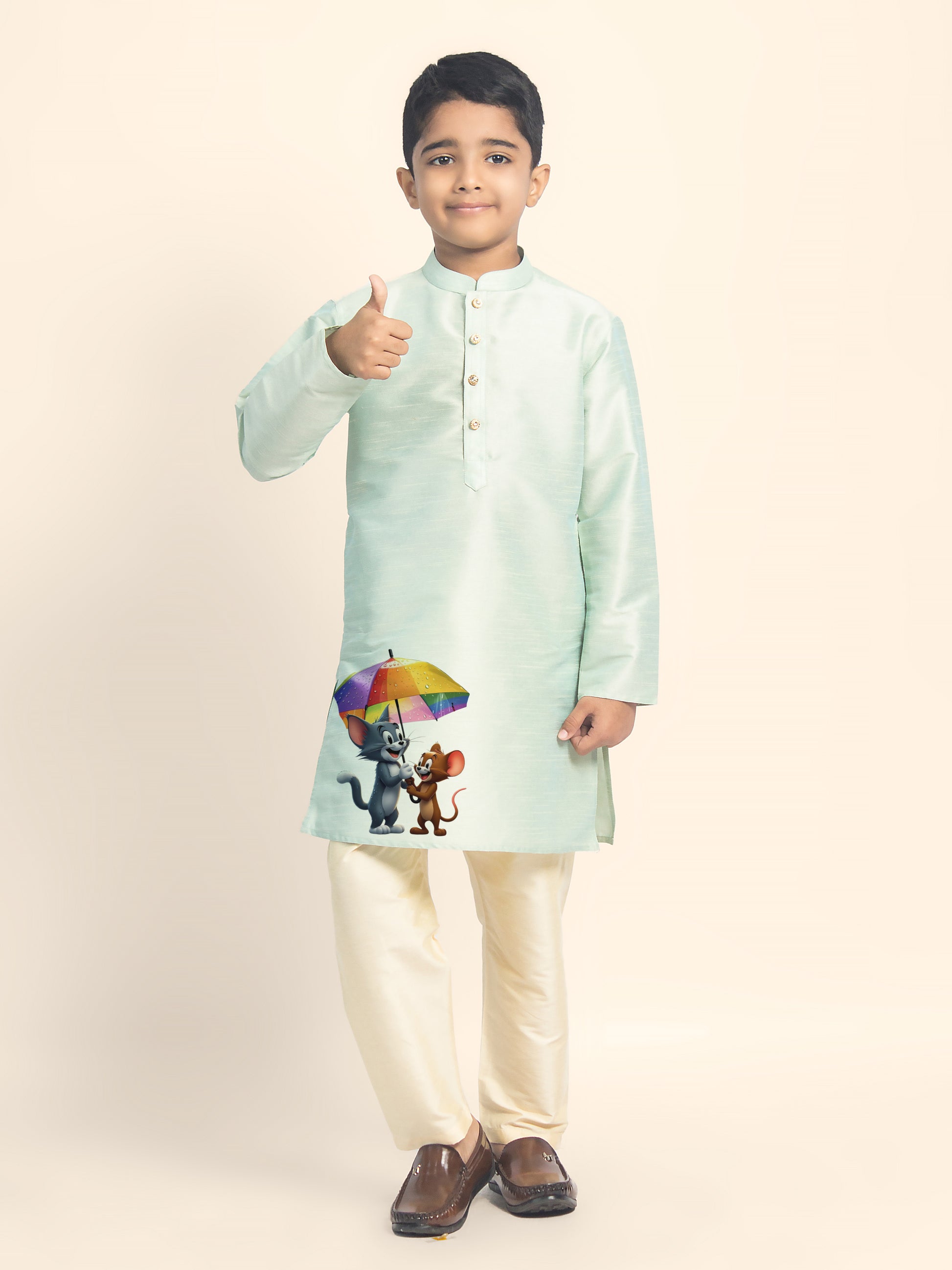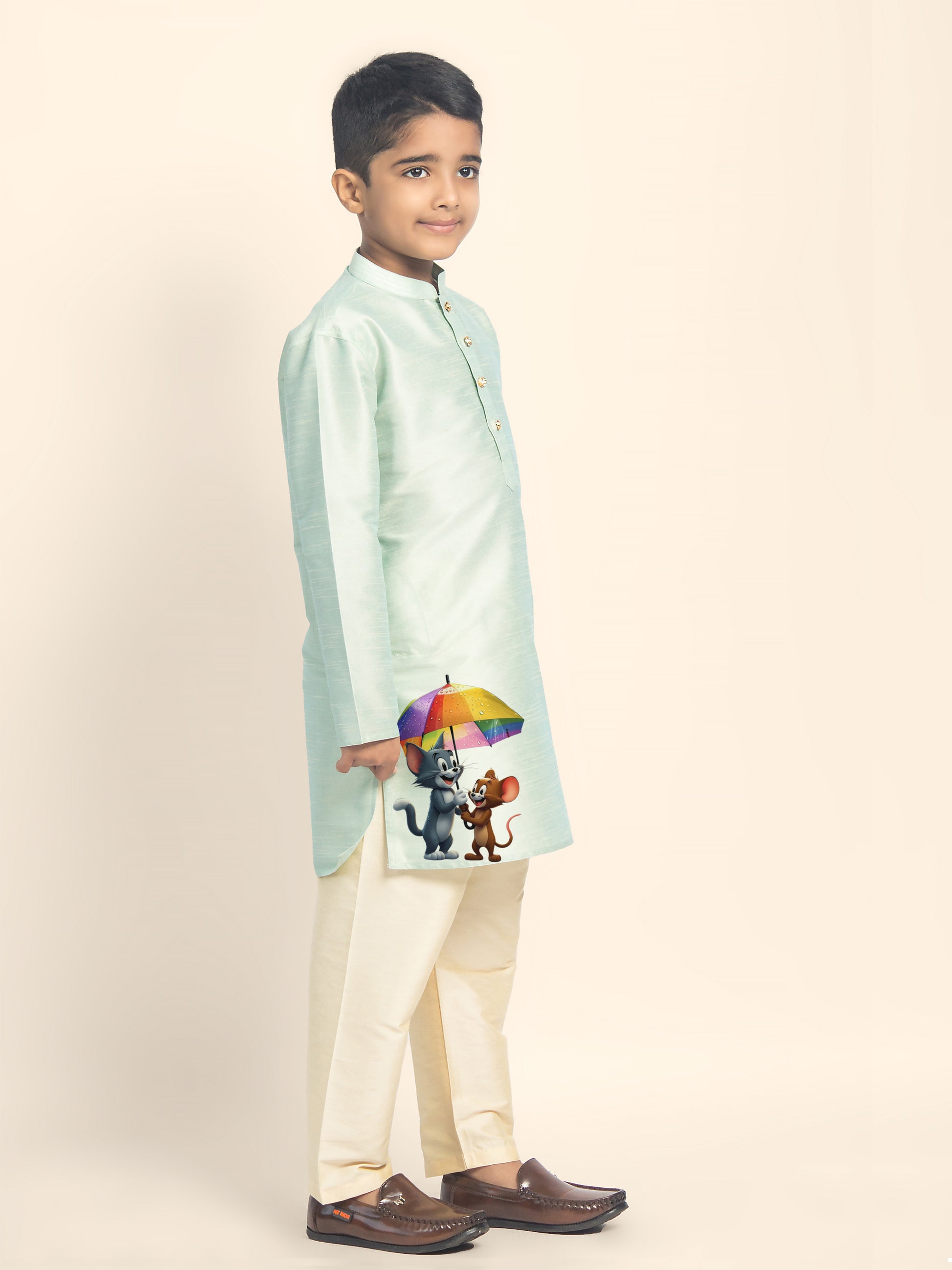 Let your little one shine in this beautifully designed Green Dupion Silk Kurta with a Beige Pyjama. Crafted with premium fabric, this kurta set is perfect for festive occasions, weddings, and cultural celebrations. The elegant print detailing enhances the traditional appeal, making it a must-have for every young fashion enthusiast.