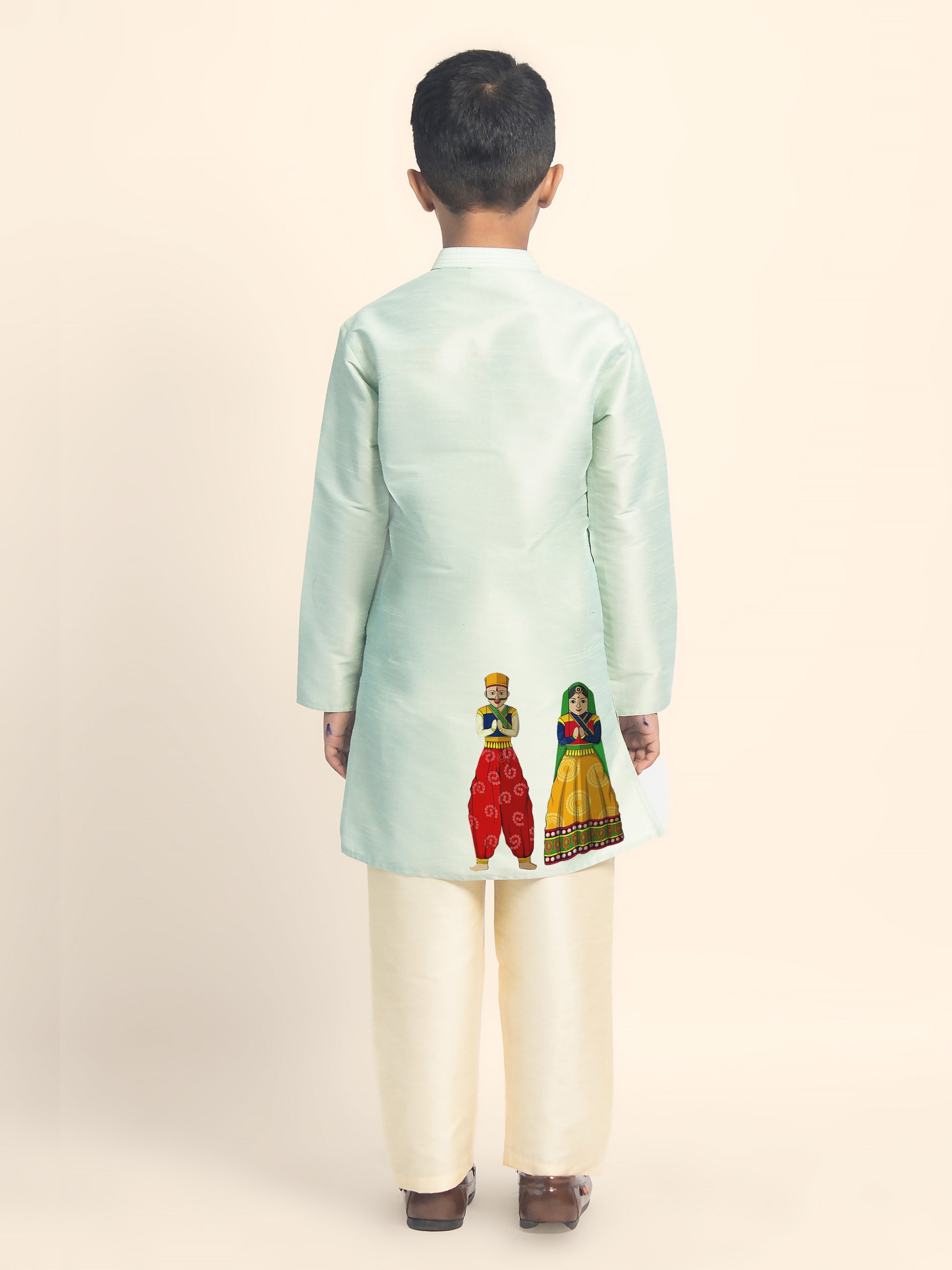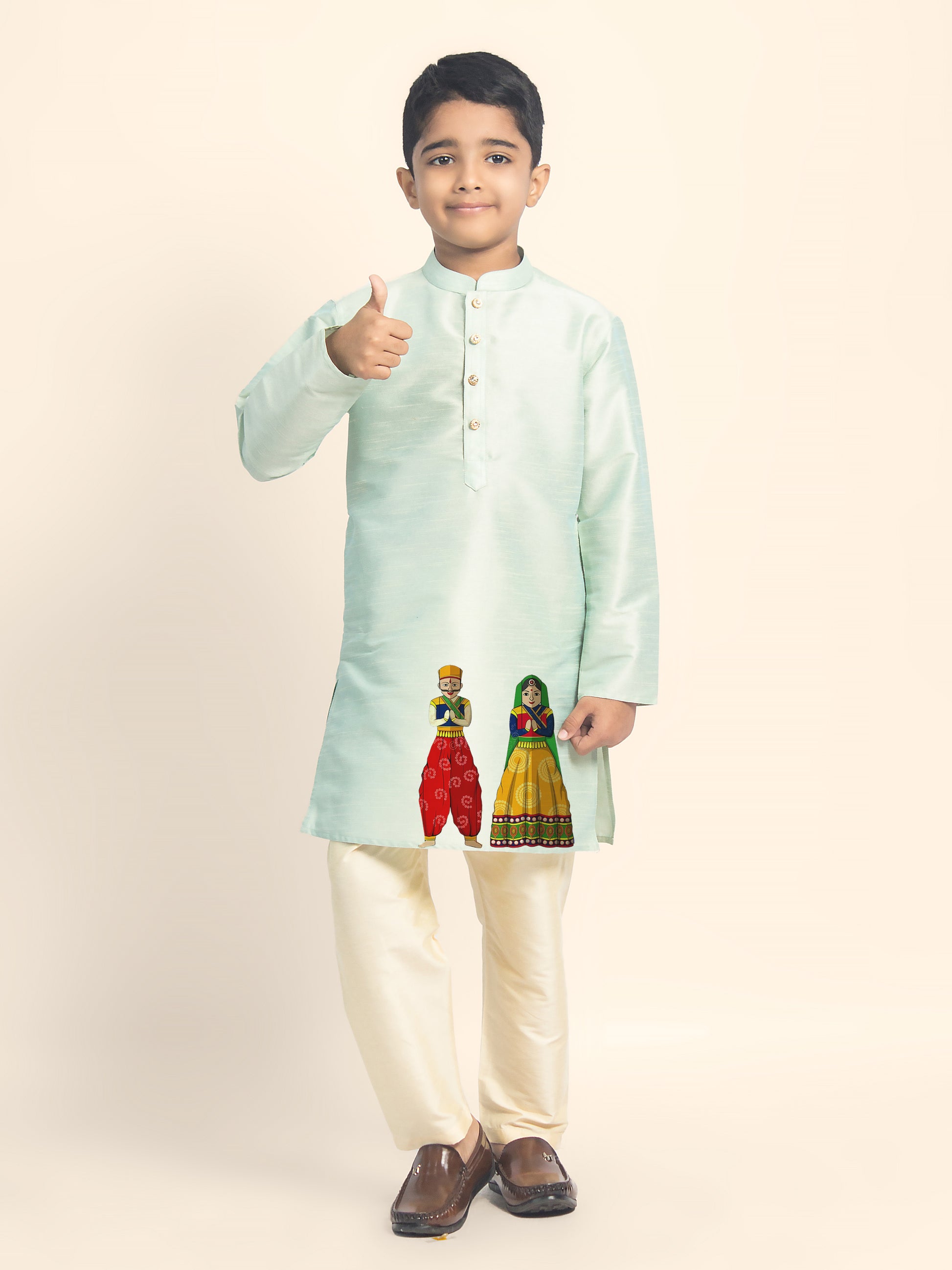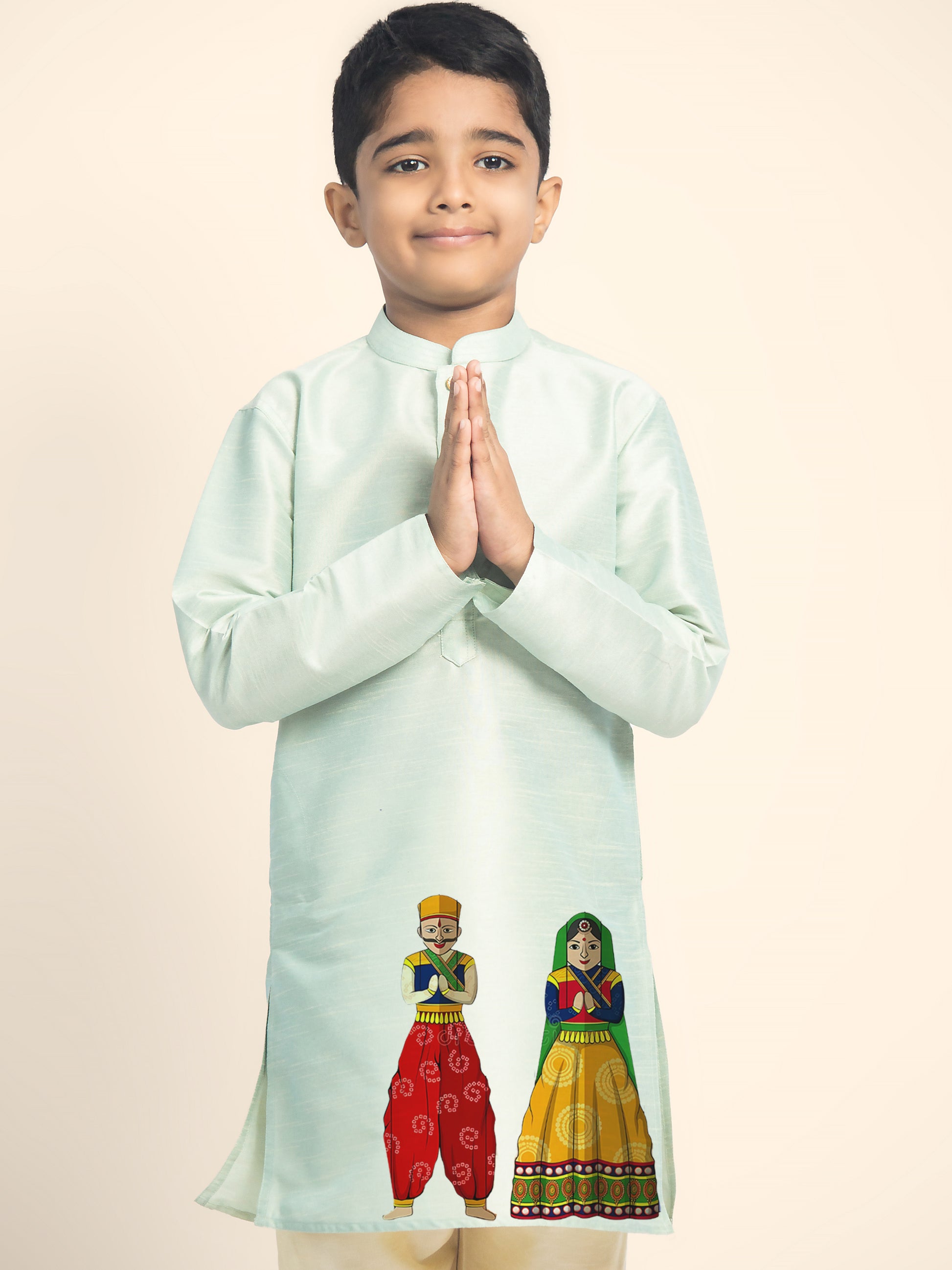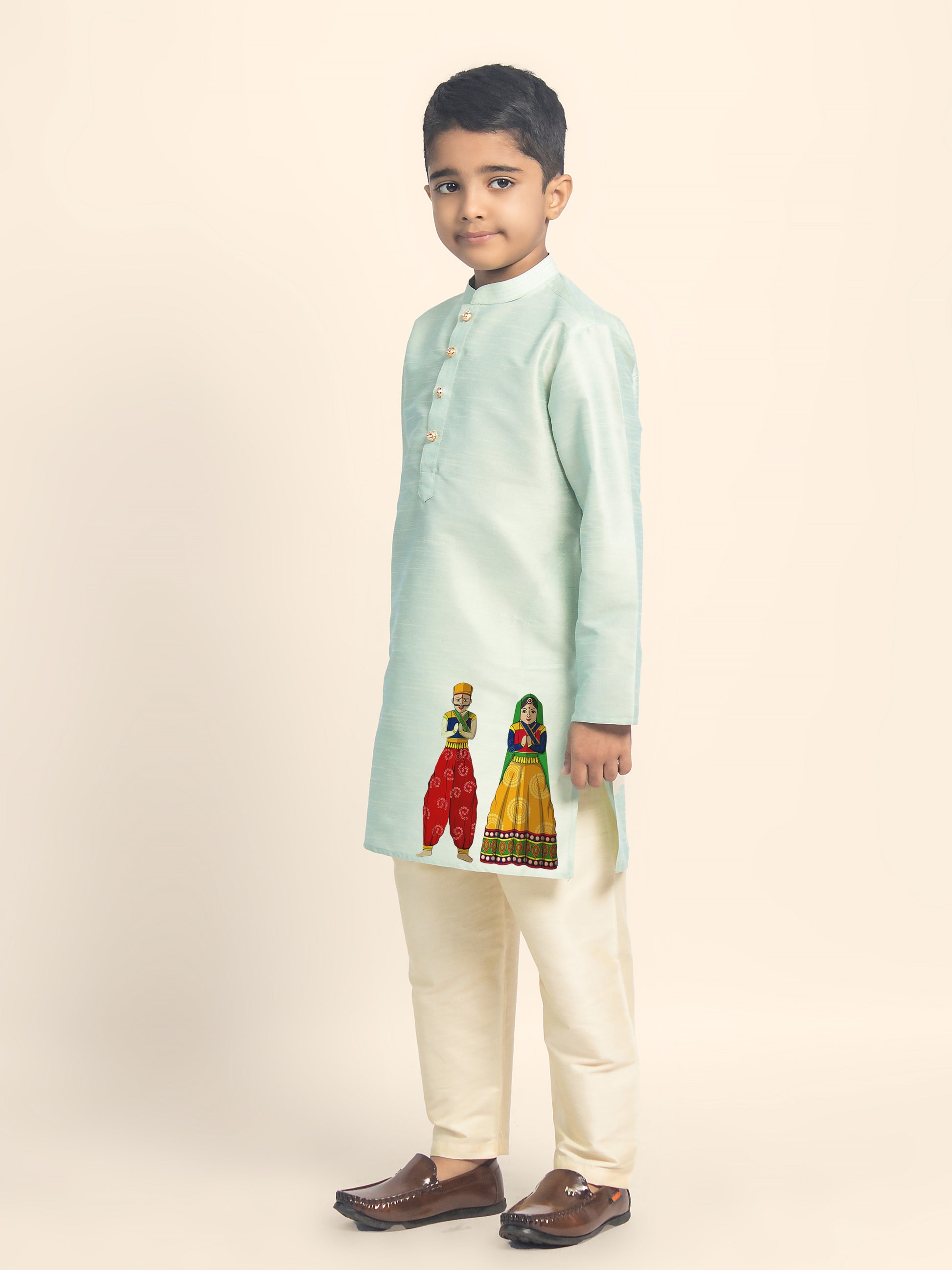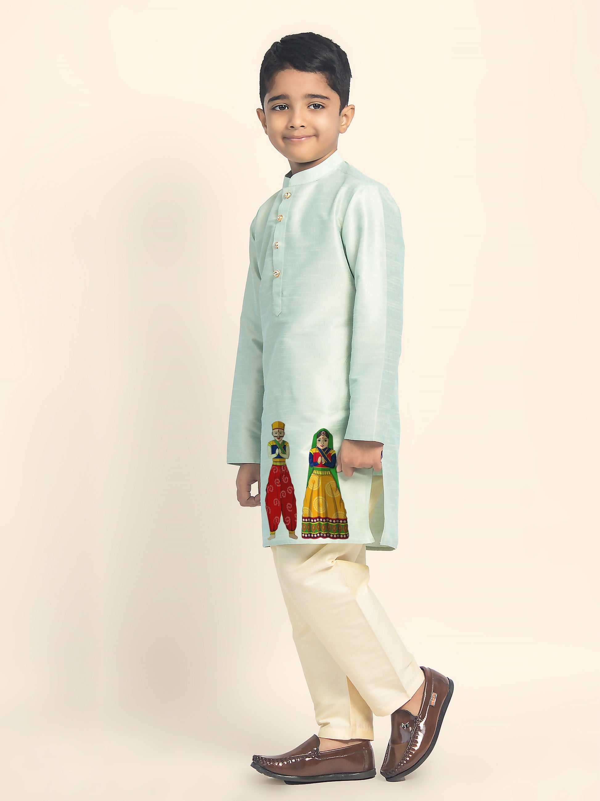 Let your little one shine in this beautifully designed Green Dupion Silk Kurta with a Beige Pyjama. Crafted with premium fabric, this kurta set is perfect for festive occasions, weddings, and cultural celebrations. The elegant print detailing enhances the traditional appeal, making it a must-have for every young fashion enthusiast.