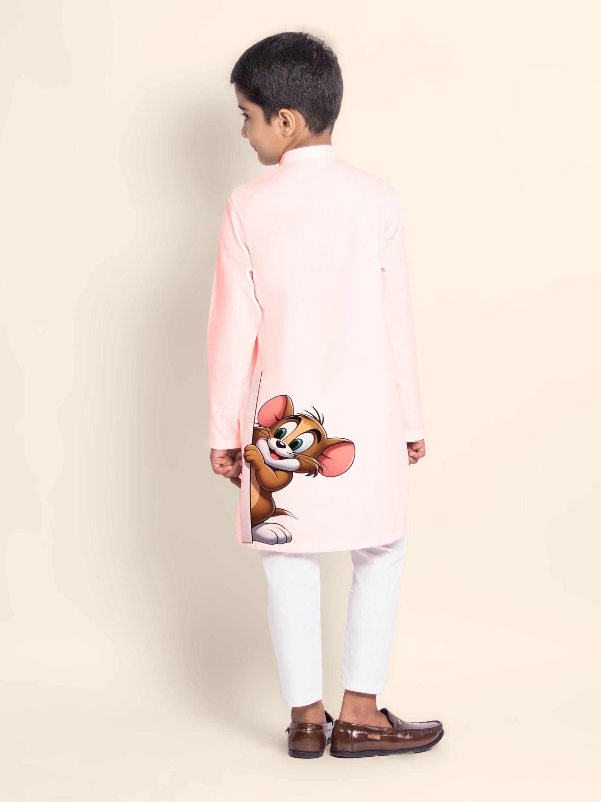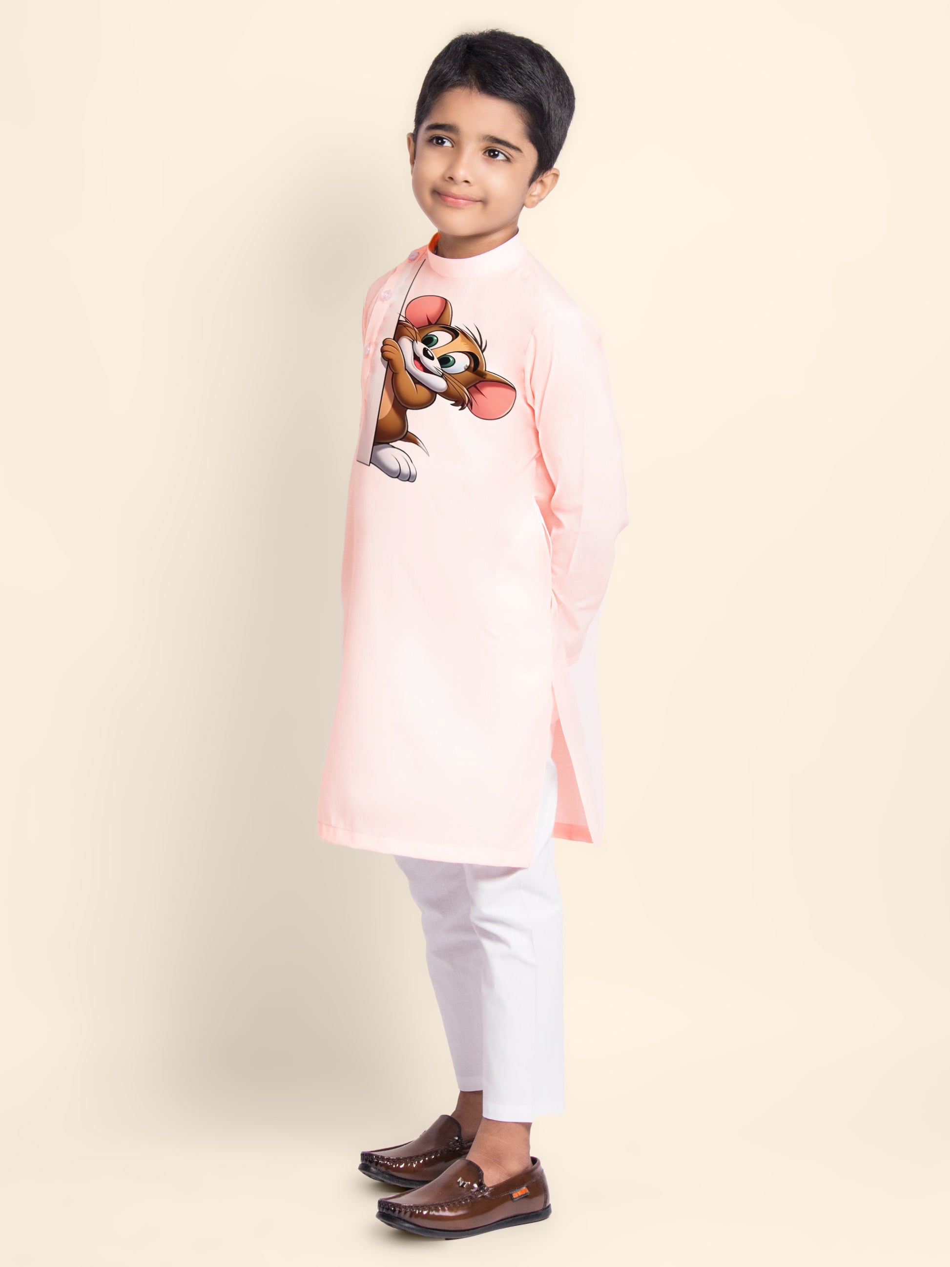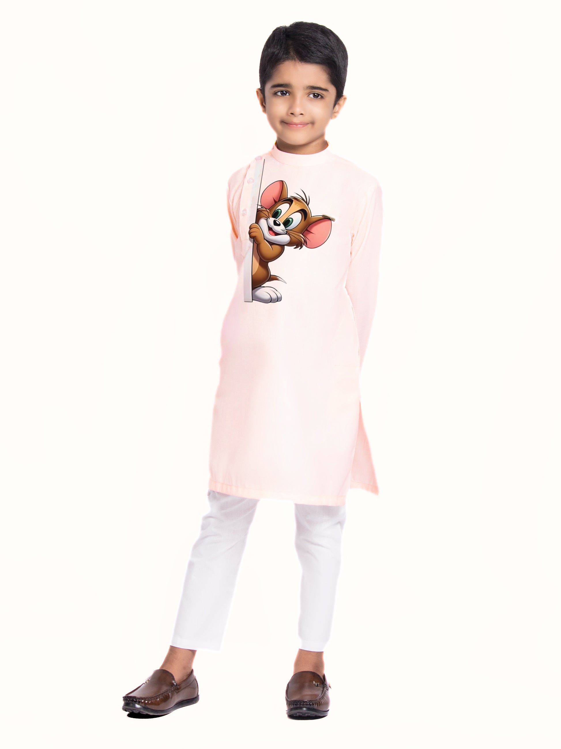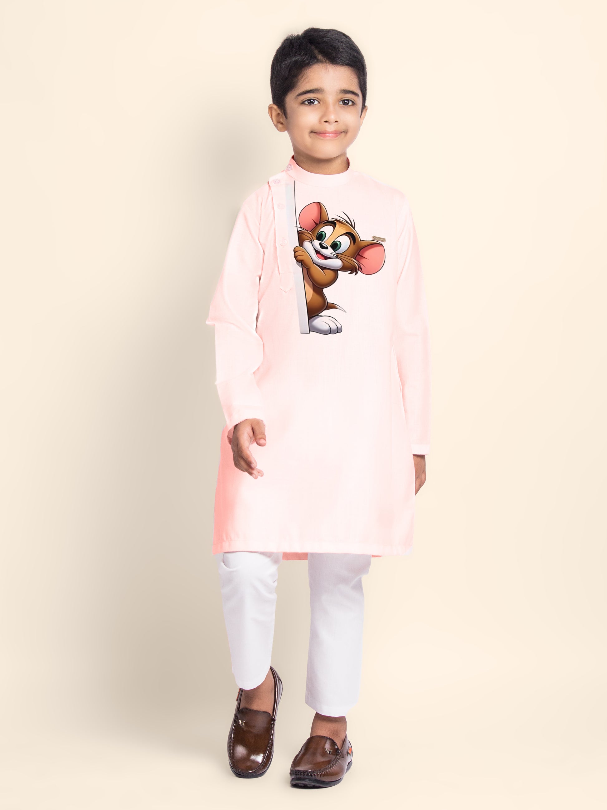 A charming pink cotton kurta pyjama set featuring a serene Lord Krishna print and side placket design. Perfect for festive occasions, cultural celebrations, or traditional gatherings, this outfit blends comfort with elegance for your young one.