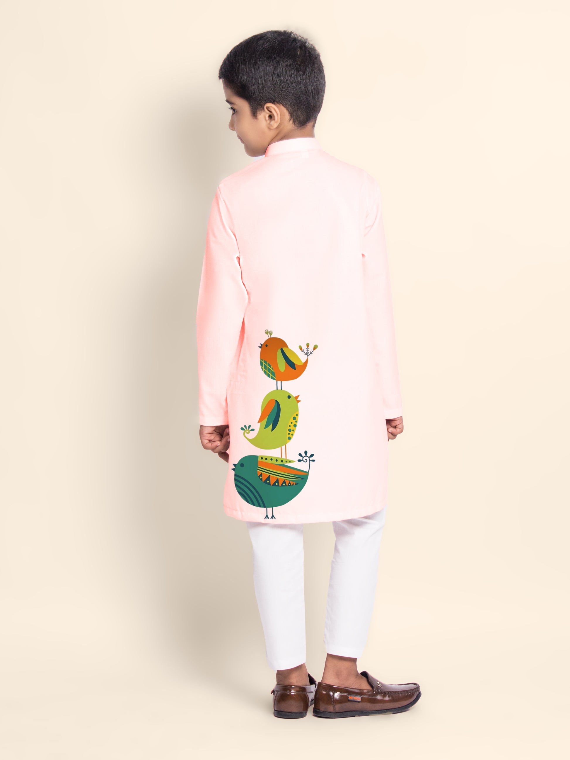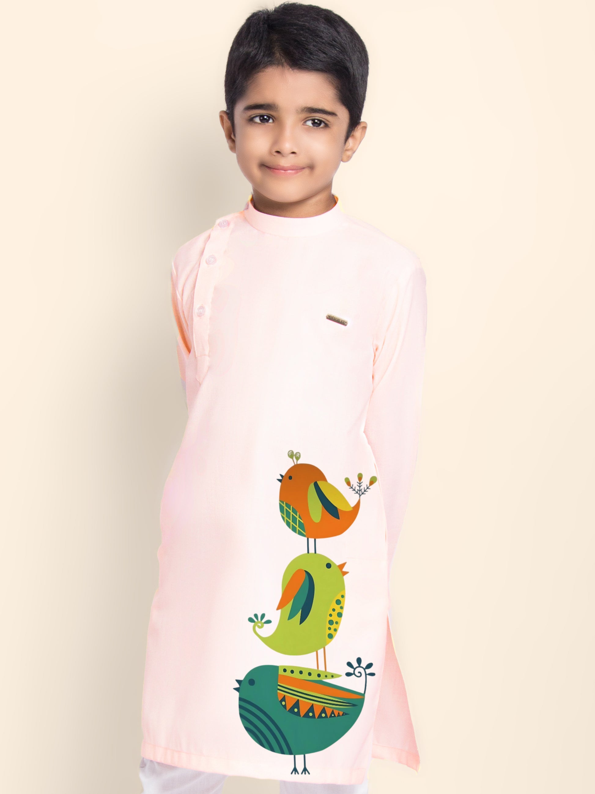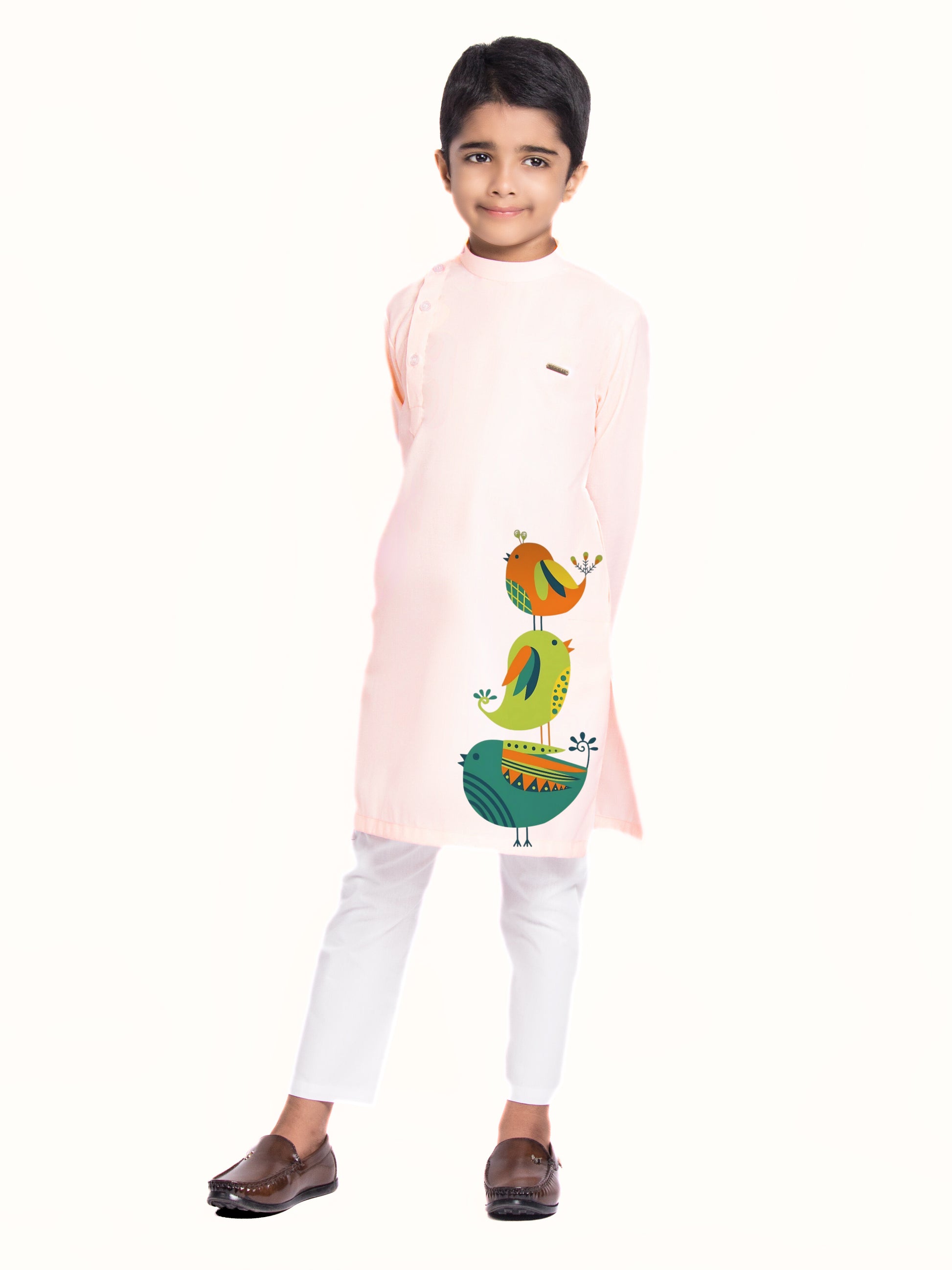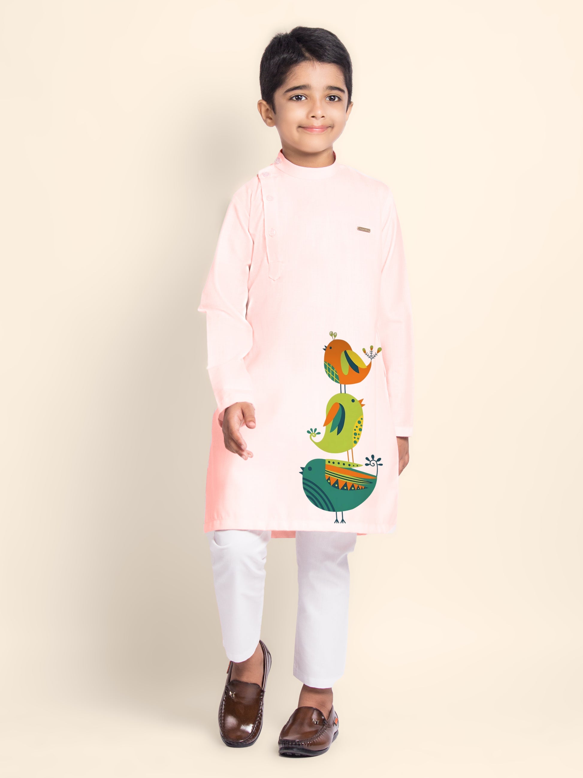 A charming pink cotton kurta pyjama set featuring a serene Lord Krishna print and side placket design. Perfect for festive occasions, cultural celebrations, or traditional gatherings, this outfit blends comfort with elegance for your young one.