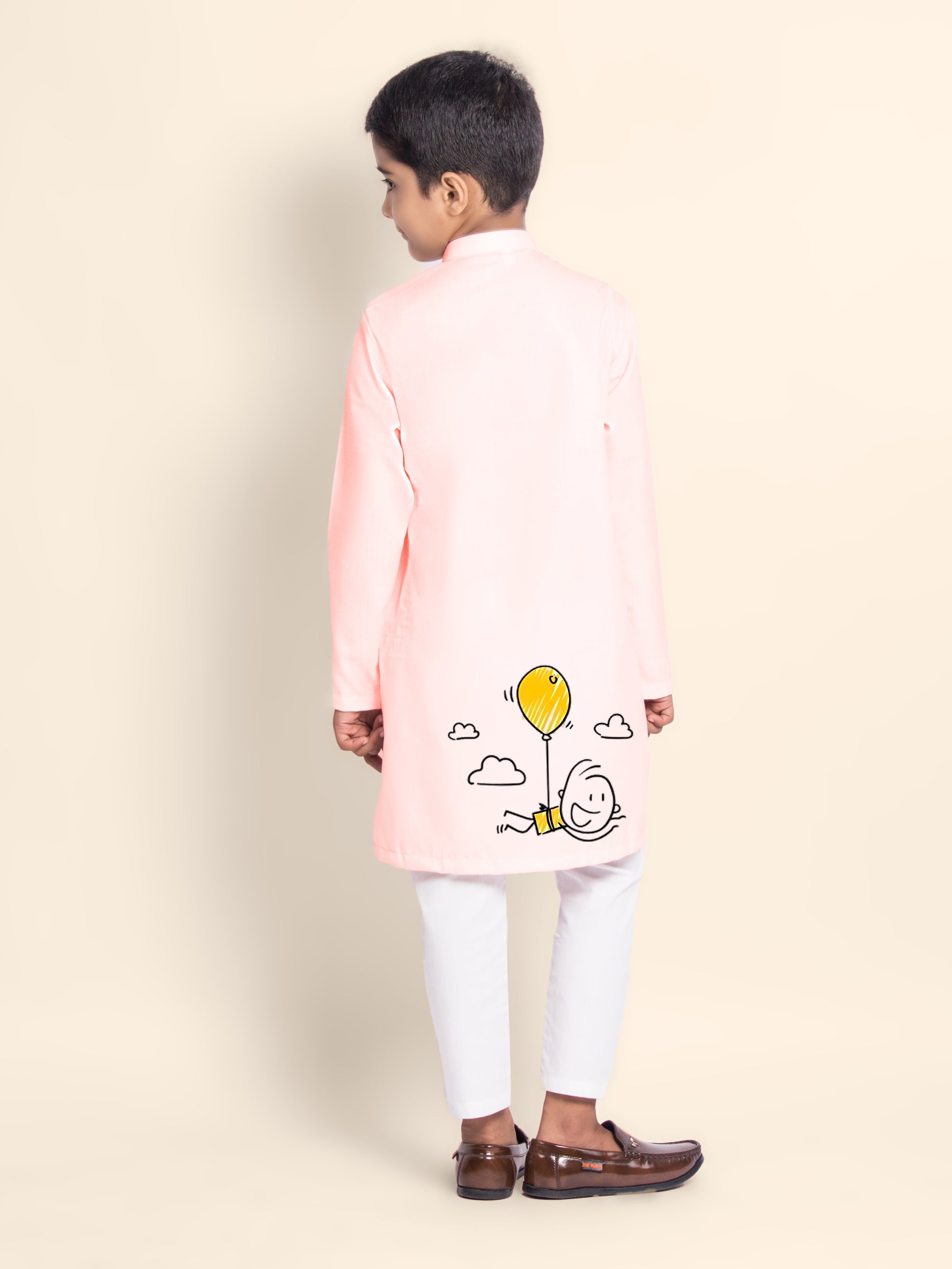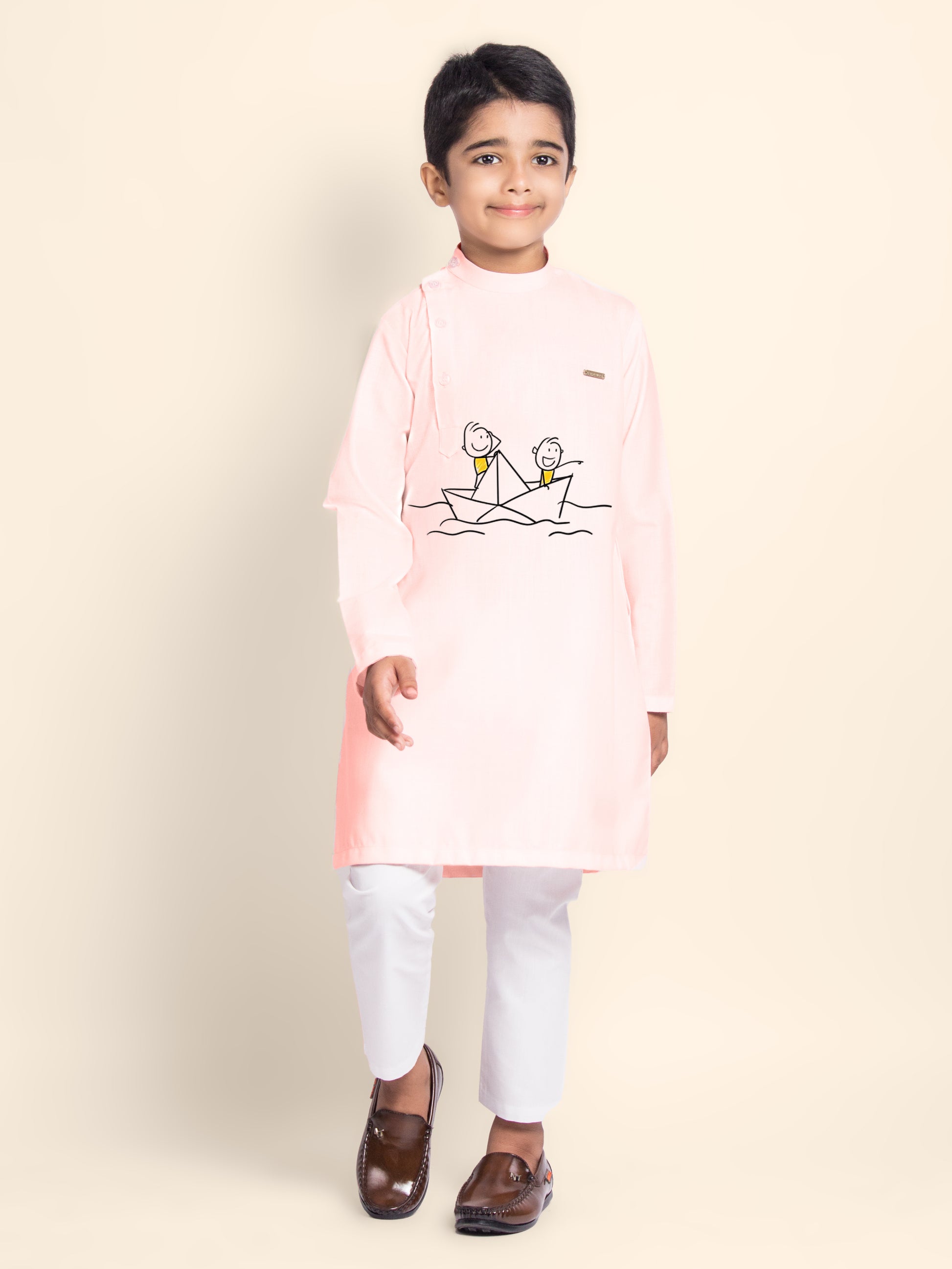 A charming pink cotton kurta pyjama set featuring a serene Lord Krishna print and side placket design. Perfect for festive occasions, cultural celebrations, or traditional gatherings, this outfit blends comfort with elegance for your young one.