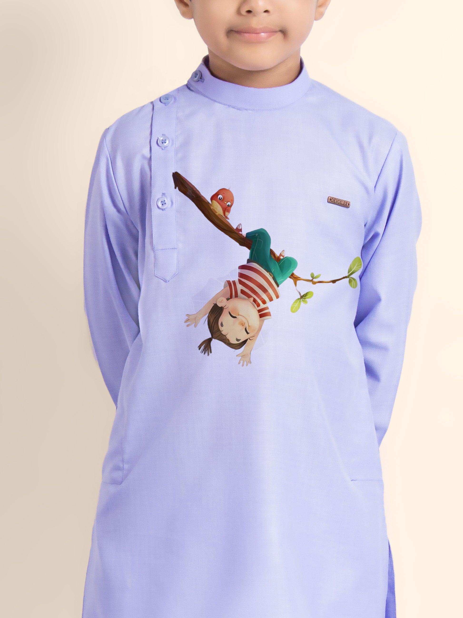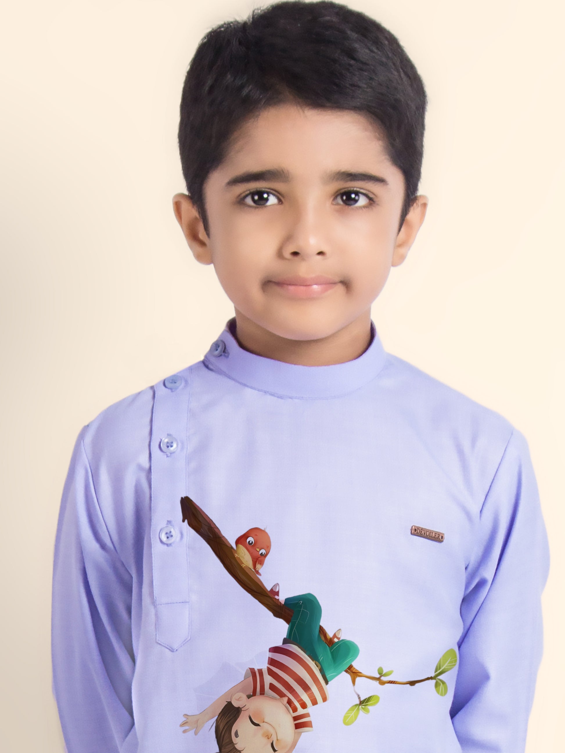 Add a playful charm to your child's ethnic wardrobe with this elegant purple kurta and white pyjama set. Crafted from Cotton fabric, the kurta features a delightful printed design that blends traditional elegance with a touch of whimsy, making it perfect for festive and special occasions.