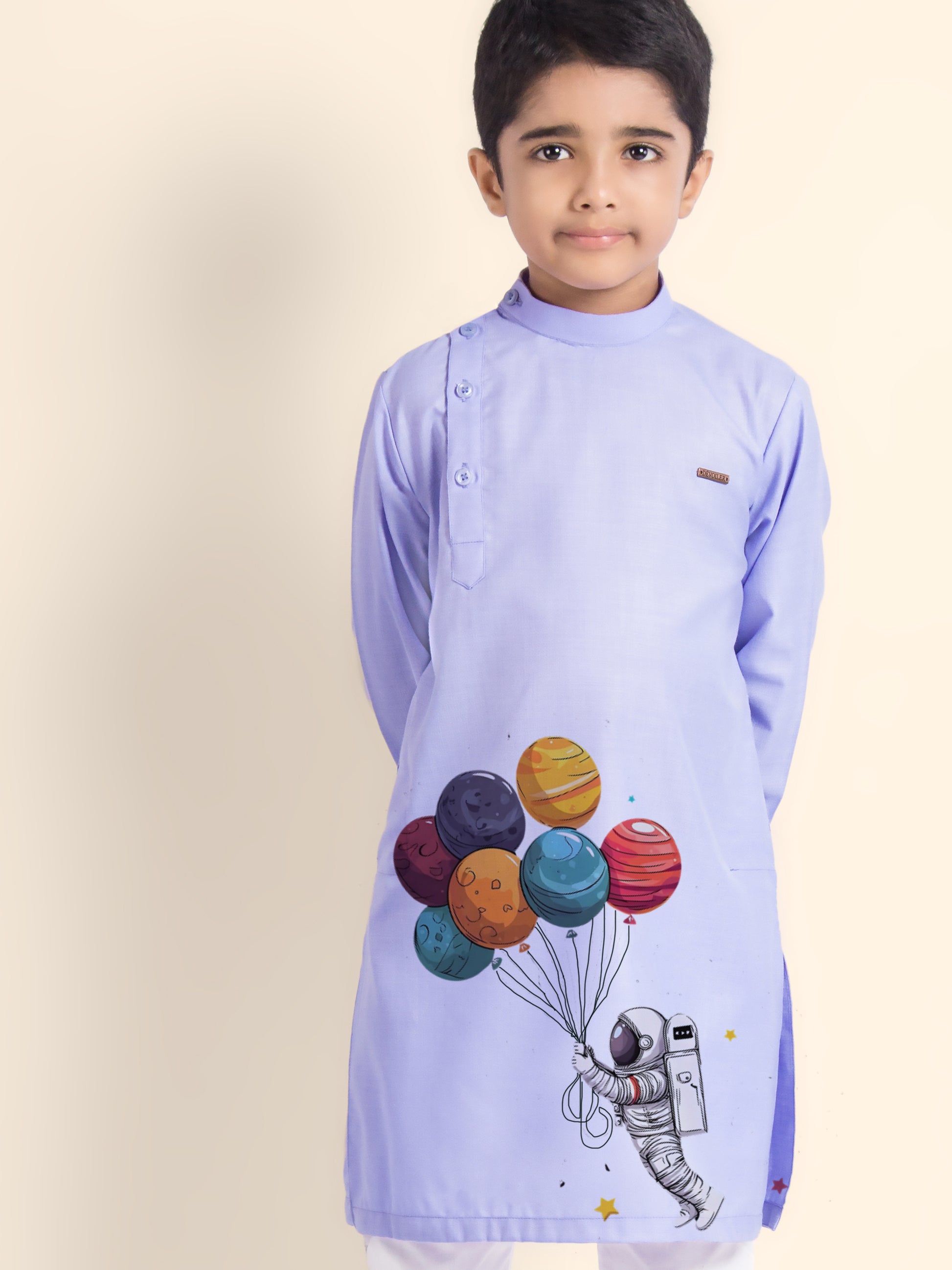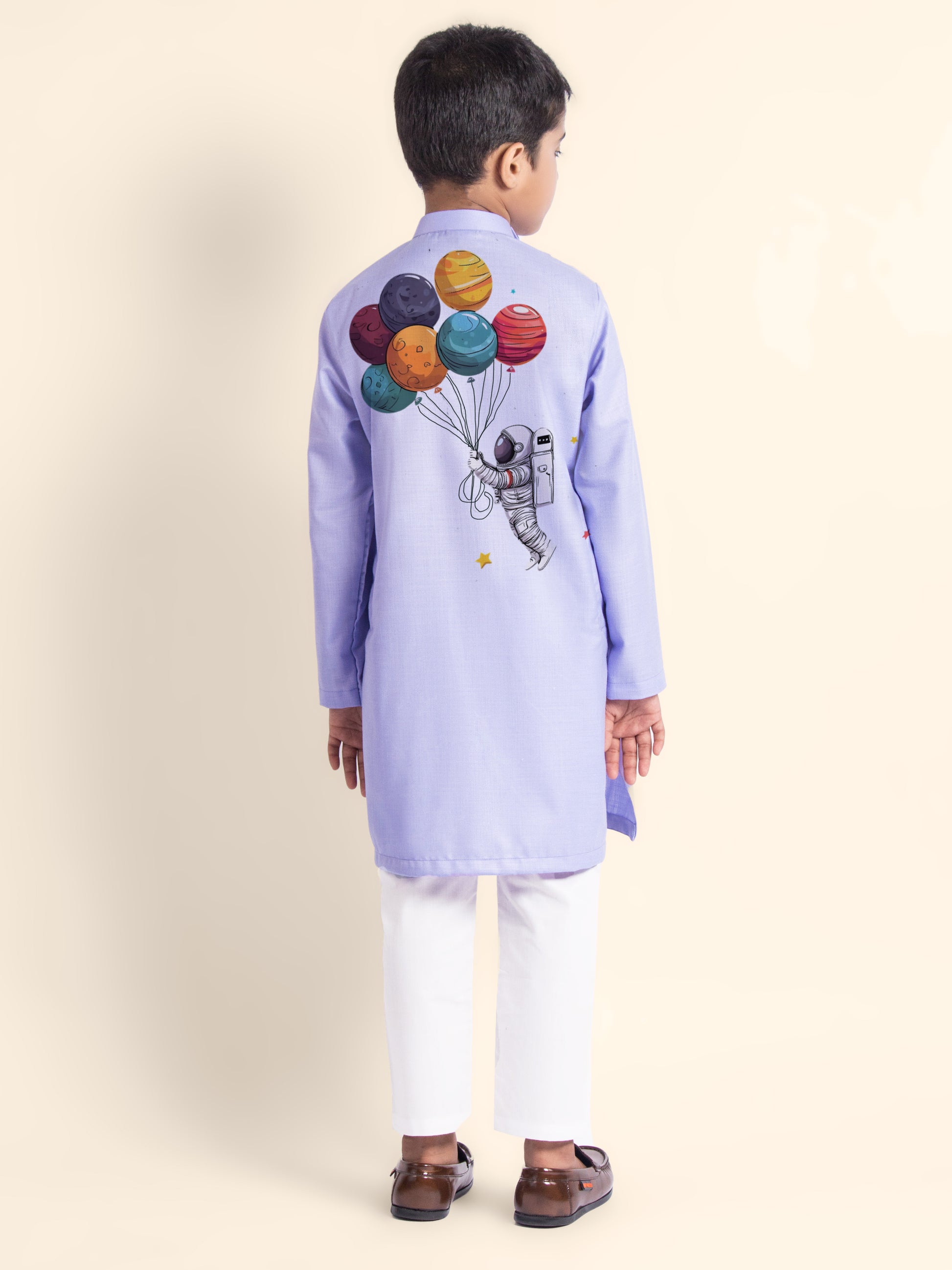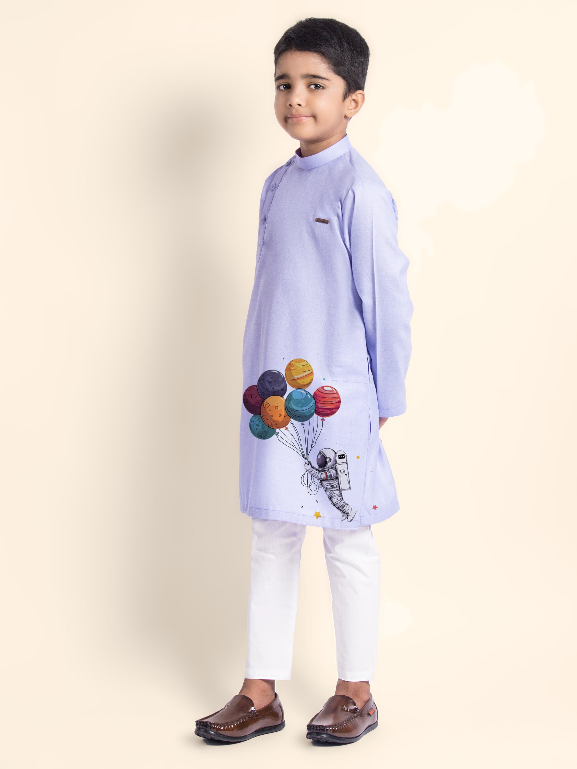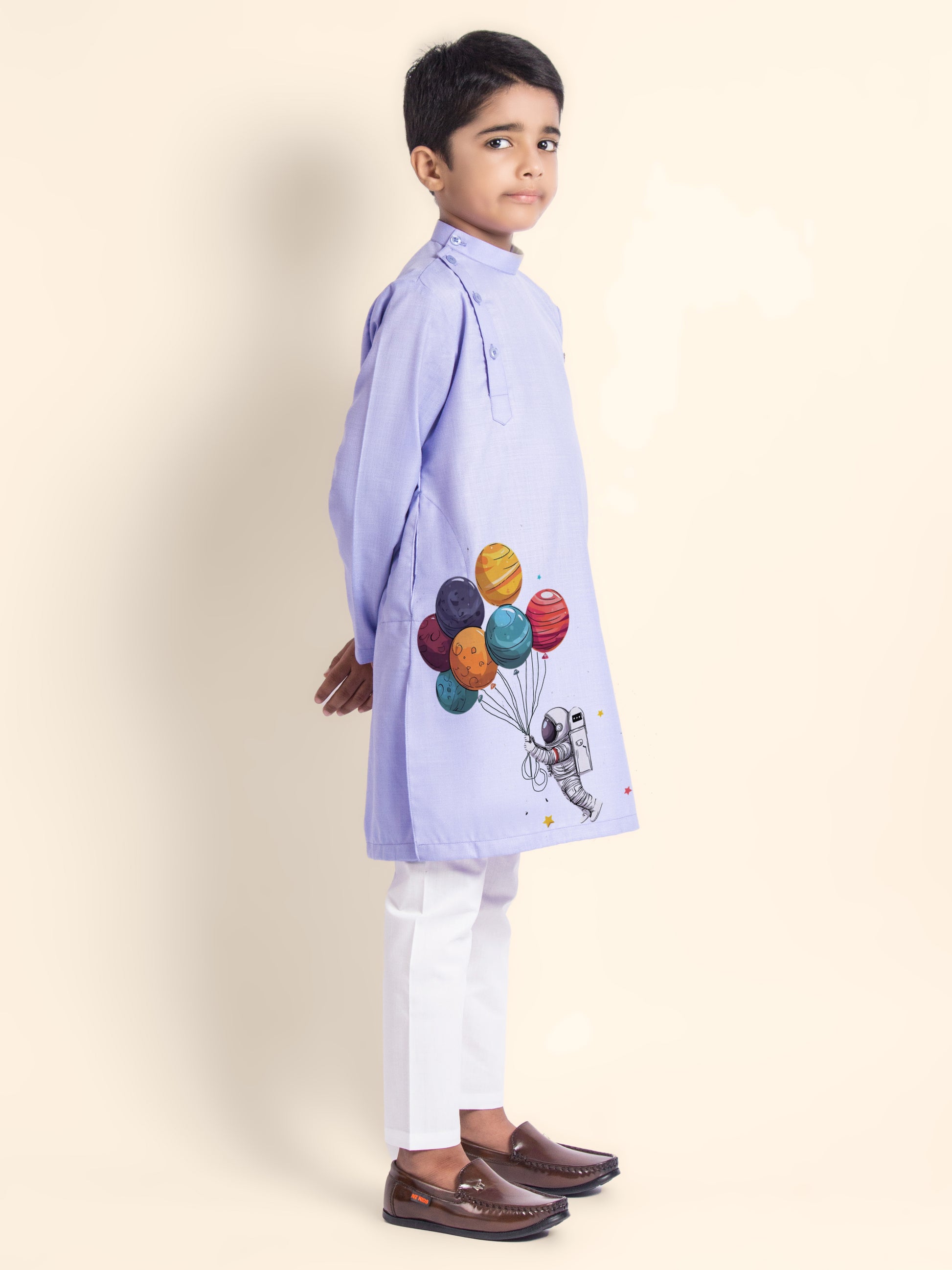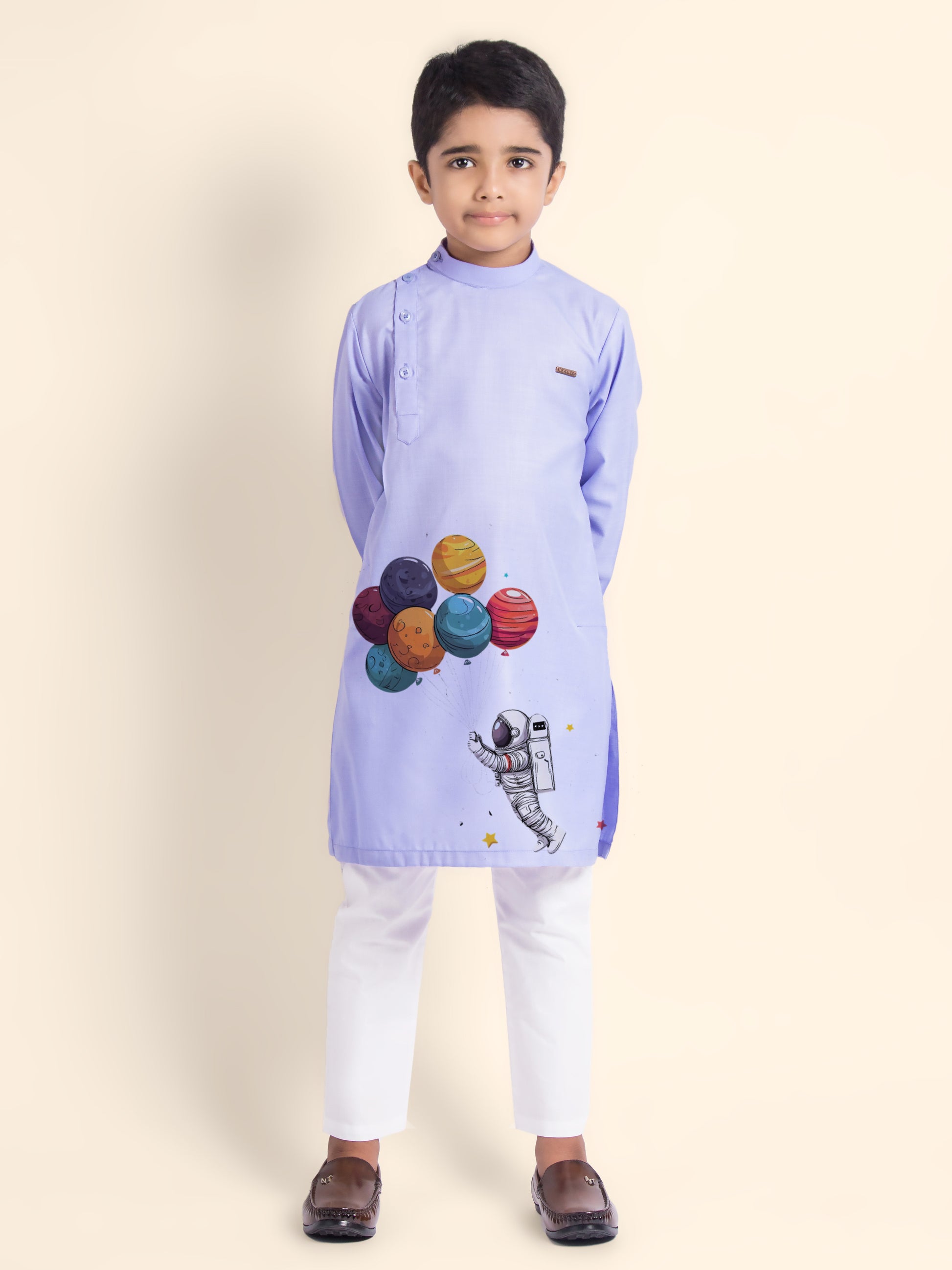 Pair this adorable kurta-pyjama set with classic loafers or traditional mojaris to create a smart and festive look. Ideal for weddings, festivals, and family gatherings.