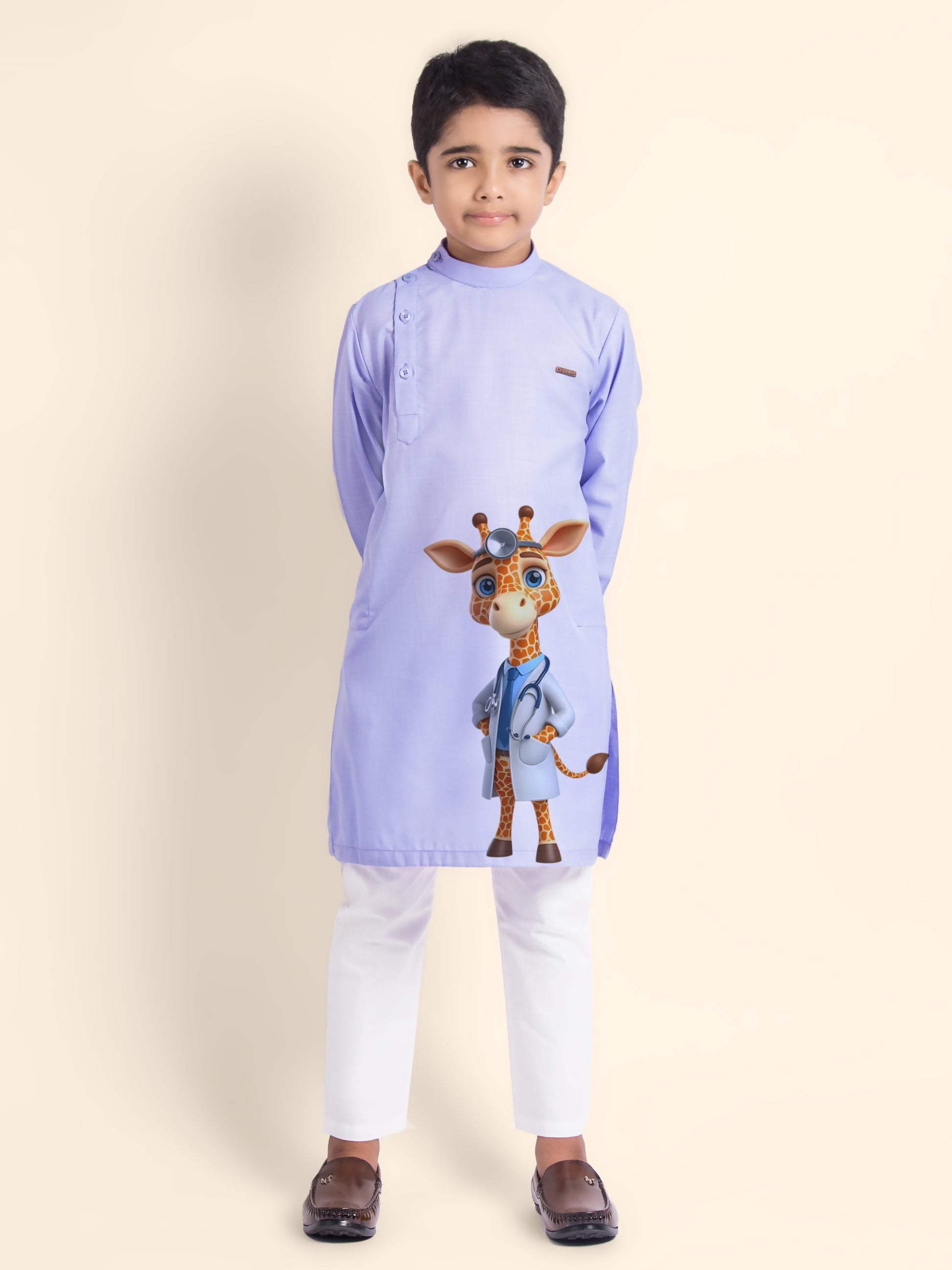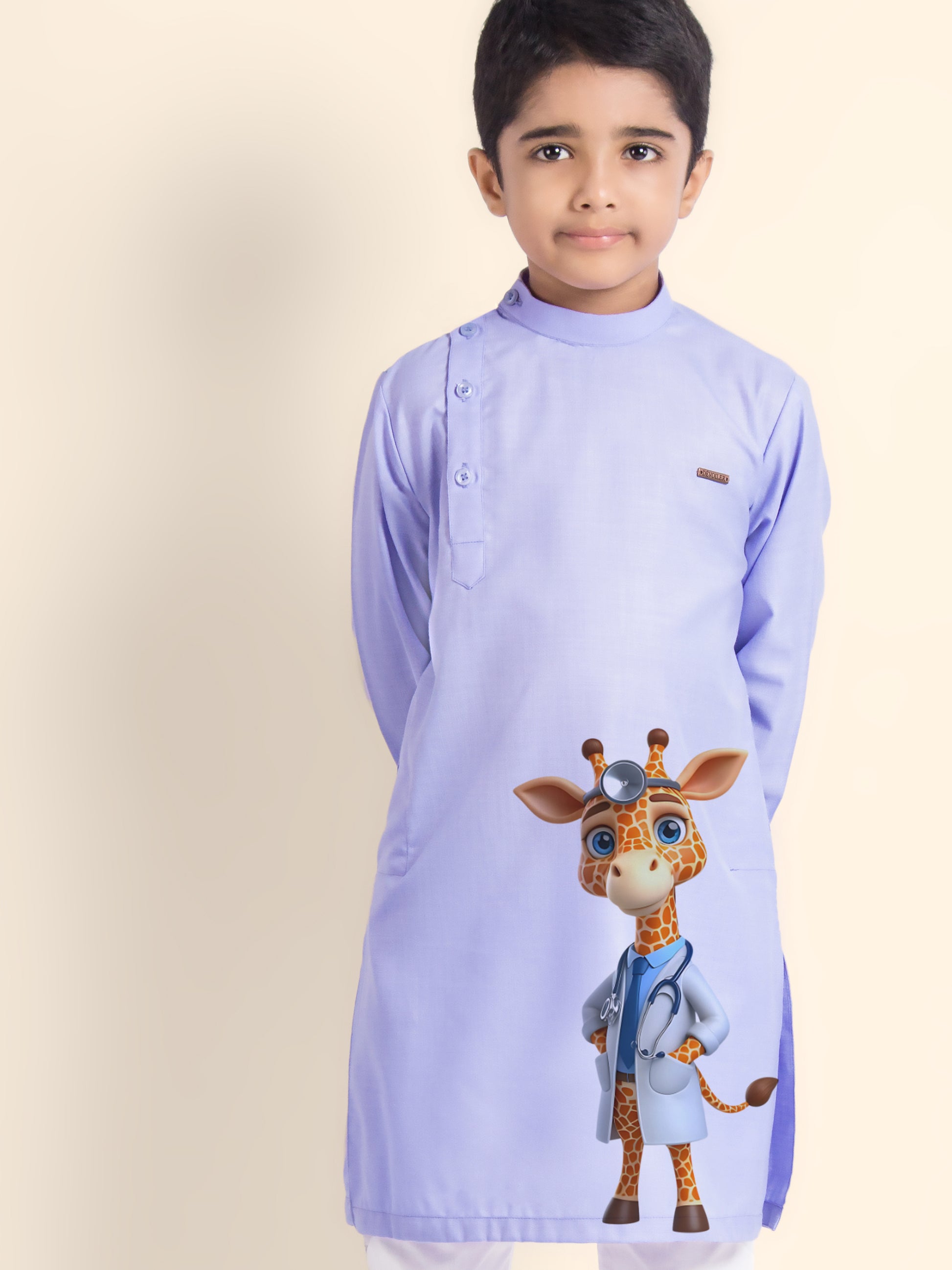 Add a playful charm to your child's ethnic wardrobe with this elegant purple kurta and white pyjama set. Crafted from Cotton fabric, the kurta features a delightful printed design that blends traditional elegance with a touch of whimsy, making it perfect for festive and special occasions.