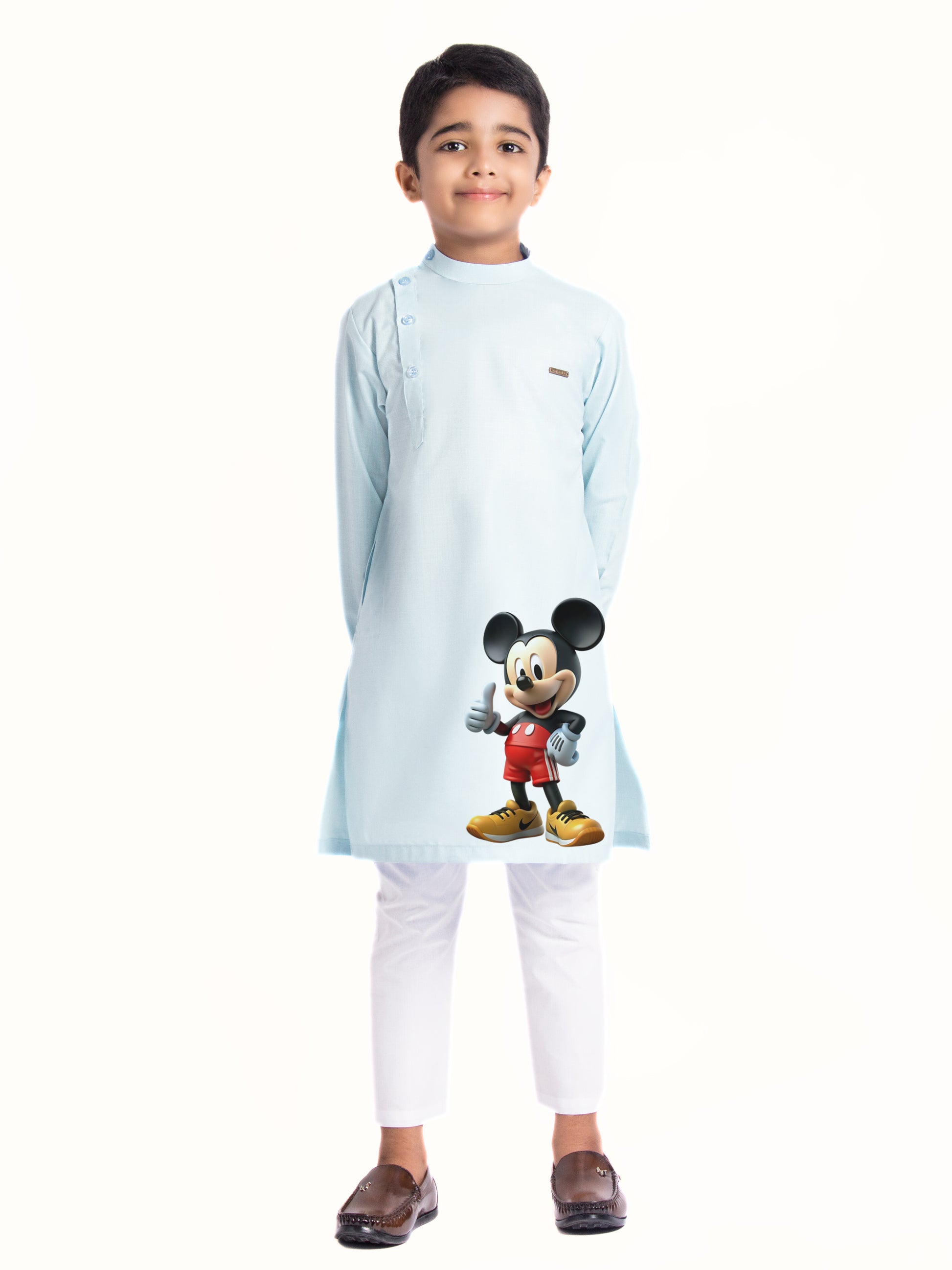 Let your child exude elegance and charm with this adorable sky blue kurta and white pyjama set. Tailored from soft cotton fabric, the kurta features a subtle printed design, making it an excellent choice for festive occasions and cultural events.