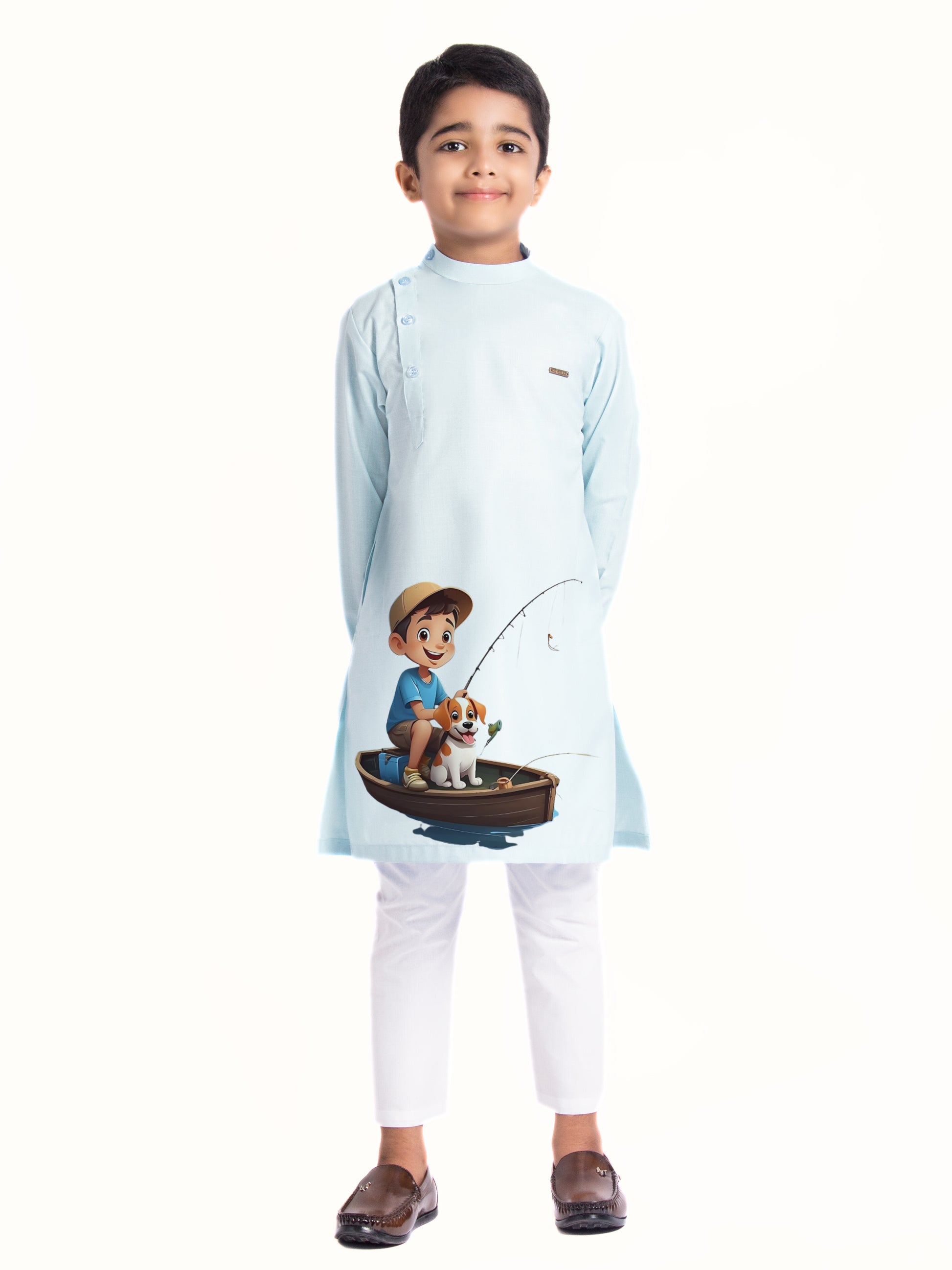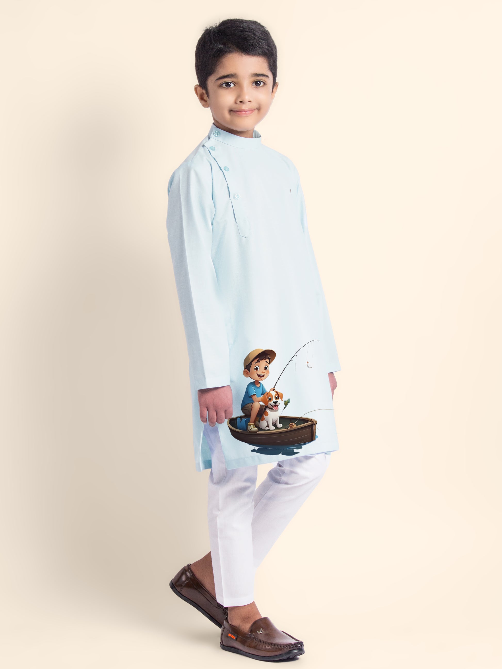 Boys Sky Blue Printed Kurta With Pyjama Set
