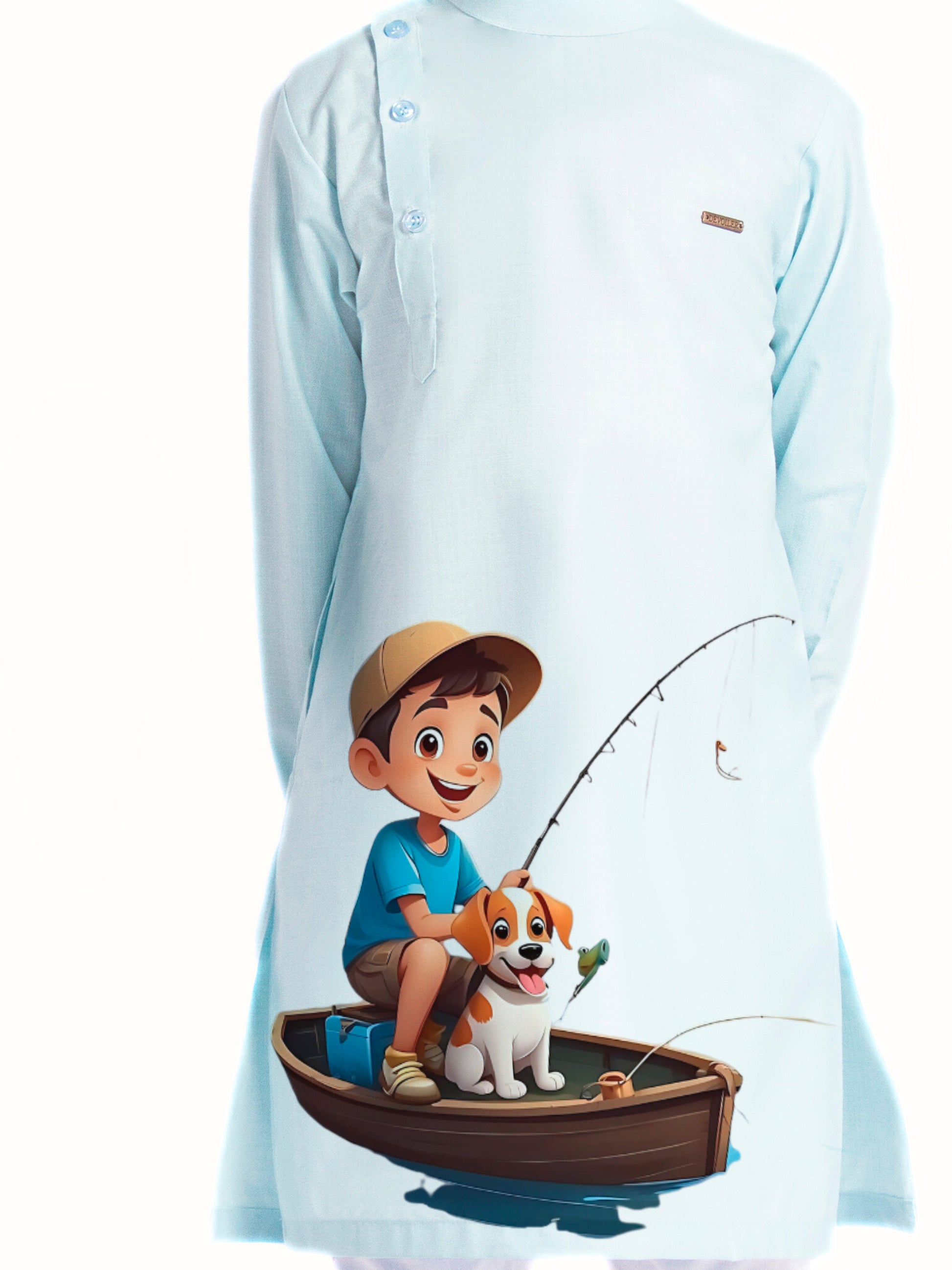 Let your child exude elegance and charm with this adorable sky blue kurta and white pyjama set. Tailored from soft cotton fabric, the kurta features a subtle printed design, making it an excellent choice for festive occasions and cultural events.
