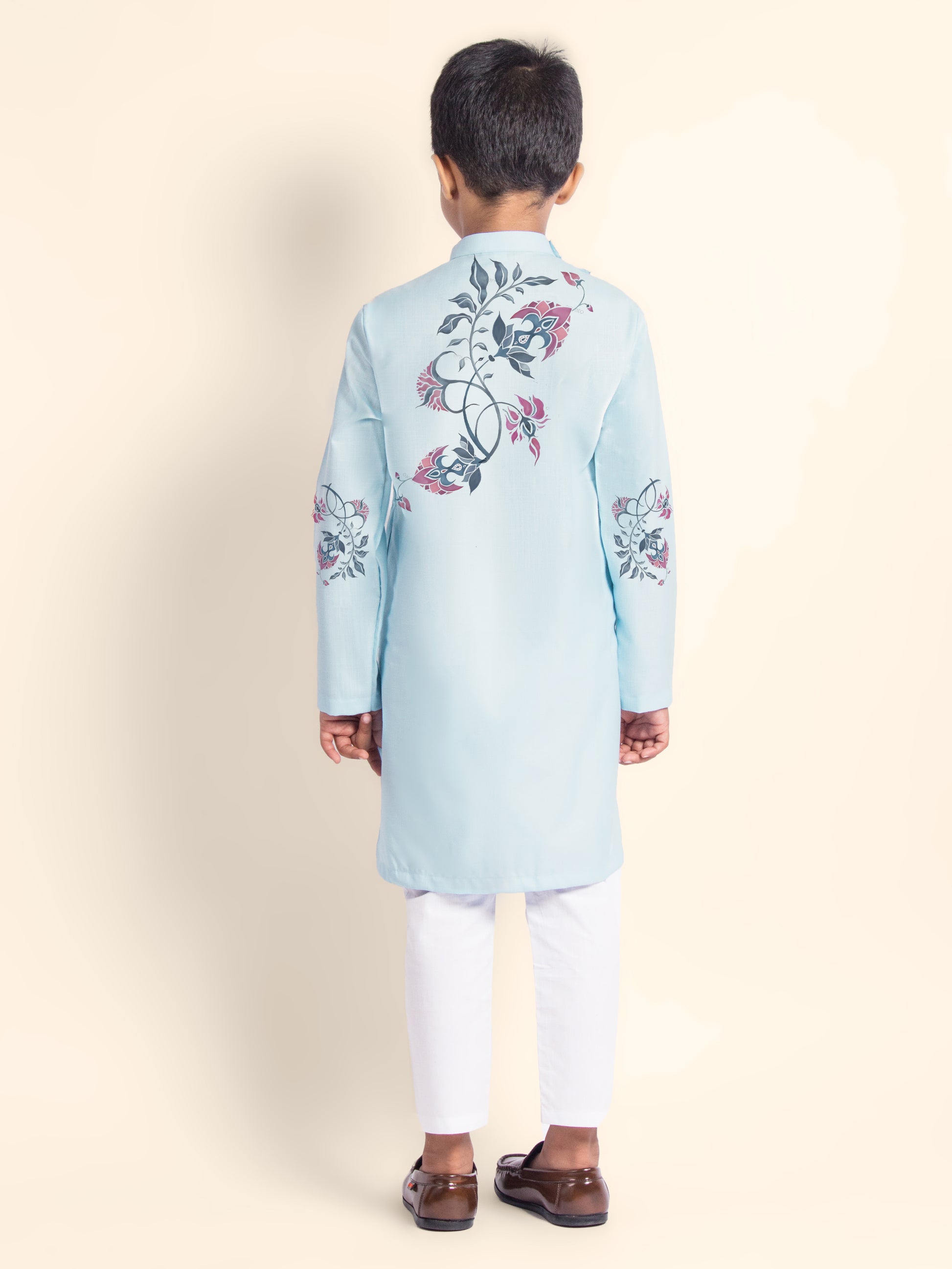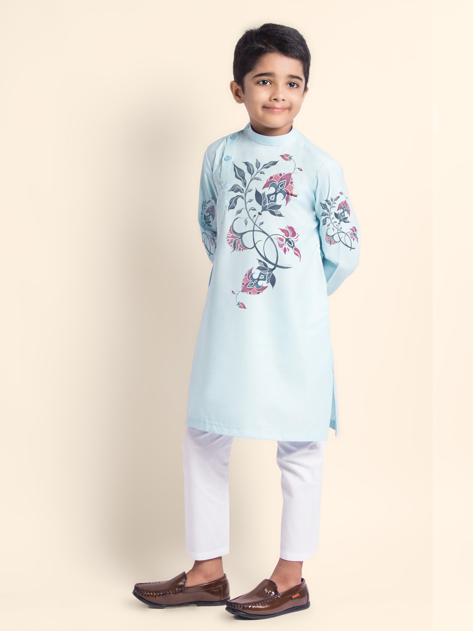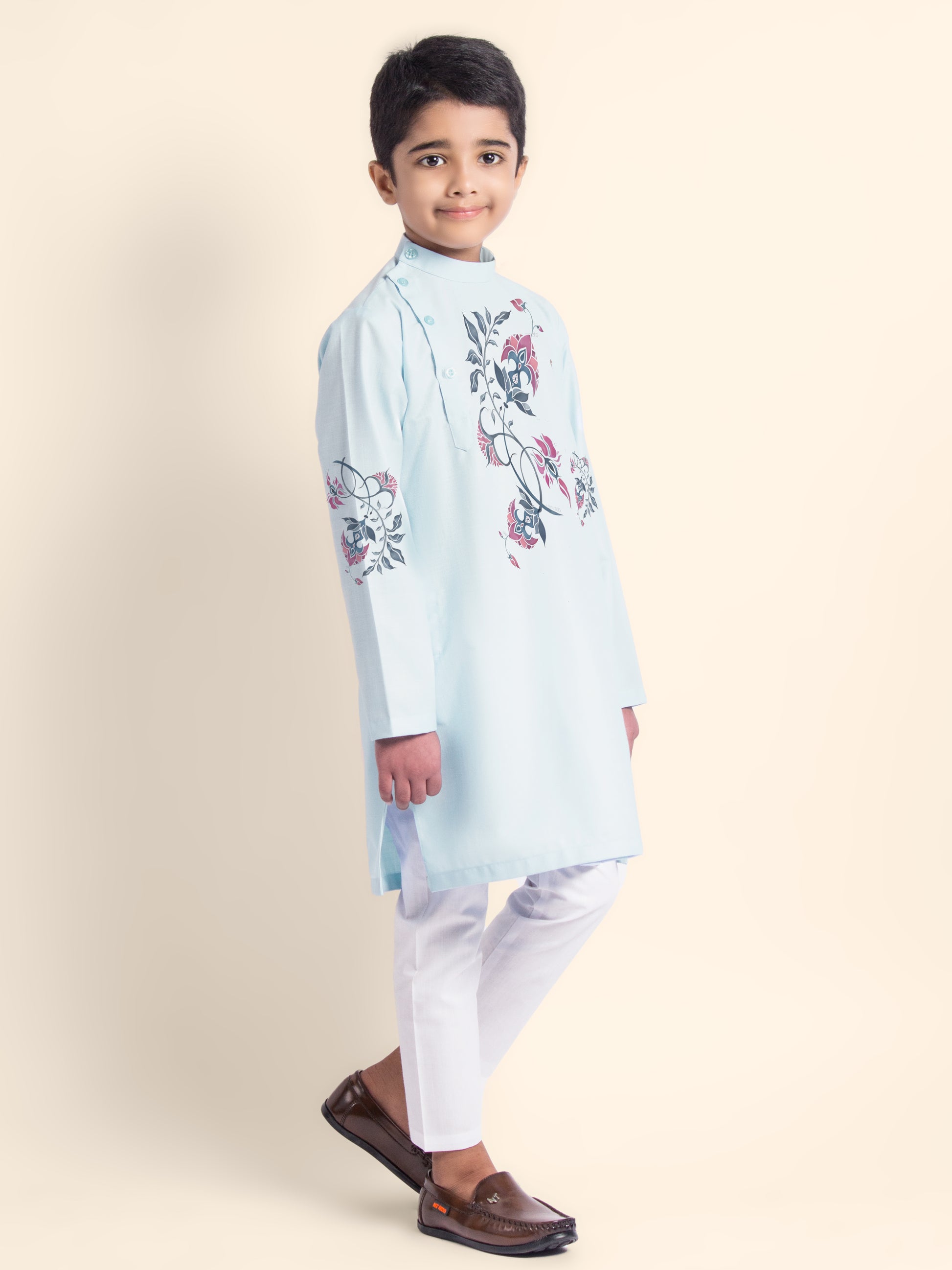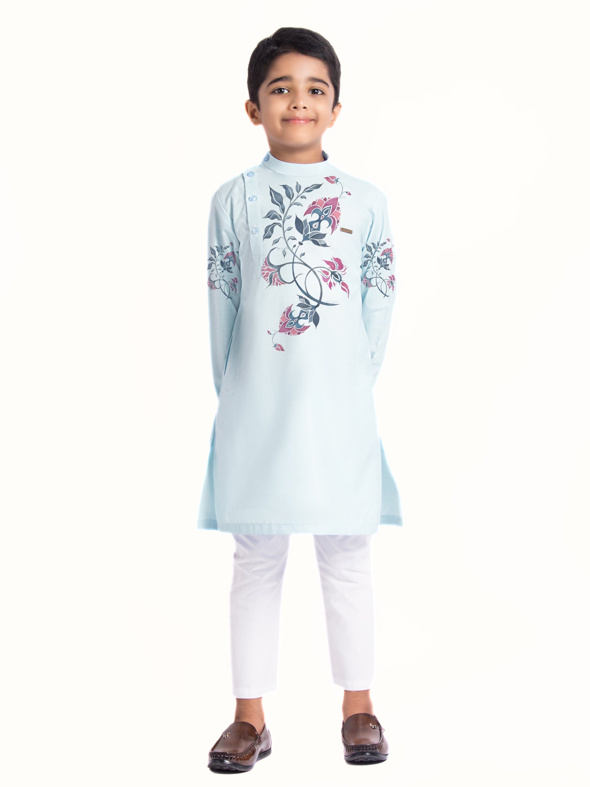 Let your child exude elegance and charm with this adorable sky blue kurta and white pyjama set. Tailored from soft cotton fabric, the kurta features a subtle printed design, making it an excellent choice for festive occasions and cultural events.