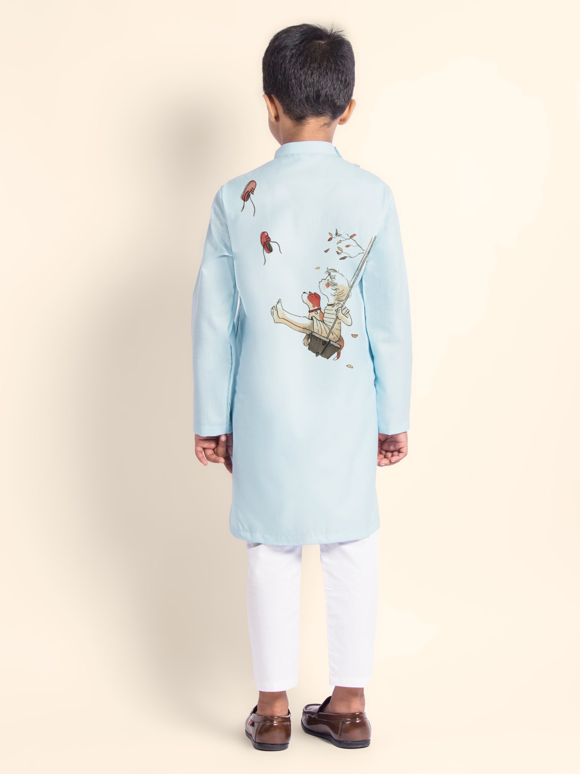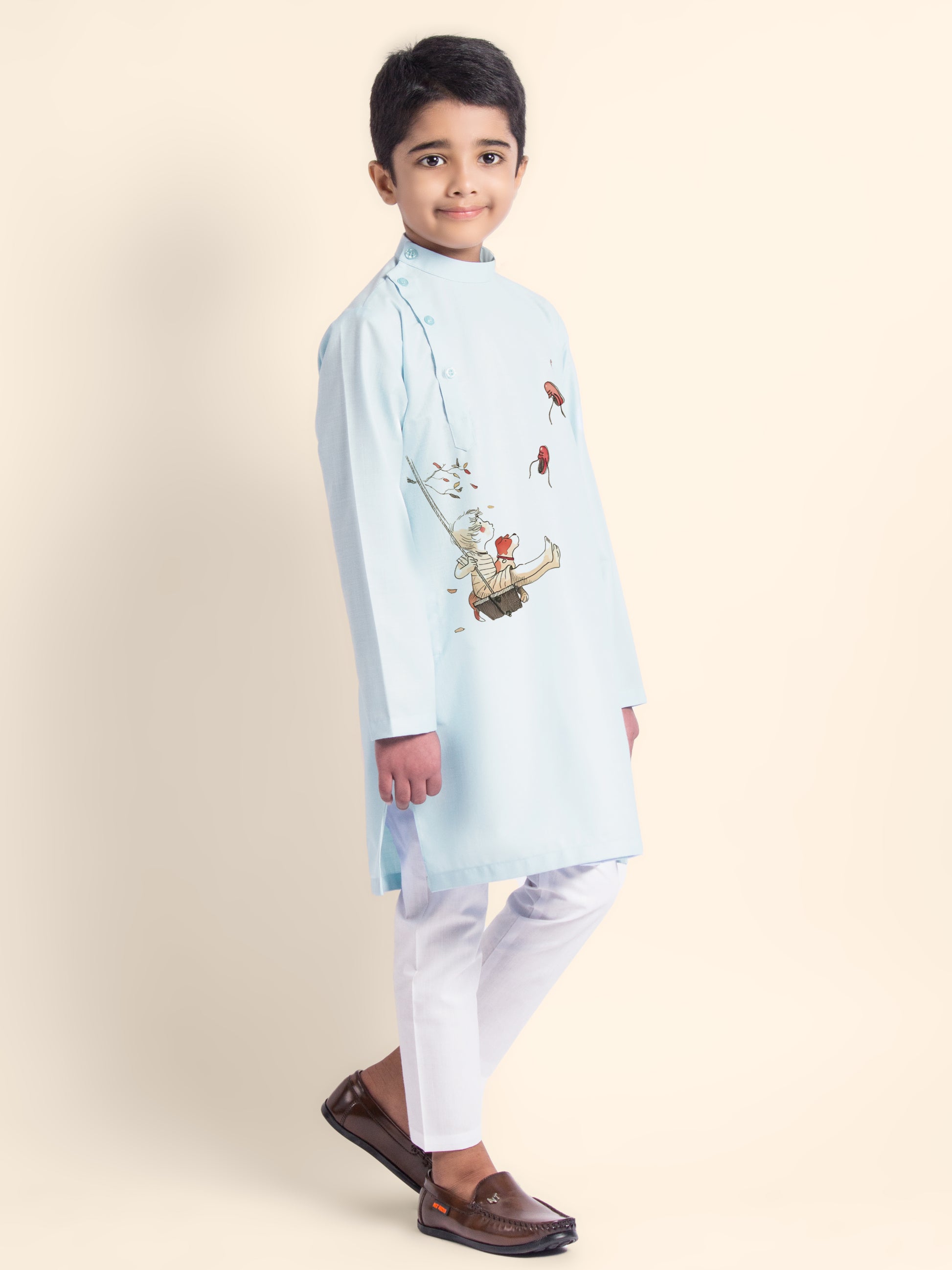 Boys Sky Blue Printed Kurta With Pyjama Set