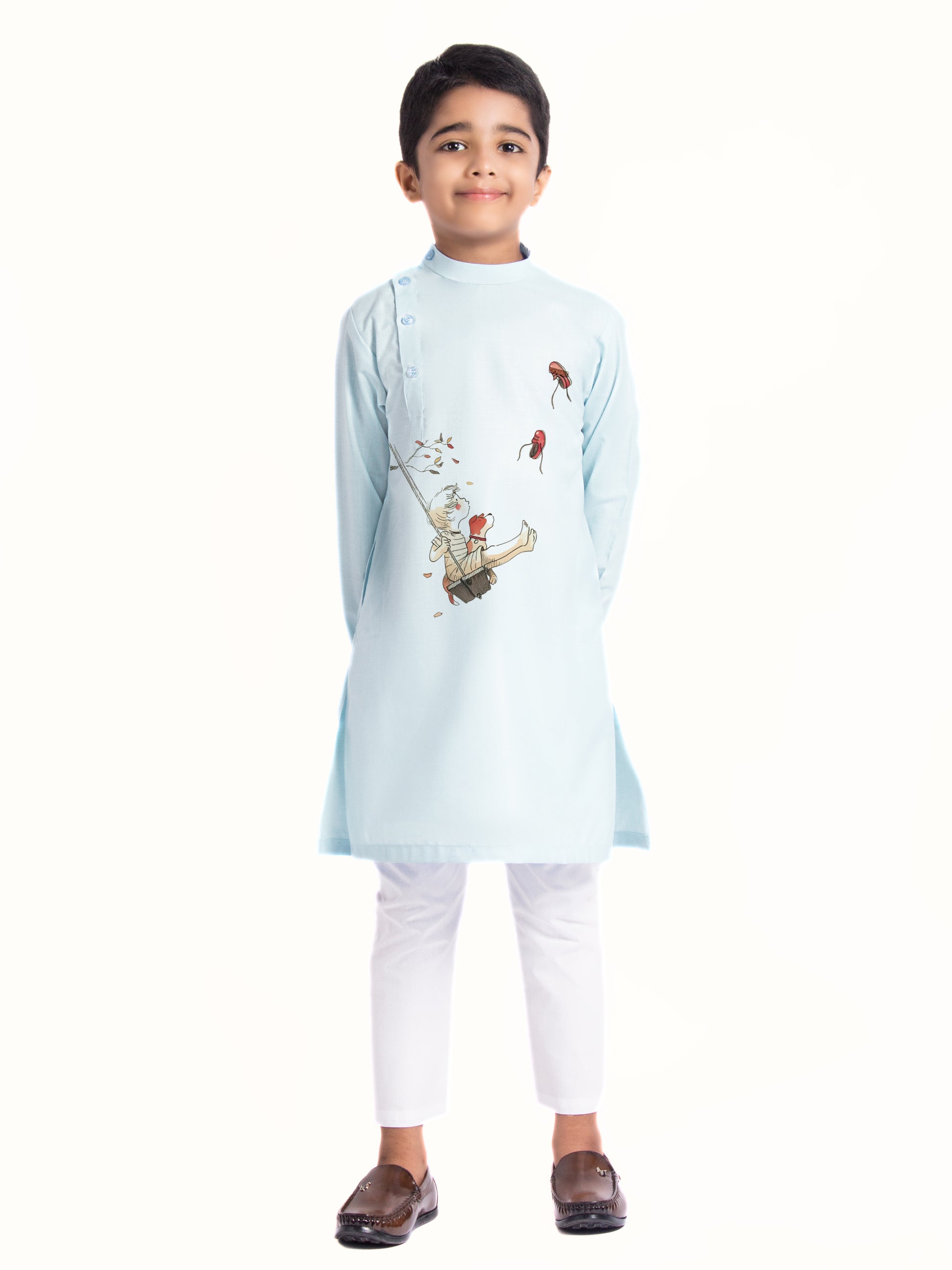 Let your child exude elegance and charm with this adorable sky blue kurta and white pyjama set. Tailored from soft cotton fabric, the kurta features a subtle printed design, making it an excellent choice for festive occasions and cultural events.