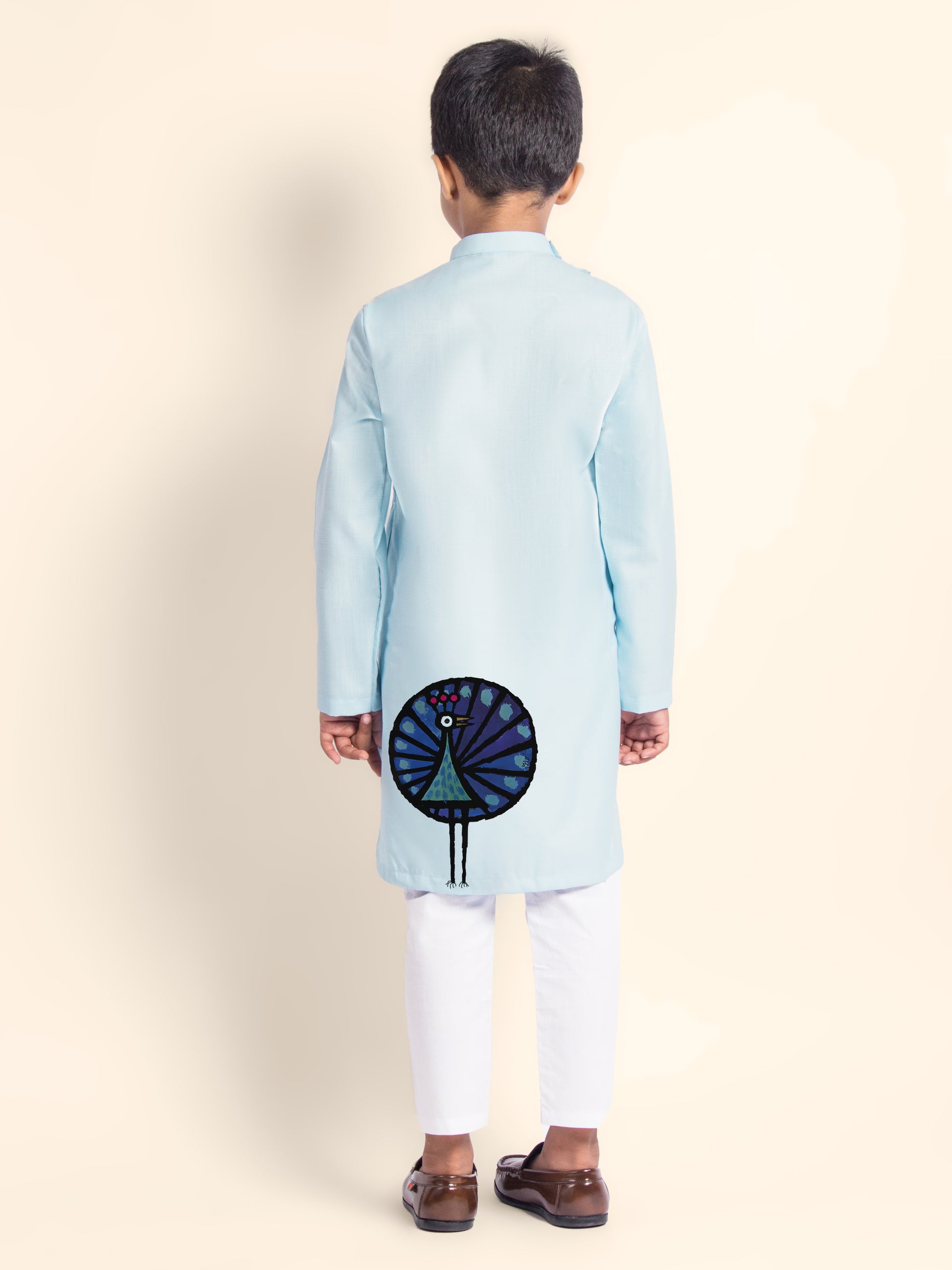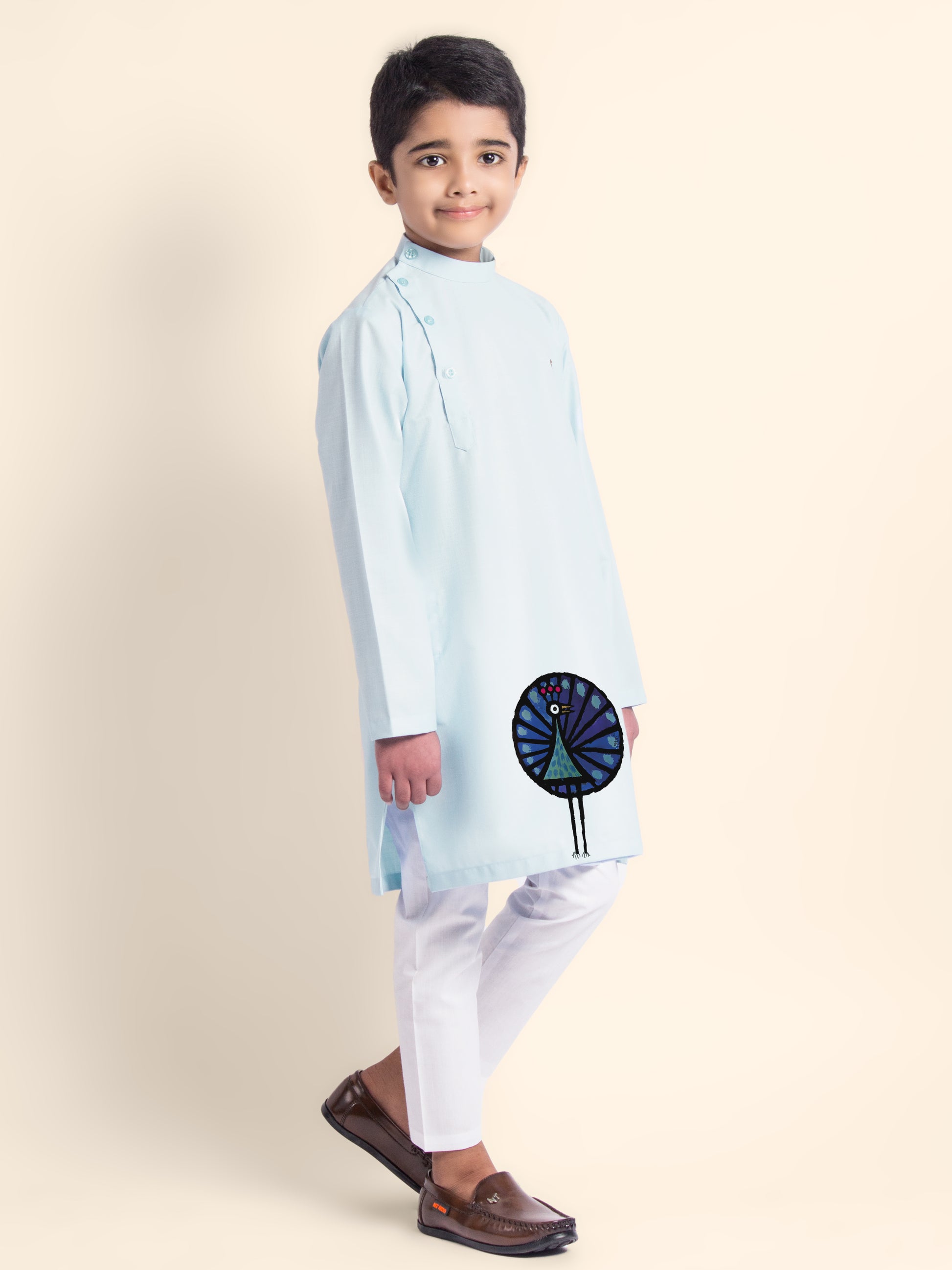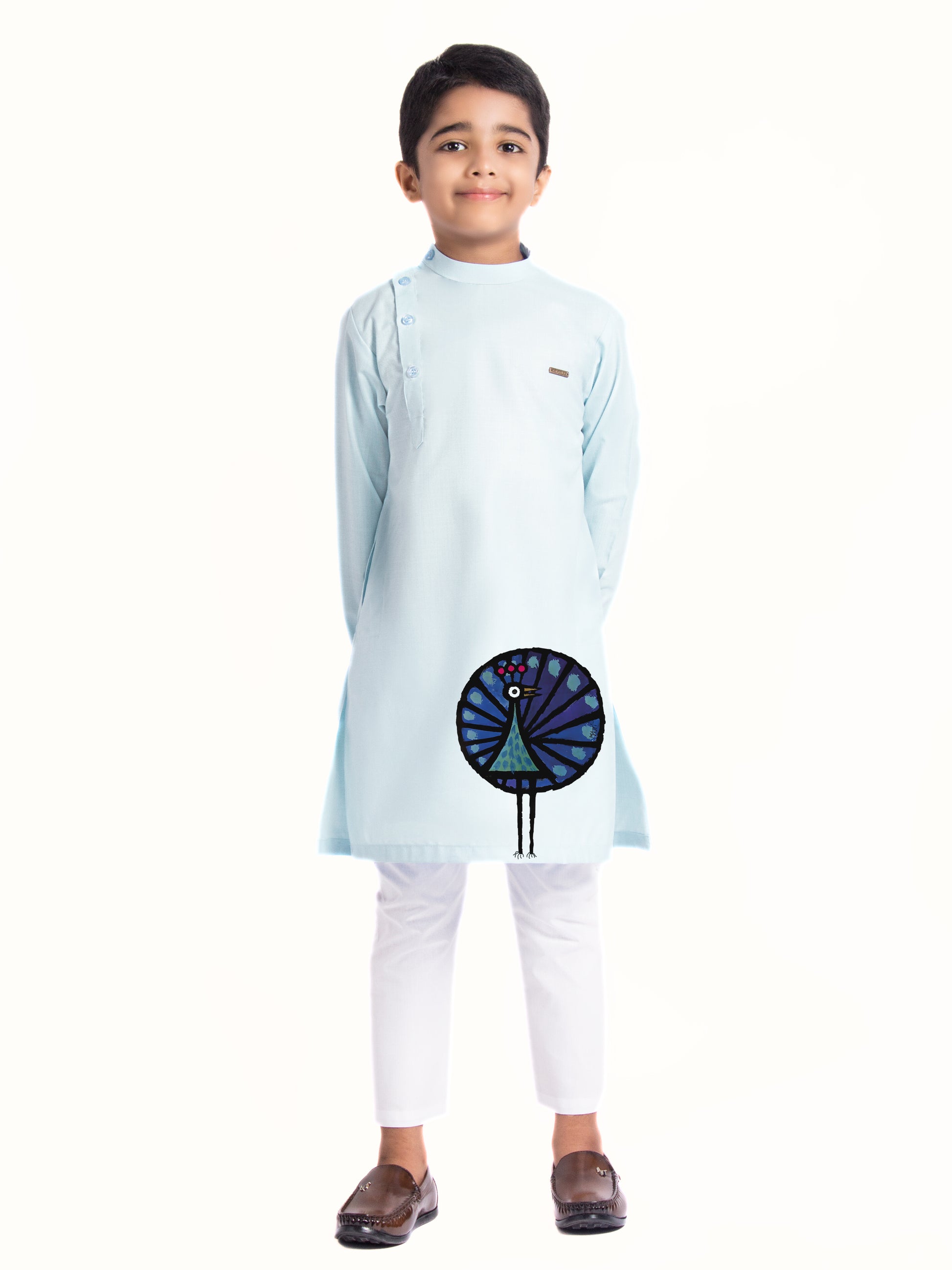 Let your child exude elegance and charm with this adorable sky blue kurta and white pyjama set. Tailored from soft cotton fabric, the kurta features a subtle printed design, making it an excellent choice for festive occasions and cultural events.