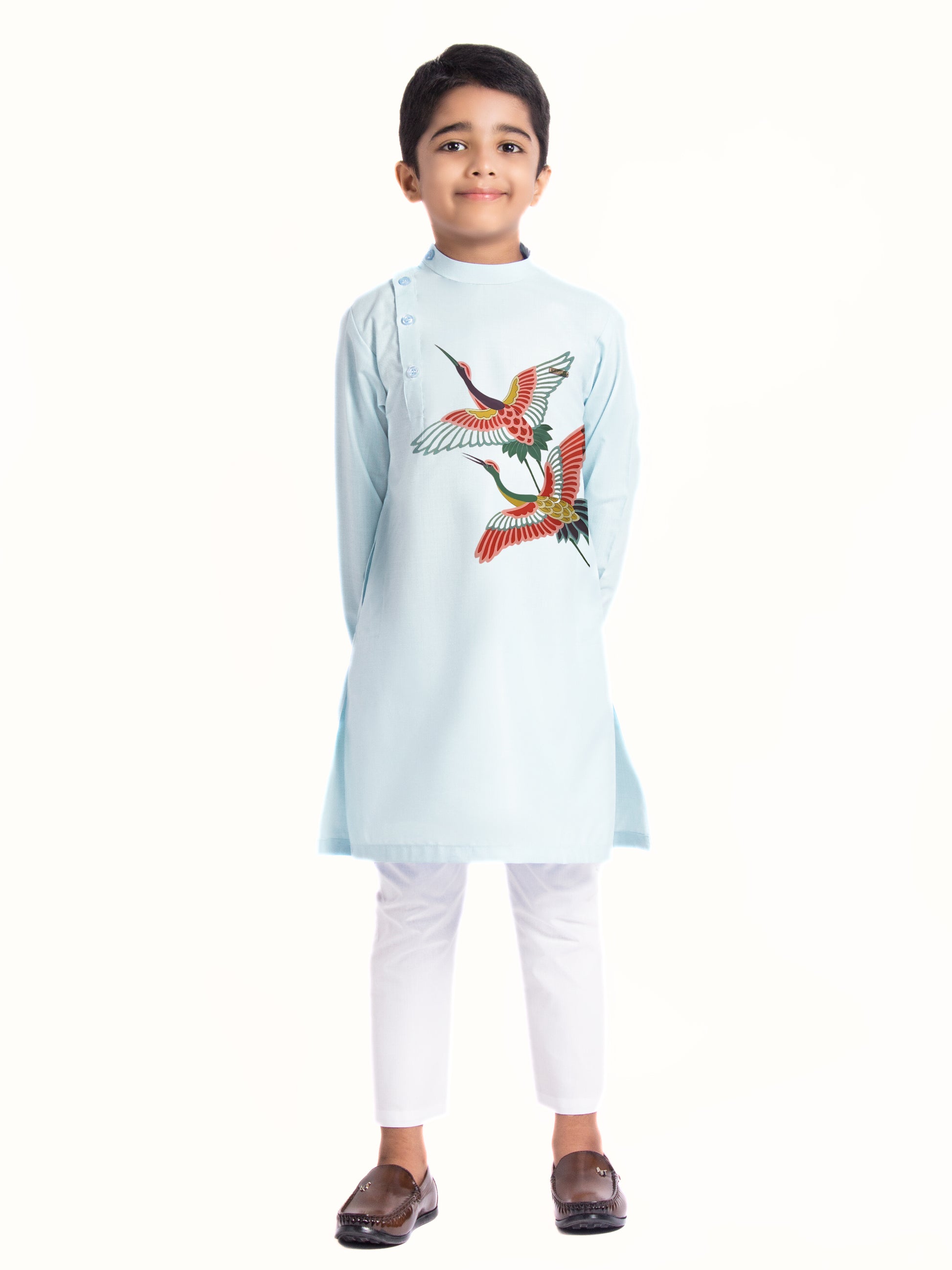 Let your child exude elegance and charm with this adorable sky blue kurta and white pyjama set. Tailored from soft cotton fabric, the kurta features a subtle printed design, making it an excellent choice for festive occasions and cultural events.