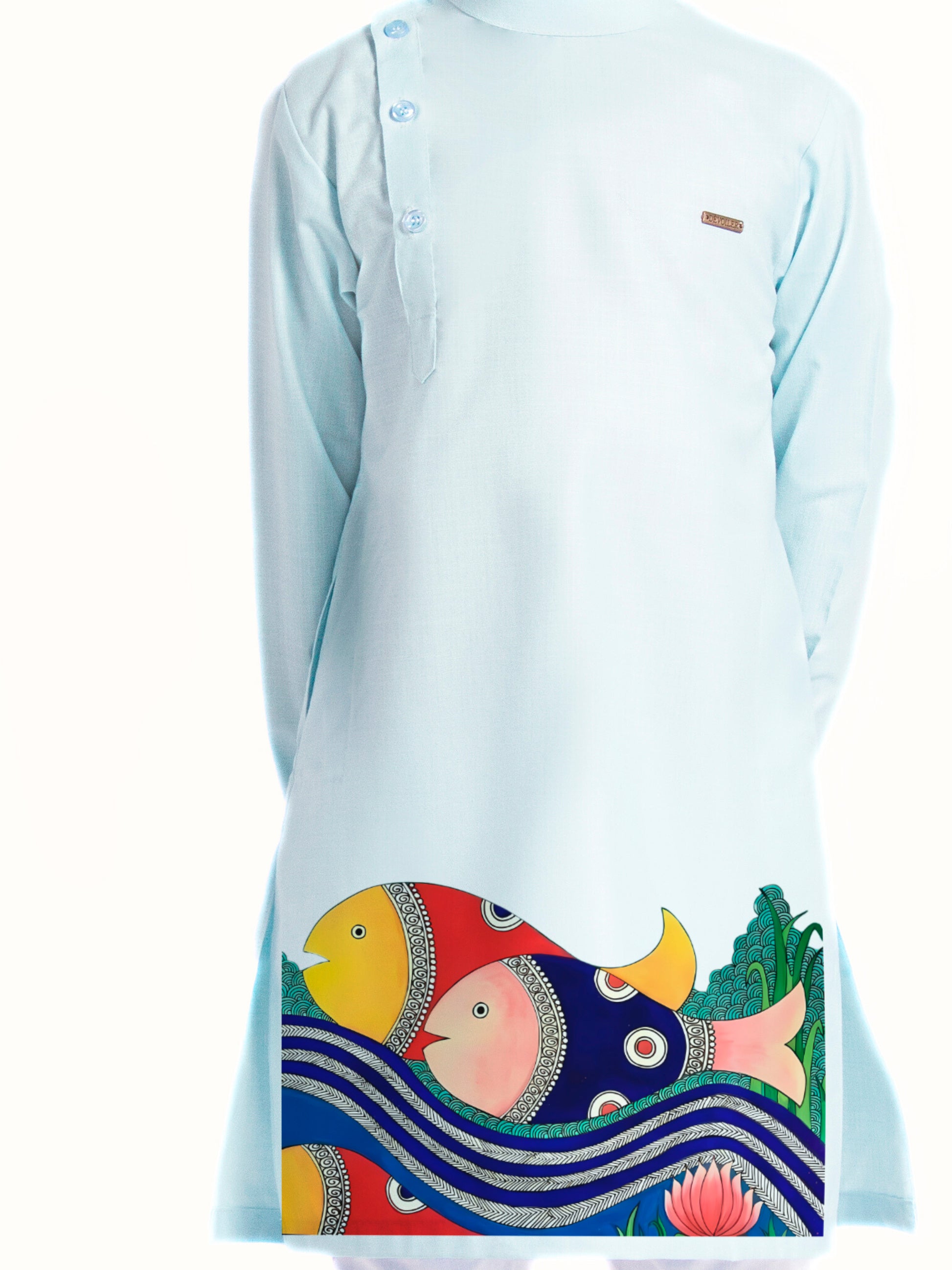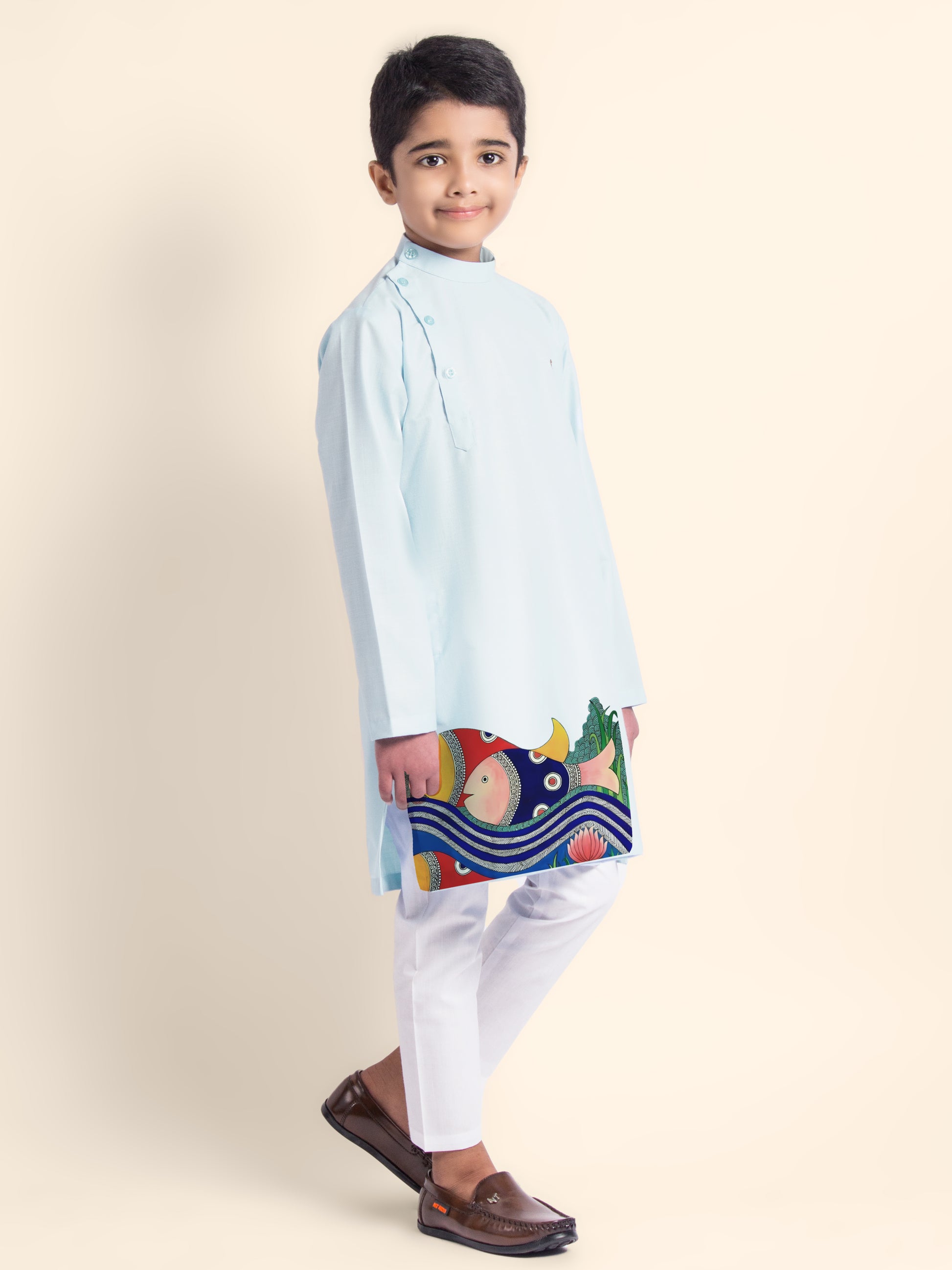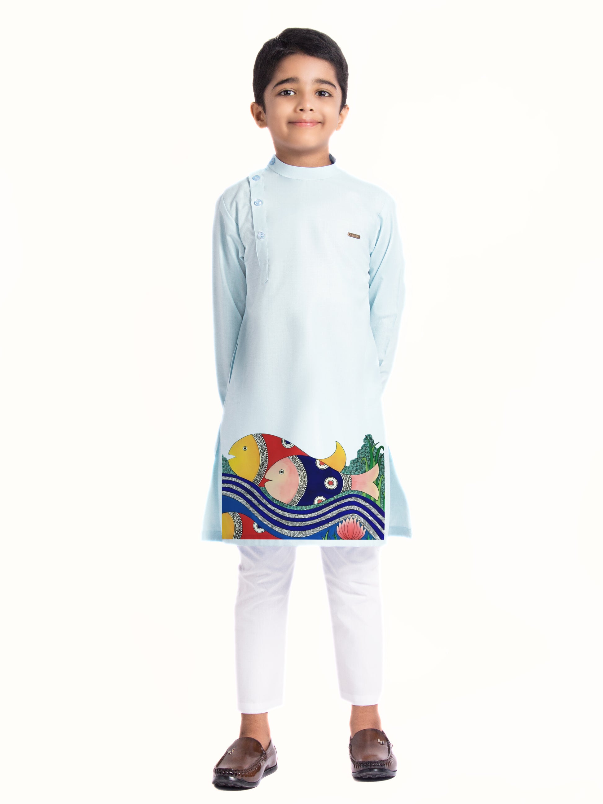 Let your child exude elegance and charm with this adorable sky blue kurta and white pyjama set. Tailored from soft cotton fabric, the kurta features a subtle printed design, making it an excellent choice for festive occasions and cultural events.