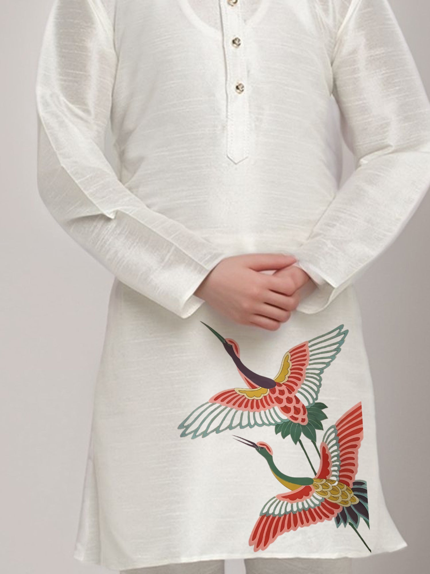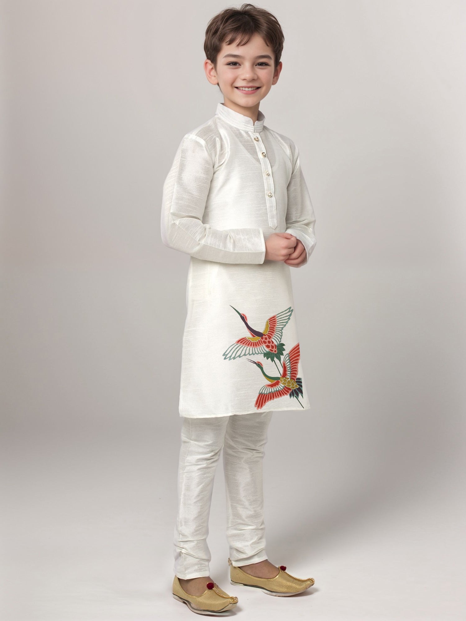 Enhance your child's festive wardrobe with this elegant white kurta and pyjama set. Crafted from premium Dupion fabric, the kurta features a stylish asymmetrical cut with intricate button details and a subtle printed design, making it a perfect choice for special occasions, weddings, and cultural celebrations.