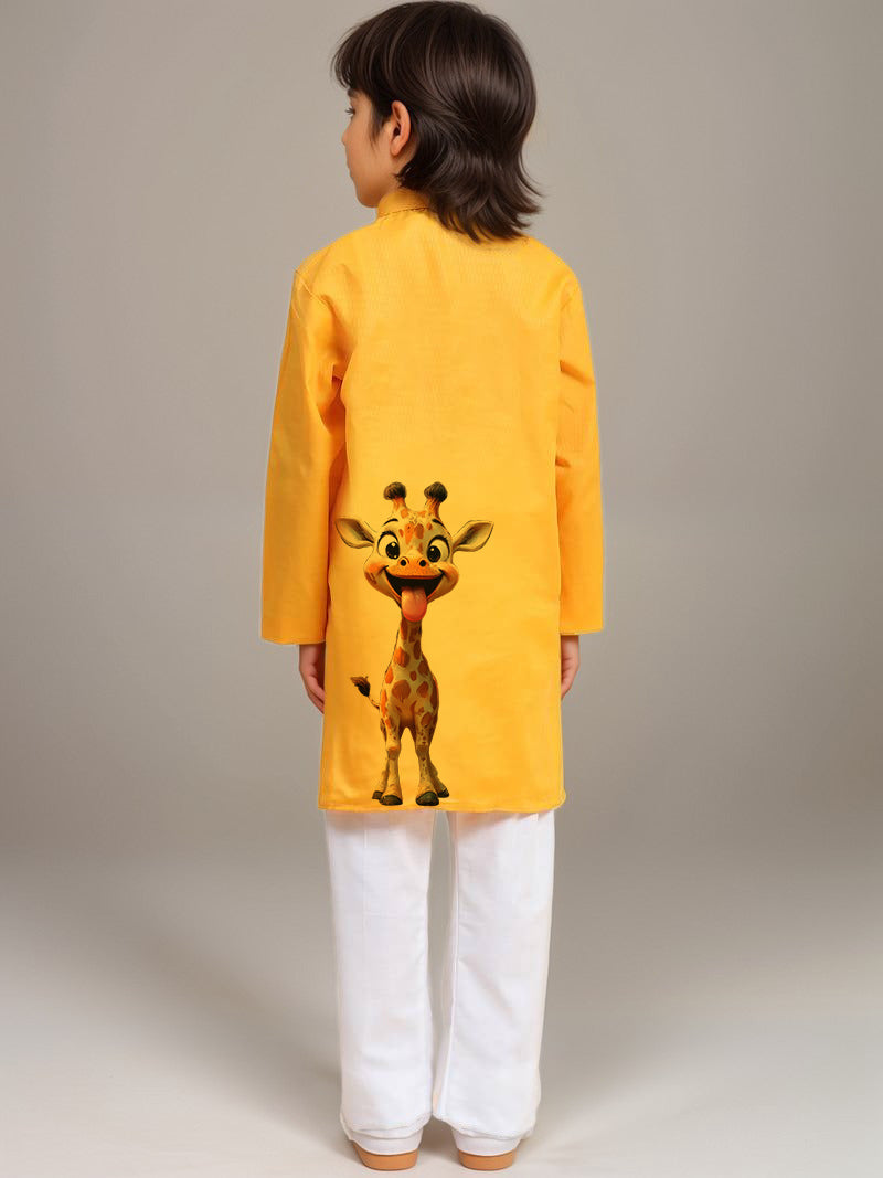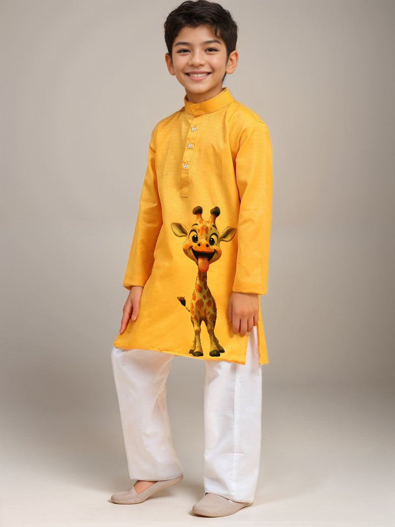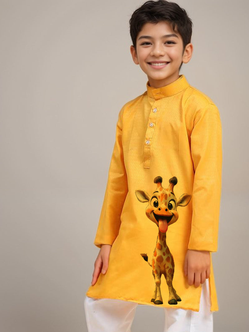 Brighten up your child's ethnic wardrobe with this vibrant yellow kurta and white pajama set. Crafted from luxurious Cotton fabric, the kurta features a stylish printed design, adding a touch of charm to traditional wear. Perfect for festive occasions, cultural celebrations, and family gatherings.