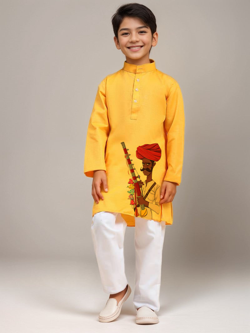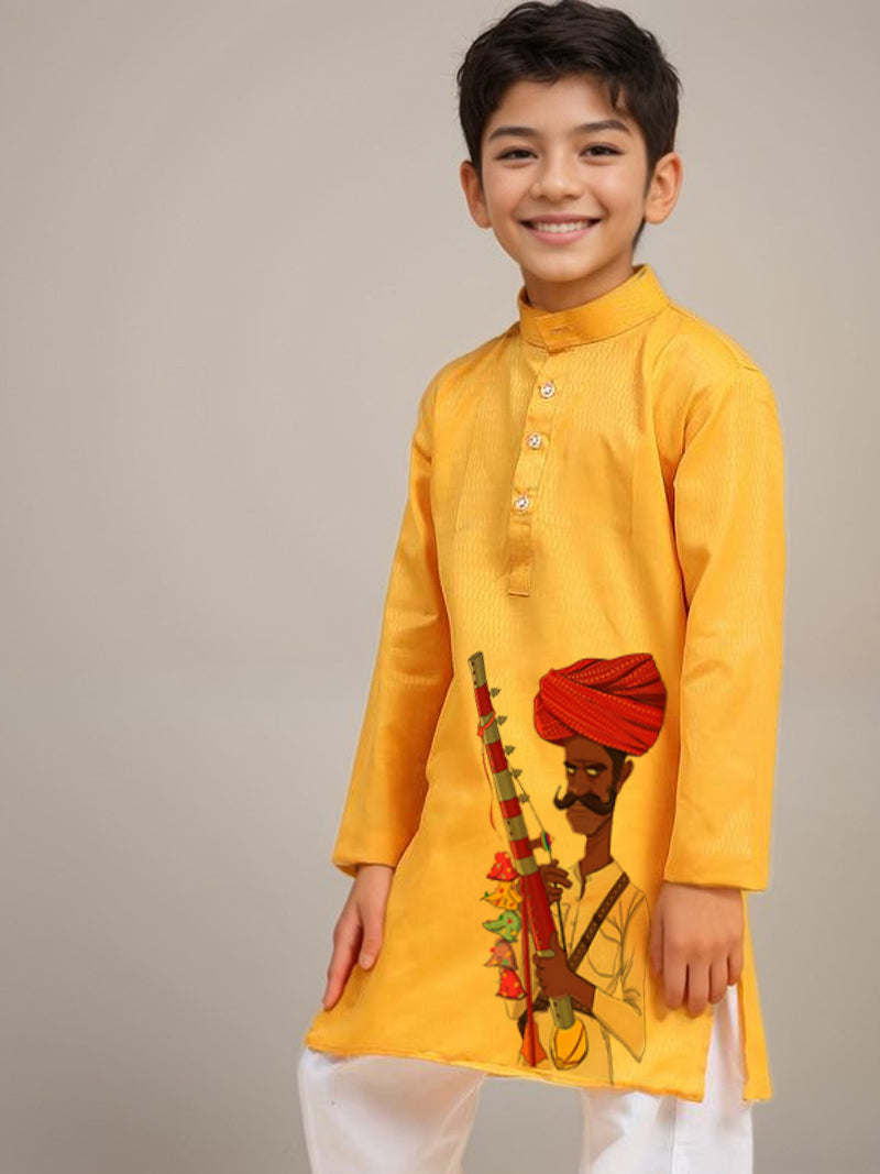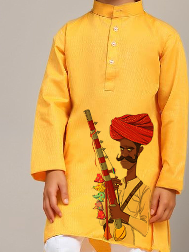 Brighten up your child's ethnic wardrobe with this vibrant yellow kurta and white pajama set. Crafted from luxurious Cotton fabric, the kurta features a stylish printed design, adding a touch of charm to traditional wear. Perfect for festive occasions, cultural celebrations, and family gatherings.