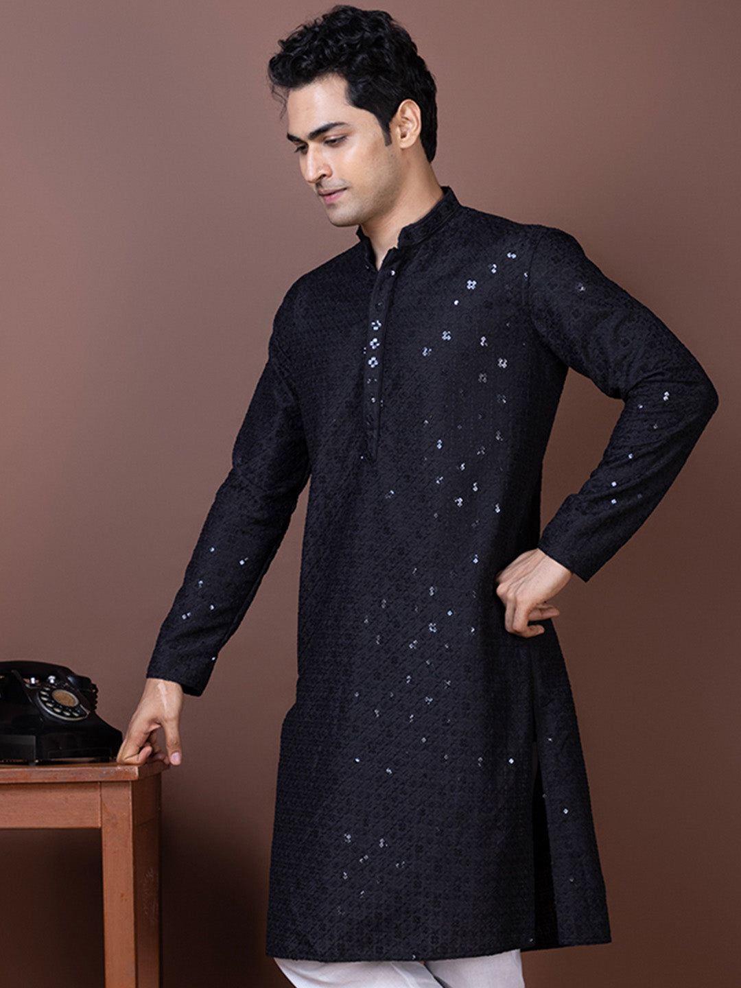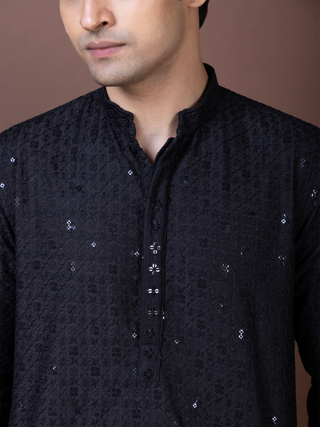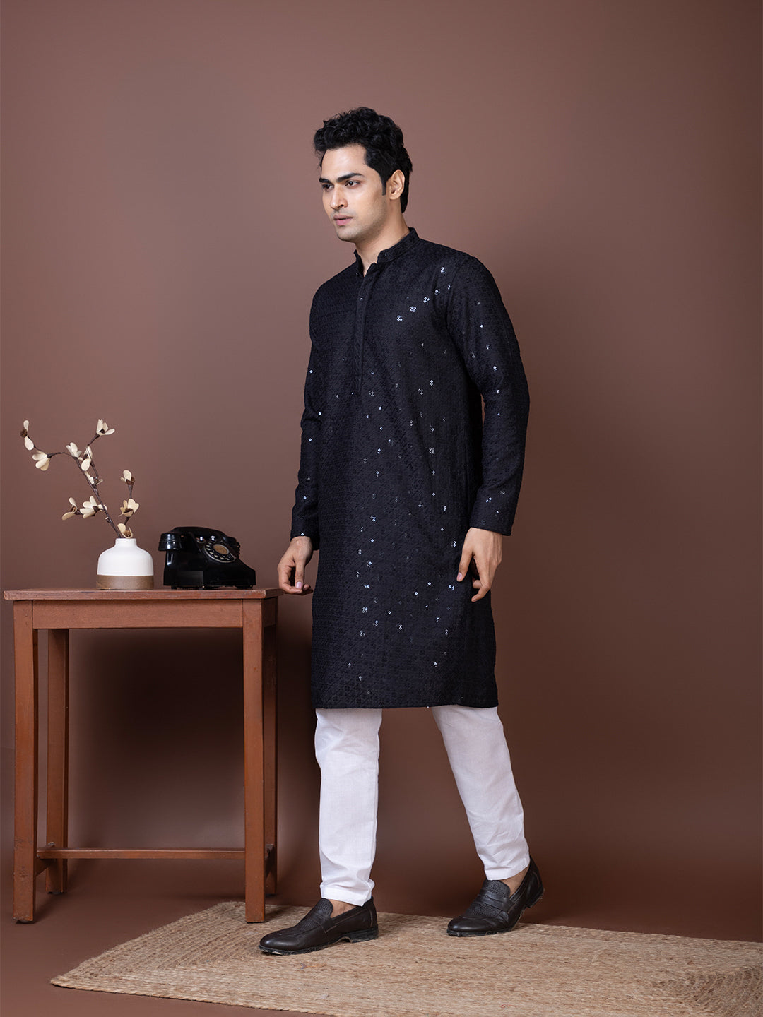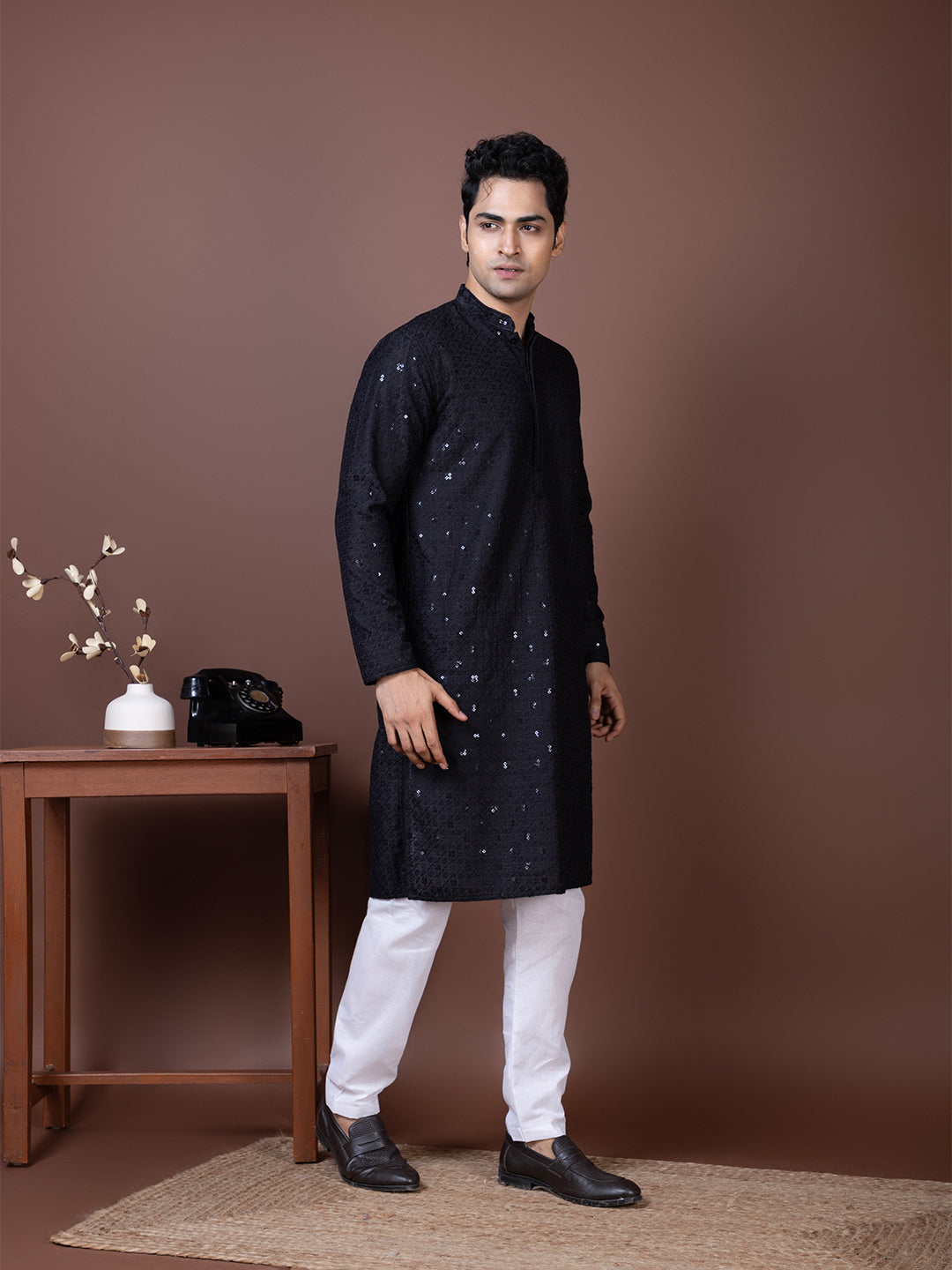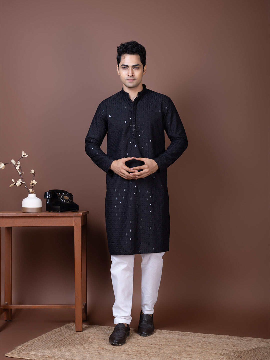 Elevate your style quotient with this black embellished kurta, designed for modern elegance and timeless charm. Perfect for formal occasions, evening events, and traditional gatherings, this kurta ensures both comfort and sophistication. The sleek design makes it a versatile addition to your wardrobe.