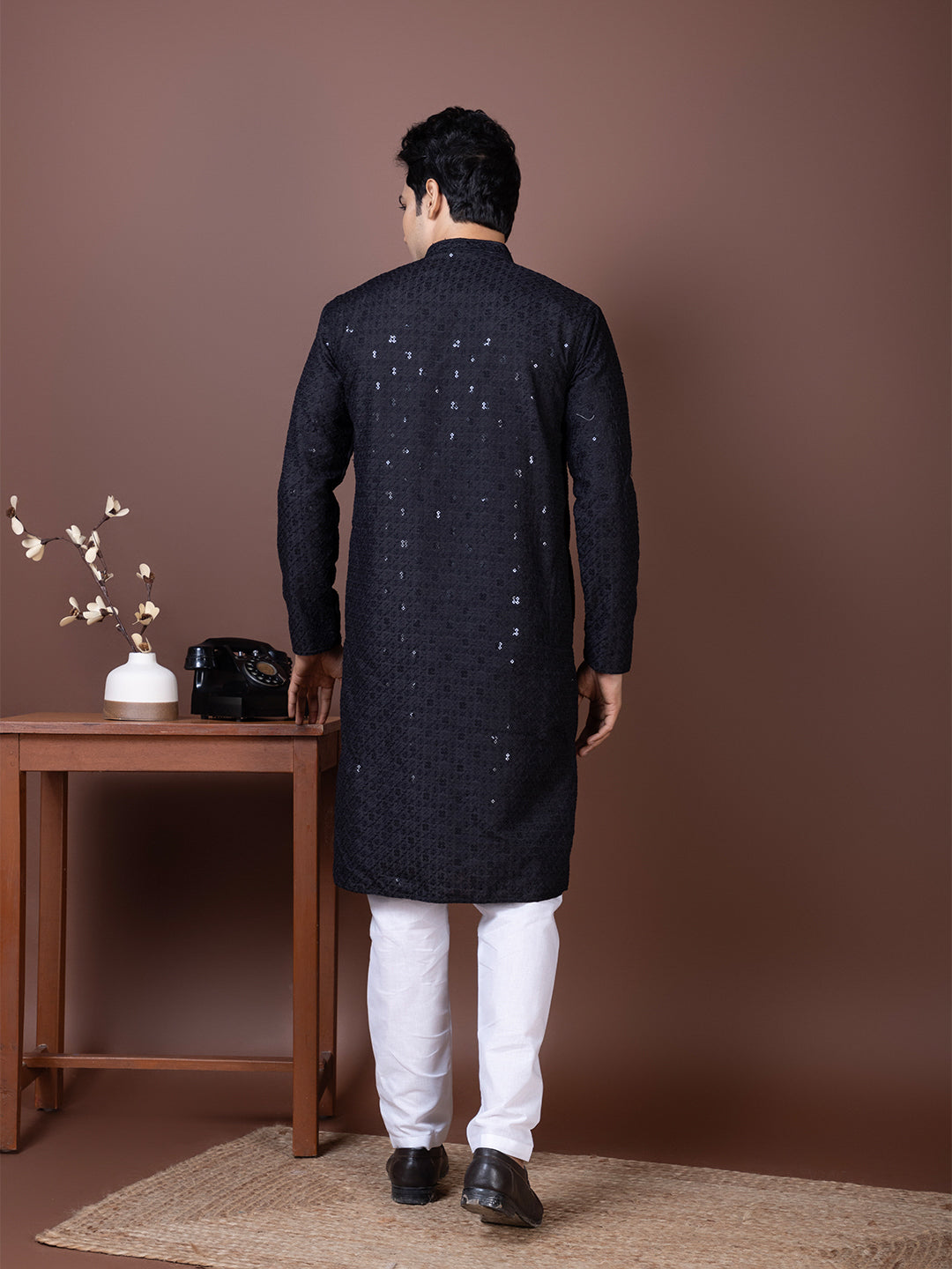 Pair this black cotton kurta with white churidar or trousers for a bold yet sophisticated ethnic look. Perfectly suited for evening parties and traditional celebrations.