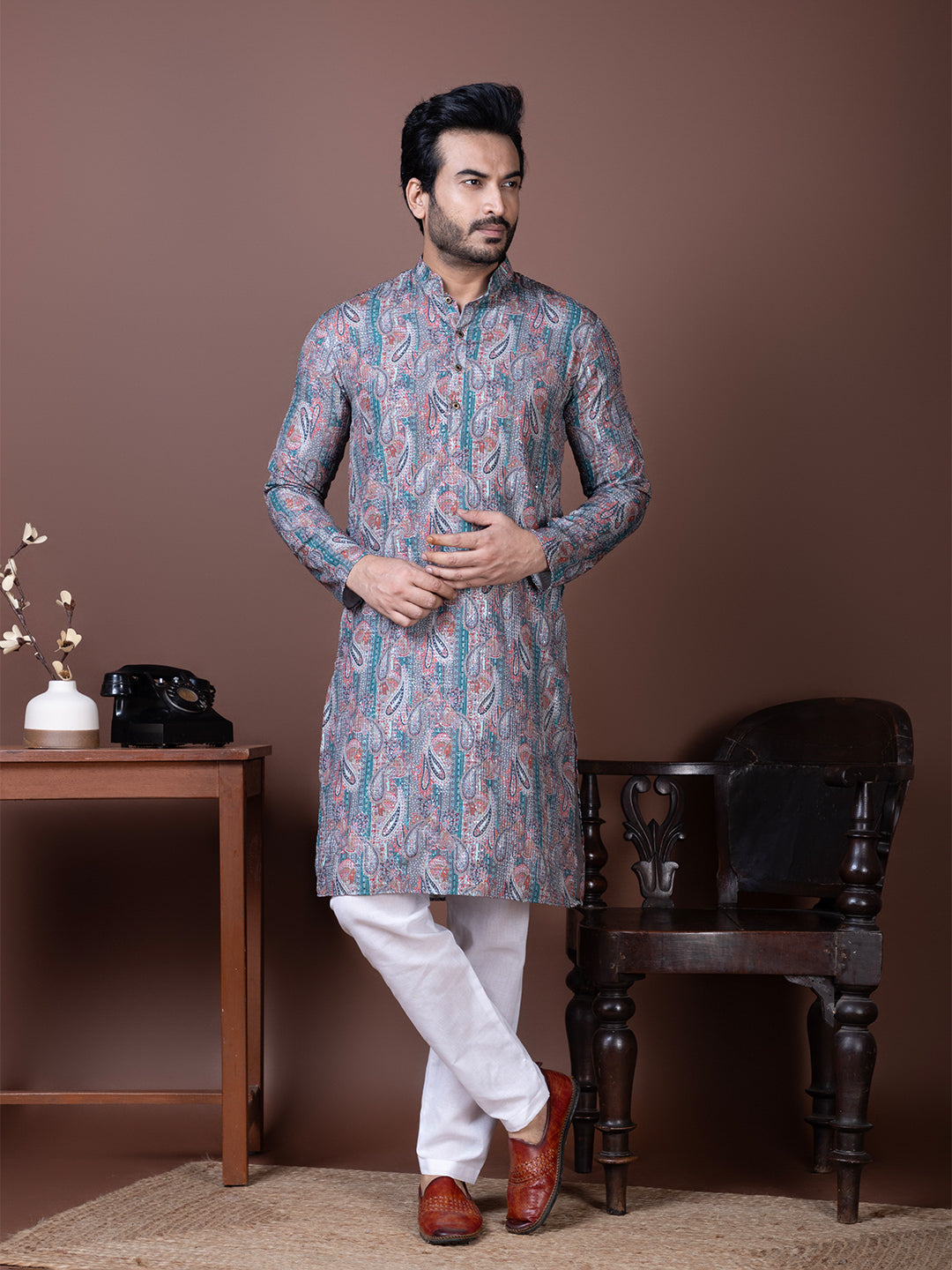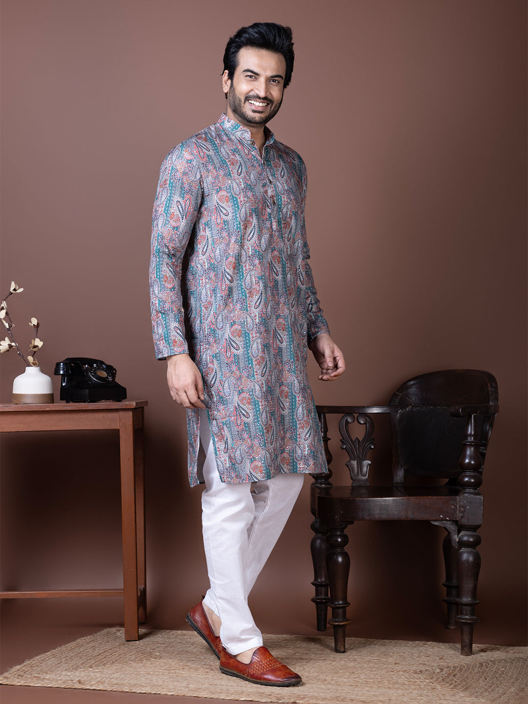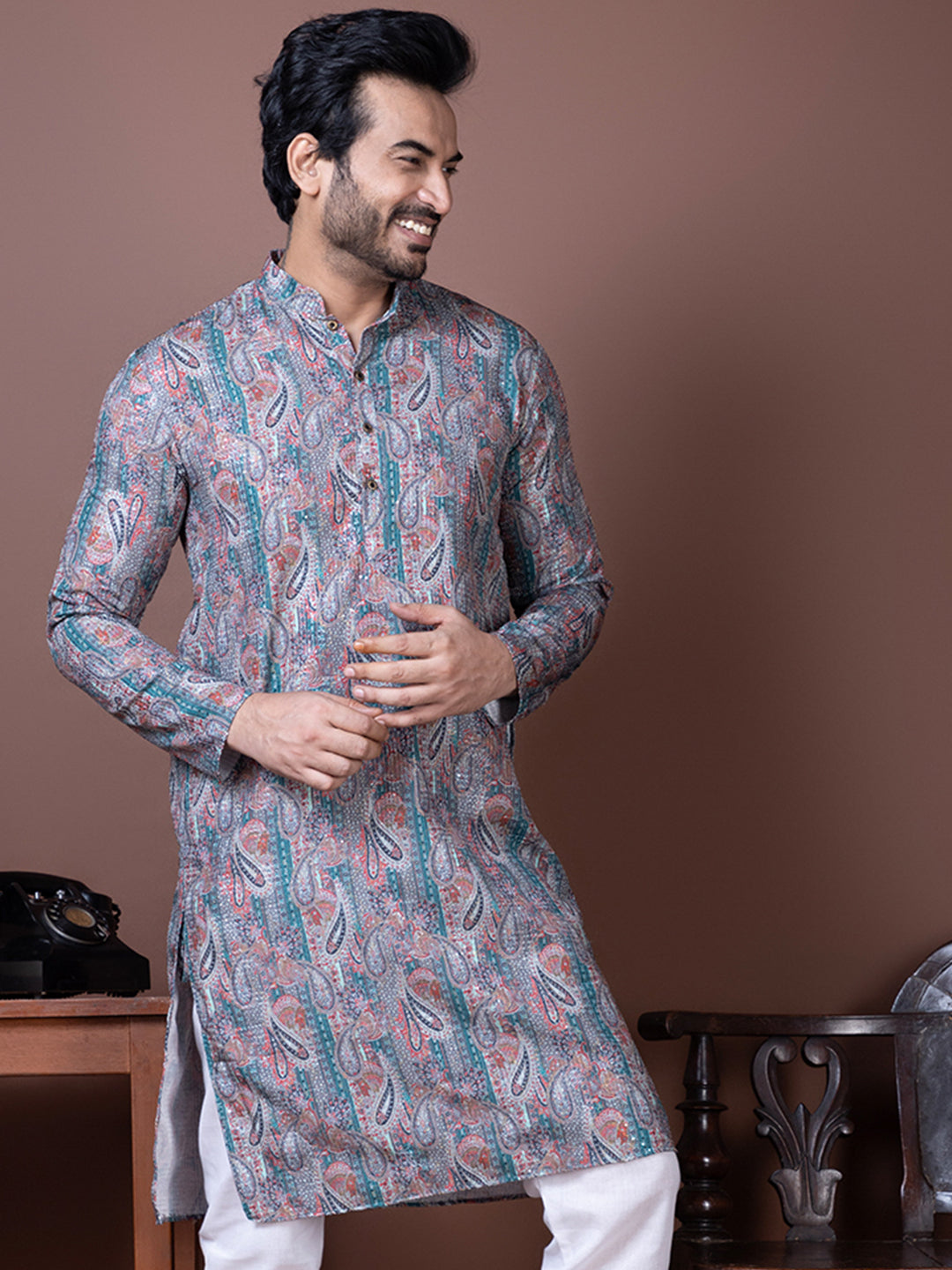 Pair this Multi kurta with white churidar or slim-fit trousers for a timeless ethnic look. Complete the outfit with leather loafers or traditional juttis to make a bold style statement.