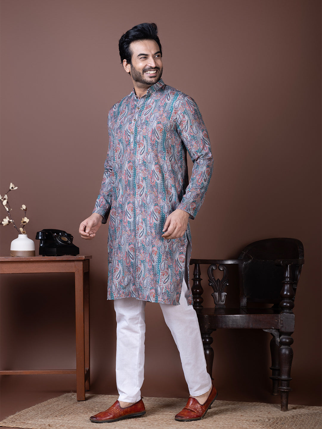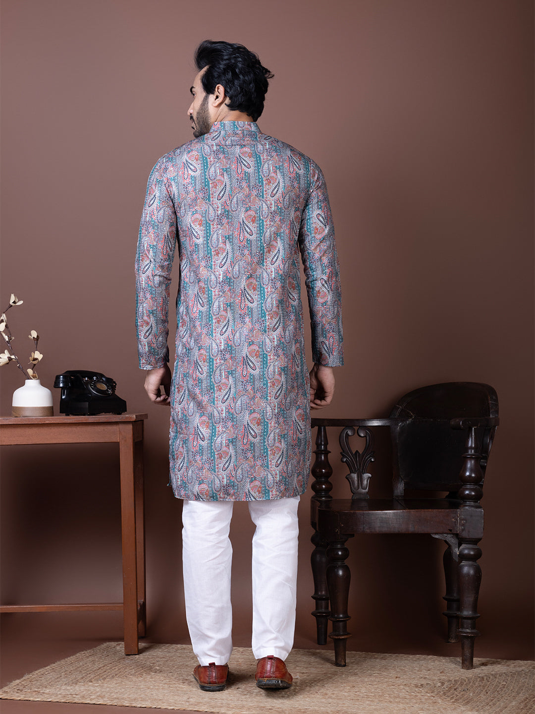 "Elevate your ethnic style with this Multi cotton kurta and white pyjama set. Designed for comfort and elegance, it features a subtle print and a mandarin collar, perfect for festive and cultural occasions."