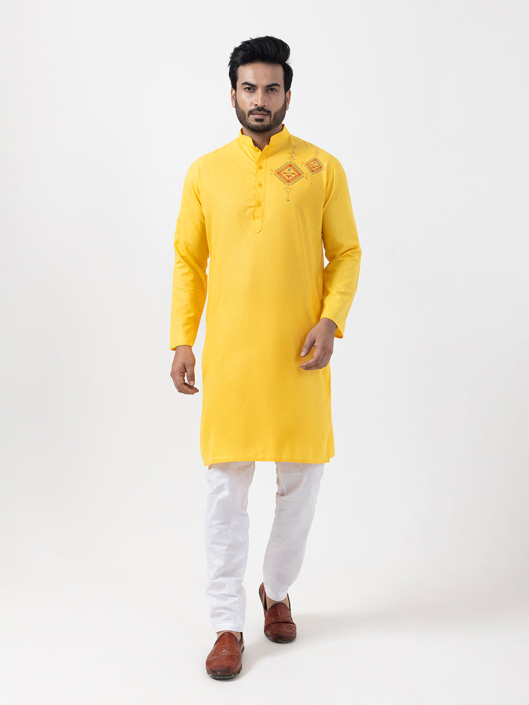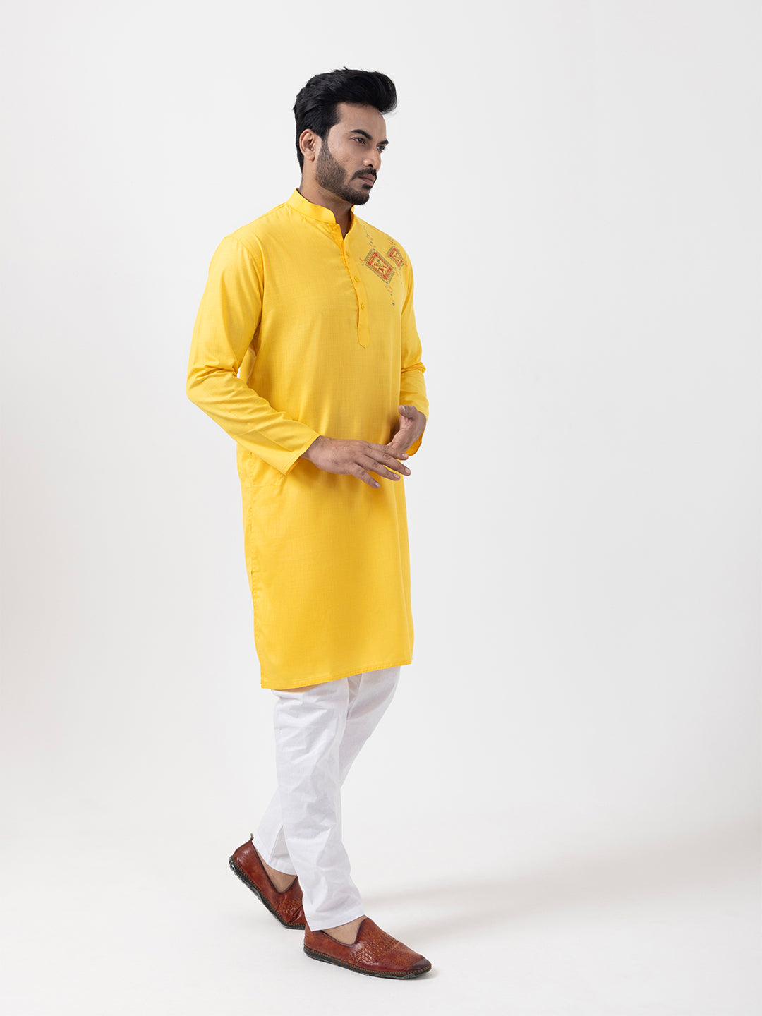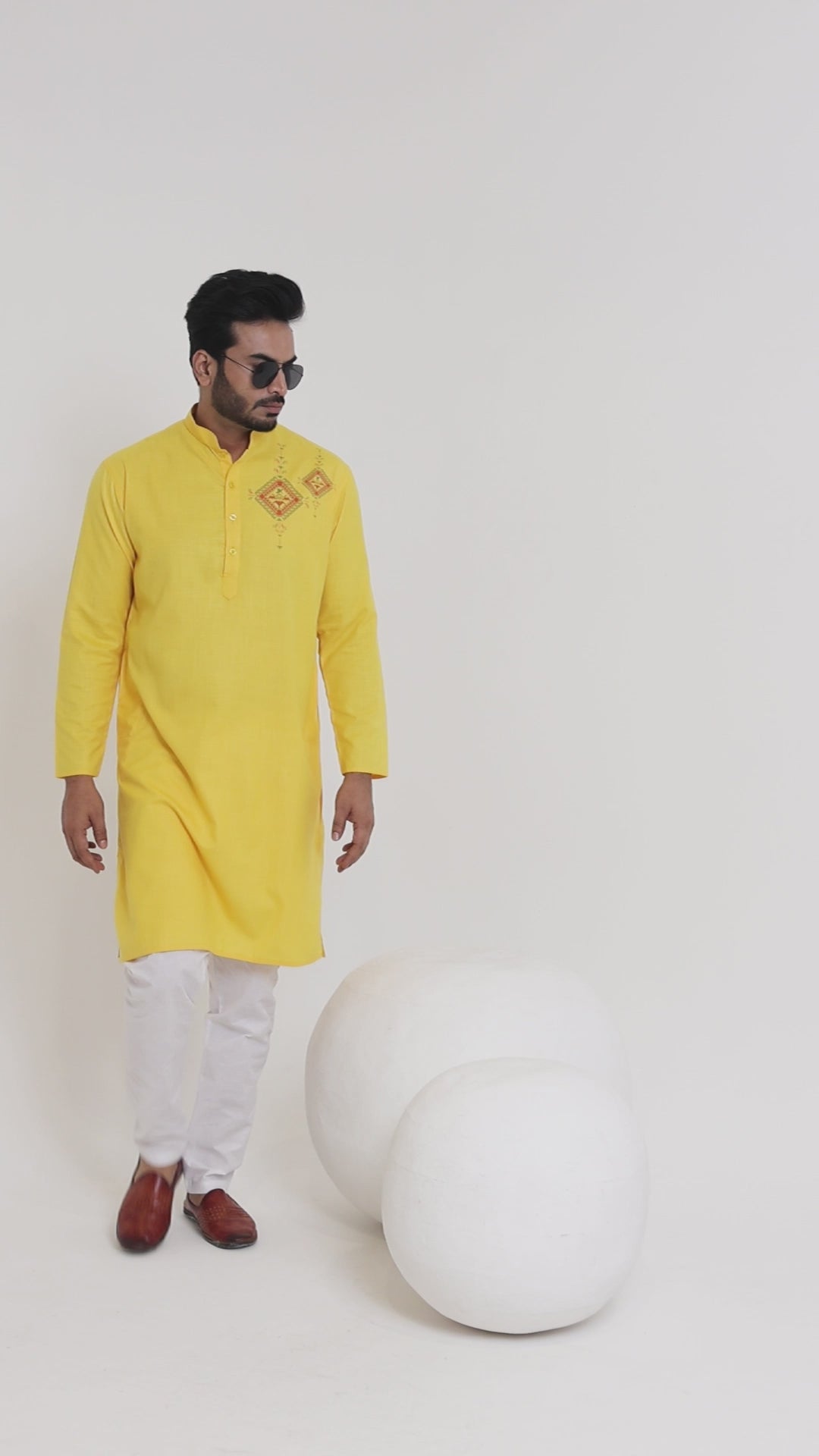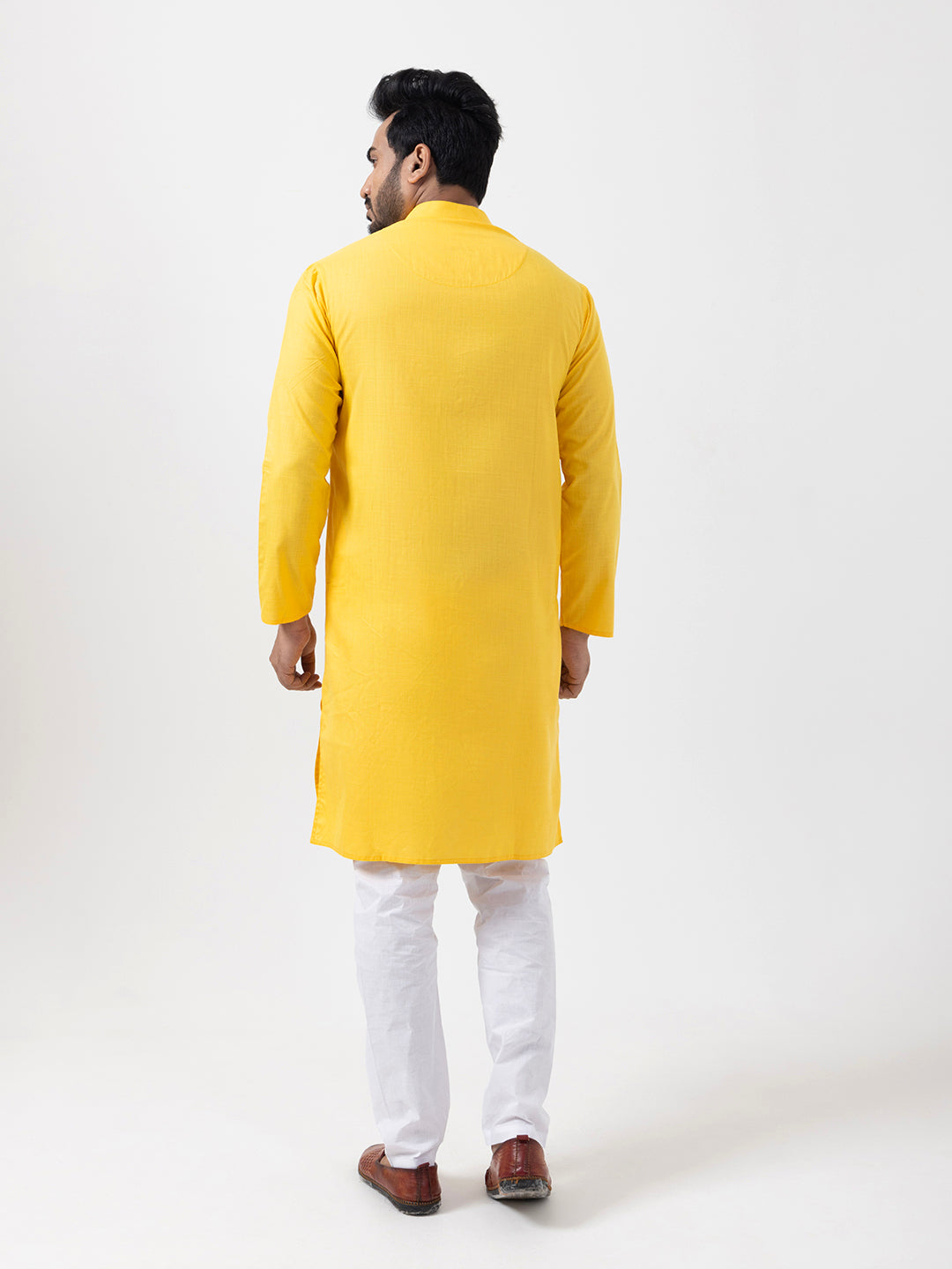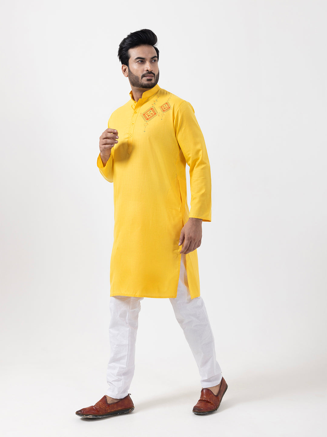 Pair this yellow kurta with white churidar or slim-fit trousers for a timeless ethnic look. Complete the outfit with leather loafers or traditional juttis to make a bold style statement.