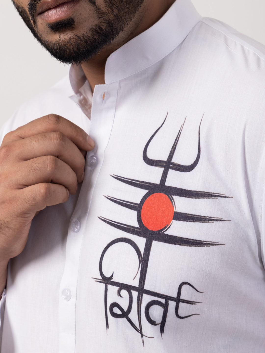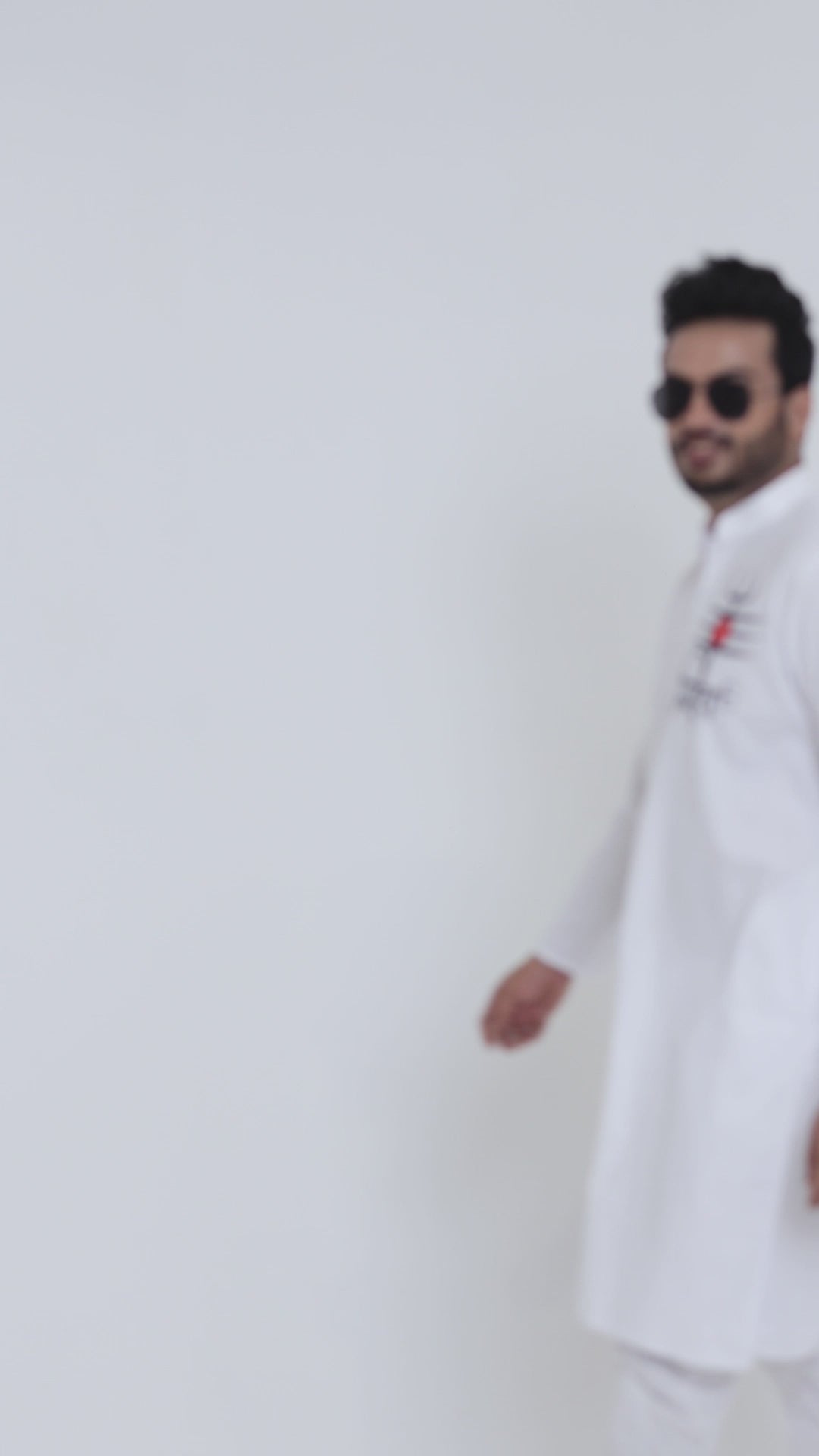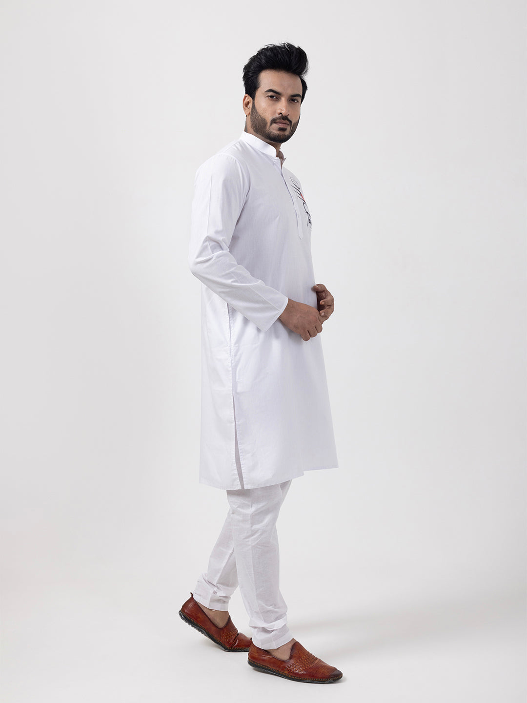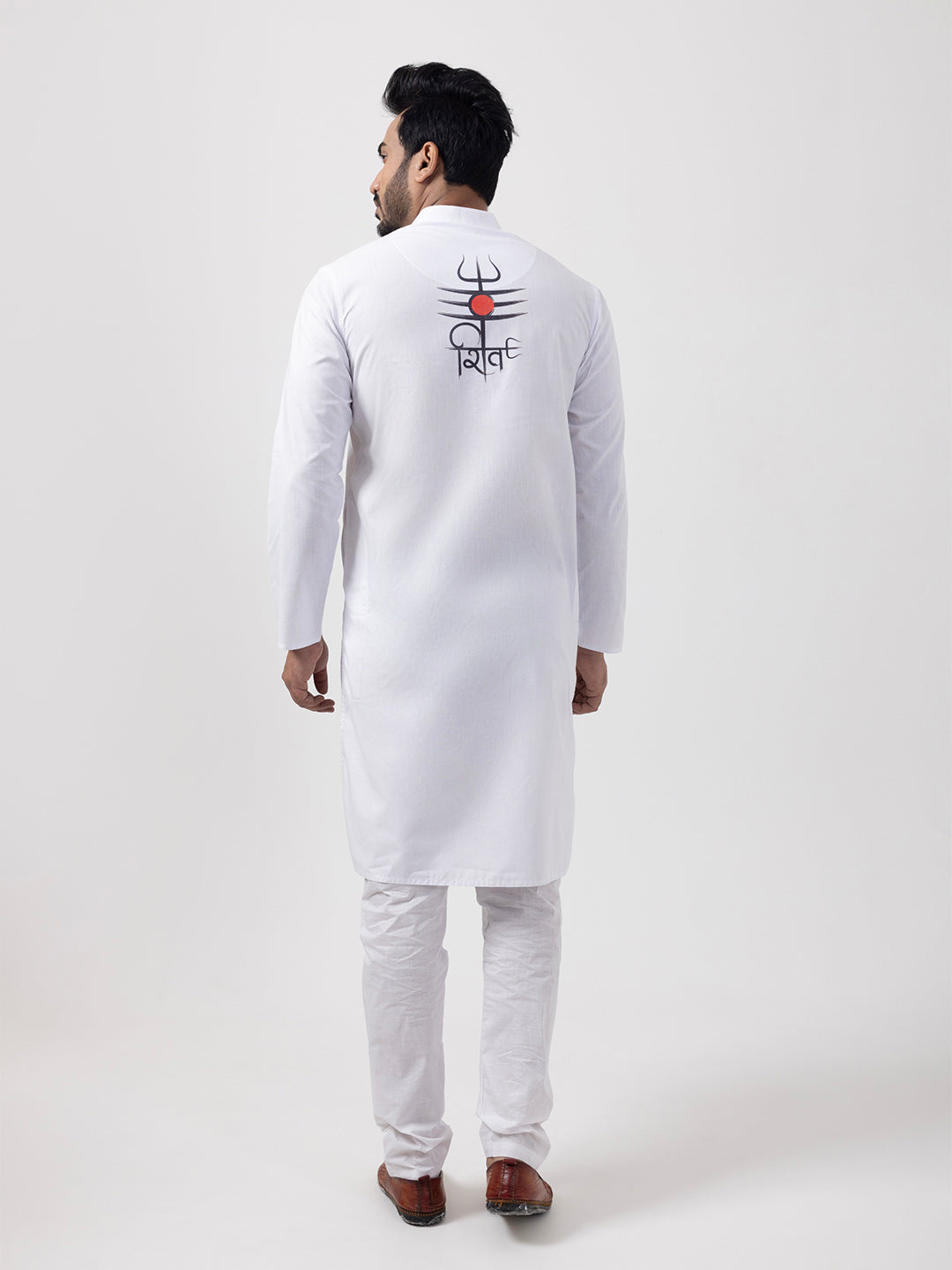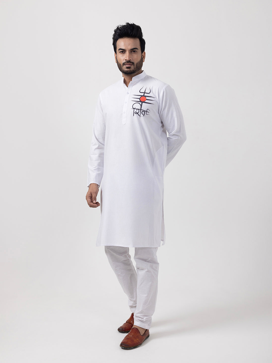 "Elevate your ethnic style with this White cotton kurta and white pyjama set. Designed for comfort and elegance, it features a subtle print and a mandarin collar, perfect for festive and cultural occasions."